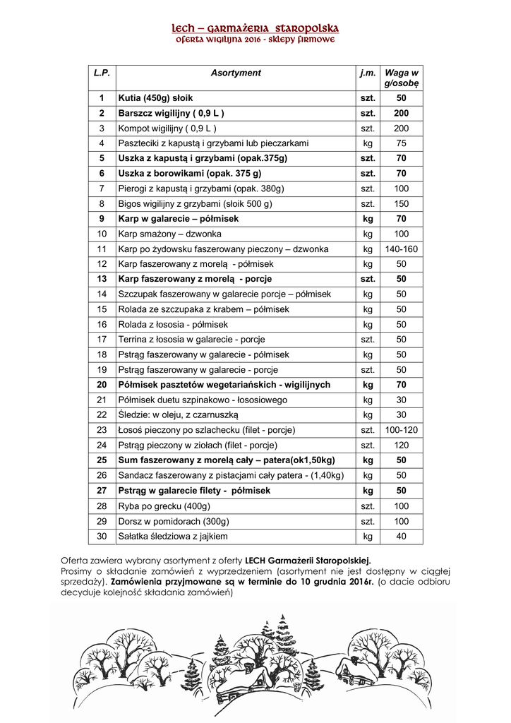 LECH – GARMAżERIA STAROPOLSKA OFERTA WIGILIJNA 2016 - Sklepy firmowe L.P. Asortyment j.m. Waga w g/osobę 1 Kutia (450g) słoik szt. 50 2 Barszcz wigilijny ( 0,9 L ) szt. 200 3 Kompot wigilijny ( 0,9 L ) szt. 200 4 Paszteciki z kapustą i grzybami lub pieczarkami kg 75 5 Uszka z kapustą i grzybami (opak.375g) szt. 70 6 Uszka z borowikami (opak. 375 g) szt. 70 7 Pierogi z kapustą i grzybami (opak. 380g) szt. 100 8 Bigos wigilijny z grzybami (słoik 500 g) szt. 150 9 Karp w galarecie – półmisek kg 70 10 Karp smażony – dzwonka kg 100 11 Karp po żydowsku faszerowany pieczony – dzwonka kg 140-160 12 Karp faszerowany z morelą - półmisek kg 50 13 Karp faszerowany z morelą - porcje szt. 50 14 Szczupak faszerowany w galarecie porcje – półmisek kg 50 15 Rolada ze szczupaka z krabem – półmisek kg 50 16 Rolada z łososia - półmisek kg 50 17 Terrina z łososia w galarecie - porcje szt. 50 18 Pstrąg faszerowany w galarecie - półmisek kg 50 19 Pstrąg faszerowany w galarecie - porcje szt. 50 20 Półmisek pasztetów wegetariańskich - wigilijnych kg 70 21 Półmisek duetu szpinakowo - łososiowego kg 30 22 Śledzie: w oleju, z czarnuszką kg 30 23 Łosoś pieczony po szlachecku (filet - porcje) szt. 100-120 24 Pstrąg pieczony w ziołach (filet - porcje) szt. 120 25 Sum faszerowany z morelą cały – patera(ok1,50kg) kg 50 26 Sandacz faszerowany z pistacjami cały patera - (1,40kg) kg 50 27 Pstrąg w galarecie filety - półmisek kg 50 28 Ryba po grecku (400g) szt. 100 29 Dorsz w pomidorach (300g) szt. 100 30 Sałatka śledziowa z jajkiem kg 40 Oferta zawiera wybrany asortyment z oferty LECH Garmażerii Staropolskiej. Prosimy o składanie zamówień z wyprzedzeniem (asortyment nie jest dostępny w ciągłej sprzedaży). Zamówienia przyjmowane są w terminie do 10 grudnia 2016r. (o dacie odbioru decyduje kolejność składania zamówień)