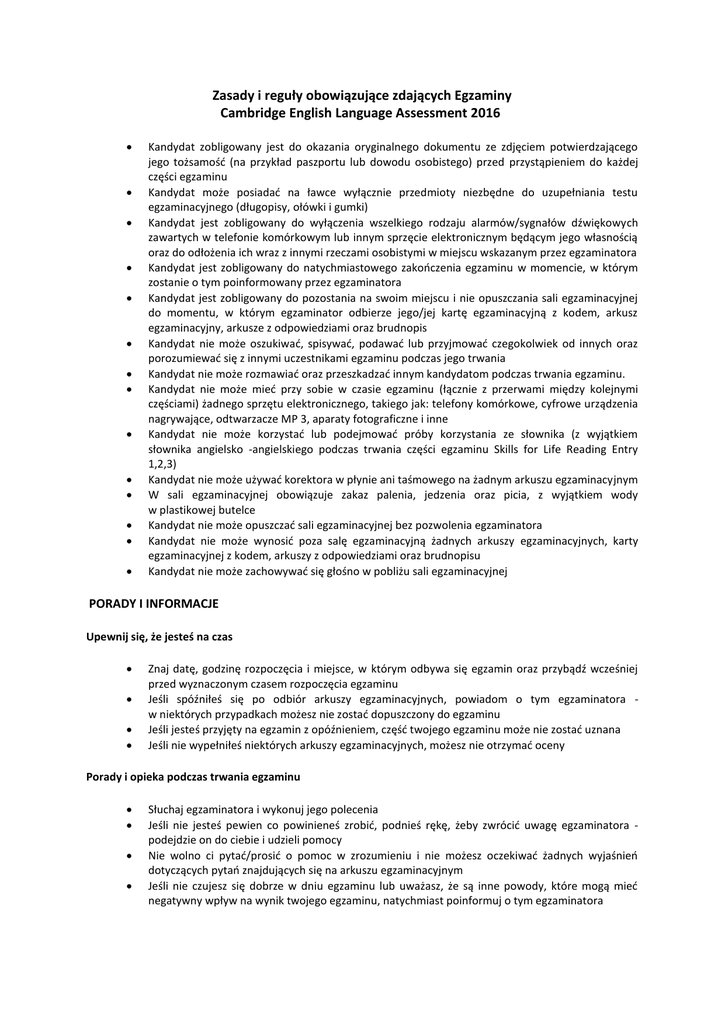 Zasady i reguły obowiązujące zdających Egzaminy Cambridge English Language Assessment 2016 Kandydat zobligowany jest do okazania oryginalnego dokumentu ze zdjęciem potwierdzającego jego tożsamość (na przykład paszportu lub dowodu osobistego) przed przystąpieniem do każdej części egzaminu Kandydat może posiadać na ławce wyłącznie przedmioty niezbędne do uzupełniania testu egzaminacyjnego (długopisy, ołówki i gumki) Kandydat jest zobligowany do wyłączenia wszelkiego rodzaju alarmów/sygnałów dźwiękowych zawartych w telefonie komórkowym lub innym sprzęcie elektronicznym będącym jego własnością oraz do odłożenia ich wraz z innymi rzeczami osobistymi w miejscu wskazanym przez egzaminatora Kandydat jest zobligowany do natychmiastowego zakończenia egzaminu w momencie, w którym zostanie o tym poinformowany przez egzaminatora Kandydat jest zobligowany do pozostania na swoim miejscu i nie opuszczania sali egzaminacyjnej do momentu, w którym egzaminator odbierze jego/jej kartę egzaminacyjną z kodem, arkusz egzaminacyjny, arkusze z odpowiedziami oraz brudnopis Kandydat nie może oszukiwać, spisywać, podawać lub przyjmować czegokolwiek od innych oraz porozumiewać się z innymi uczestnikami egzaminu podczas jego trwania Kandydat nie może rozmawiać oraz przeszkadzać innym kandydatom podczas trwania egzaminu. Kandydat nie może mieć przy sobie w czasie egzaminu (łącznie z przerwami między kolejnymi częściami) żadnego sprzętu elektronicznego, takiego jak: telefony komórkowe, cyfrowe urządzenia nagrywające, odtwarzacze MP 3, aparaty fotograficzne i inne Kandydat nie może korzystać lub podejmować próby korzystania ze słownika (z wyjątkiem słownika angielsko -angielskiego podczas trwania części egzaminu Skills for Life Reading Entry 1,2,3) Kandydat nie może używać korektora w płynie ani taśmowego na żadnym arkuszu egzaminacyjnym W sali egzaminacyjnej obowiązuje zakaz palenia, jedzenia oraz picia, z wyjątkiem wody w plastikowej butelce Kandydat nie może opuszczać sali egzaminacyjnej bez pozwolenia egzaminatora Kandydat nie może wynosić poza salę egzaminacyjną żadnych arkuszy egzaminacyjnych, karty egzaminacyjnej z kodem, arkuszy z odpowiedziami oraz brudnopisu Kandydat nie może zachowywać się głośno w pobliżu sali egzaminacyjnej PORADY I INFORMACJE Upewnij się, że jesteś na czas Znaj datę, godzinę rozpoczęcia i miejsce, w którym odbywa się egzamin oraz przybądź wcześniej przed wyznaczonym czasem rozpoczęcia egzaminu Jeśli spóźniłeś się po odbiór arkuszy egzaminacyjnych, powiadom o tym egzaminatora w niektórych przypadkach możesz nie zostać dopuszczony do egzaminu Jeśli jesteś przyjęty na egzamin z opóźnieniem, część twojego egzaminu może nie zostać uznana Jeśli nie wypełniłeś niektórych arkuszy egzaminacyjnych, możesz nie otrzymać oceny Porady i opieka podczas trwania egzaminu Słuchaj egzaminatora i wykonuj jego polecenia Jeśli nie jesteś pewien co powinieneś zrobić, podnieś rękę, żeby zwrócić uwagę egzaminatora podejdzie on do ciebie i udzieli pomocy Nie wolno ci pytać/prosić o pomoc w zrozumieniu i nie możesz oczekiwać żadnych wyjaśnień dotyczących pytań znajdujących się na arkuszu egzaminacyjnym Jeśli nie czujesz się dobrze w dniu egzaminu lub uważasz, że są inne powody, które mogą mieć negatywny wpływ na wynik twojego egzaminu, natychmiast poinformuj o tym egzaminatora Informacje dotyczące papierowych arkuszy egzaminacyjnych Czytaj uważnie i wykonuj polecenia umieszczone na arkuszach egzaminacyjnych oraz na arkuszach odpowiedzi Natychmiast poinformuj egzaminatora jeśli: o twoje dane osobowe umieszczone na arkuszu z odpowiedziami są błędne o uważasz, że otrzymałeś niewłaściwy arkusz egzaminacyjny o arkusz egzaminacyjny jest niekompletny lub nieczytelny Informacje dotyczące arkuszy egzaminacyjnych umieszczonych na ekranie komputera Czytaj uważnie i wykonuj polecenia umieszczone na ekranie komputera Poinformuj egzaminatora jeśli: o twoje dane osobowe umieszczone na ekranie są błędne o uważasz, że otrzymałeś niewłaściwy test o pytania na ekranie komputera są niekompletne lub słabo widoczne o twoje słuchawki nie działają OSTRZEŻENIE PRZED DYSKWALIFIKACJĄ Jeśli oszukujesz, stosujesz nieuczciwe praktyki lub/i łamiesz obowiązujące zasady, wówczas zostaniesz zdyskwalifikowany!