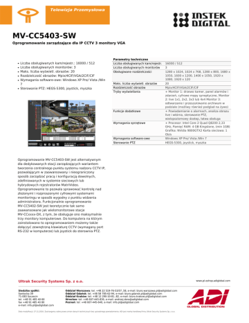 MV-CC5403-SW Oprogramowanie zarządzające dla IP CCTV 3 monitory VGA ● ● ● ● ● ● Liczba obsługiwanych kam/rejestr.: 16000 / 512 Liczba obsługiwanych monitorów: 3 Maks. liczba wyświetl. obrazów: 20 Rozdzielczość obrazów: Mpix/4CIF/VGA/2CIF/CIF Wymagania software-owe: Windows XP Pro/ Vista /Win 7 Sterowanie PTZ: HEGS-5300, joystick, myszka Parametry techniczne Liczba obsługiwanych kam/rejestr. Liczba obsługiwanych monitorów Obsługiwane rozdzielczości Maks. liczba wyświetl. obrazów Rozdzielczość obrazów Tryby wyświetlania Funkcje dodatkowe Wymagania sprzętowe Wymagania software-owe Sterowanie PTZ 16000 / 512 3 1280 x 1024, 1024 x 768, 1280 x 800, 1680 x 1050, 1600 x 1200, 1400 x 1050, 1920 x 1080, 1920 x 120 20 Mpix/4CIF/VGA/2CIF/CIF + Monitor 1: drzewo kamer, panel alarmów i zdarzeń, cyfrowe mapy synoptyczne, Monitor 2: live 1x1, 2x2, 3x3 lub 4x4 Monitor 3: odtwarzanie i przeszukiwanie archiwum w podziale (możliwy również podglad na żywo) + Powiadamianie o alarmach, analiza obrazu live i wtórna, sterowanie PTZ, wielopoziomowy dostep, łatwa obsługa + Procesor: Intel Core 2 Quad Q8200 2,33 GHz, Pamięć RAM: 4 GB Kingstone, (min 1GB) Grafika: NVidia 9800GTX2 Karta sieciowa: 1 Gb/s Windows XP Pro/ Vista /Win 7 HEGS-5300, joystick, myszka Oprogramowanie MV-CC5403-SW jest alternatywnym dla dedykowanych stacji zarządzających wariantem tworzenia centralnego punktu systemu nadzoru CCTV IP, pozwalającym w zaawansowany i nieograniczony sposób zarządzać pracą i konfiguracją dowolnych, zdefiniowanych w systemie sieciowych lub hybrydowych rejestratorów MatriVideo. Oprogramowanie to pozwala sprawować kontrolę nad złożonymi i rozproszonymi cyfrowymi systemami monitoringu w sposób wygodny z punktu widzenia administratora. Funkcjonalnie oprogramowanie MV-CC5402-SW jest teoretycznie tak samo zaawansowane jak wielomonitorowe stacje MV-CCxxxx-DX, z tym, że obsługuje ono maksymalnie trzy monitory komputerowe. Do komputera na którym zainstalowano to oprogramowaniem możemy także dołączyć zewnętrzną klawiaturę CCTV (wymagany port RS-232 w komputerze) lub joystick do sterownia PTZ. Ultrak Security Systems Sp. z o.o. Siedziba spółki: Santocka 39 71-083 Szczecin tel. +48 91 485 40 60 fax +48 91 485 40 80 e-mail: [email protected] Oddział Warszawa: tel. +48 22 519-76-53/57..58, e-mail: [email protected] Oddział Gdańsk: tel. +48 58 785-62-94, e-mail: [email protected] Oddział Kraków: tel: +48 12 290-10-81..82, e-mail: [email protected] Wrocław: tel: +48 607-445-836, e-mail: [email protected] Poznań: tel: +48 607-445-640, e-mail: [email protected] Data modyfikacji: 27.11.2016. Zastrzegamy sobie prawo zmian danych technicznych bez uprzedniego powiadomienia. ADI jest marką handlową firmy Ultrak Security Systems Sp. z o.o. www.pl-eshop.adiglobal.com