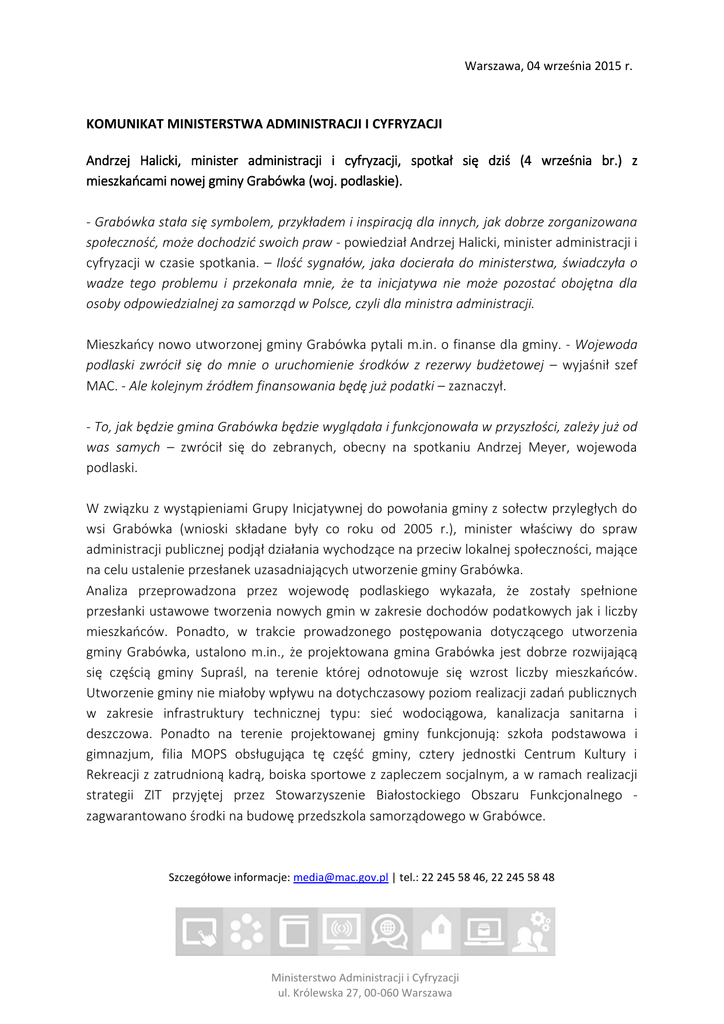 Warszawa, 04 września 2015 r. KOMUNIKAT MINISTERSTWA ADMINISTRACJI I CYFRYZACJI Andrzej Halicki, minister administracji i cyfryzacji, spotkał się dziś (4 września br.) z mieszkańcami nowej gminy Grabówka (woj. podlaskie). - Grabówka stała się symbolem, przykładem i inspiracją dla innych, jak dobrze zorganizowana społeczność, może dochodzić swoich praw - powiedział Andrzej Halicki, minister administracji i cyfryzacji w czasie spotkania. – Ilość sygnałów, jaka docierała do ministerstwa, świadczyła o wadze tego problemu i przekonała mnie, że ta inicjatywa nie może pozostać obojętna dla osoby odpowiedzialnej za samorząd w Polsce, czyli dla ministra administracji. Mieszkańcy nowo utworzonej gminy Grabówka pytali m.in. o finanse dla gminy. - Wojewoda podlaski zwrócił się do mnie o uruchomienie środków z rezerwy budżetowej – wyjaśnił szef MAC. - Ale kolejnym źródłem finansowania będę już podatki – zaznaczył. - To, jak będzie gmina Grabówka będzie wyglądała i funkcjonowała w przyszłości, zależy już od was samych – zwrócił się do zebranych, obecny na spotkaniu Andrzej Meyer, wojewoda podlaski. W związku z wystąpieniami Grupy Inicjatywnej do powołania gminy z sołectw przyległych do wsi Grabówka (wnioski składane były co roku od 2005 r.), minister właściwy do spraw administracji publicznej podjął działania wychodzące na przeciw lokalnej społeczności, mające na celu ustalenie przesłanek uzasadniających utworzenie gminy Grabówka. Analiza przeprowadzona przez wojewodę podlaskiego wykazała, że zostały spełnione przesłanki ustawowe tworzenia nowych gmin w zakresie dochodów podatkowych jak i liczby mieszkańców. Ponadto, w trakcie prowadzonego postępowania dotyczącego utworzenia gminy Grabówka, ustalono m.in., że projektowana gmina Grabówka jest dobrze rozwijającą się częścią gminy Supraśl, na terenie której odnotowuje się wzrost liczby mieszkańców. Utworzenie gminy nie miałoby wpływu na dotychczasowy poziom realizacji zadań publicznych w zakresie infrastruktury technicznej typu: sieć wodociągowa, kanalizacja sanitarna i deszczowa. Ponadto na terenie projektowanej gminy funkcjonują: szkoła podstawowa i gimnazjum, filia MOPS obsługująca tę część gminy, cztery jednostki Centrum Kultury i Rekreacji z zatrudnioną kadrą, boiska sportowe z zapleczem socjalnym, a w ramach realizacji strategii ZIT przyjętej przez Stowarzyszenie Białostockiego Obszaru Funkcjonalnego zagwarantowano środki na budowę przedszkola samorządowego w Grabówce. Szczegółowe informacje: [email protected] | tel.: 22 245 58 46, 22 245 58 48 Ministerstwo Administracji i Cyfryzacji ul. Królewska 27, 00-060 Warszawa Minister Administracji i Cyfryzacji, biorąc pod uwagę wymienione przesłanki, a przede wszystkim stanowisko mieszkańców projektowanej gminy Grabówka, wyrażone w przeprowadzonym referendum, pozytywnie zarekomendował Radzie Ministrów sprawę utworzenia gminy Grabówka z dotychczasowego obszaru gminy Supraśl. Na posiedzeniu 28 lipca 2015 r. Rada Ministrów podzieliła stanowisko Ministra Administracji i Cyfryzacji i podjęła decyzję w zakresie utworzenia z dniem 1 stycznia 2016 r. gminy Grabówka. Obszar gminy Grabówka obejmuje obręby ewidencyjne: Grabówka, Henrykowo, Sobolewo, Sowlany i Zaścianki, o łącznej powierzchni 6 464, 17 ha. Siedzibą władz gminy Grabówka jest miejscowość Sobolewo. Zgodnie z art. 4e ustawy o samorządzie gminnym, w przypadku tworzenia nowej gminy Prezes Rady Ministrów na wniosek wojewody zgłoszony za pośrednictwem ministra właściwego do spraw administracji publicznej wyznacza pełnomocnika do spraw utworzenia gminy spośród pracowników podległych wojewodzie albo pracowników urzędu gminy, której obszar wchodzi w skład nowo tworzonej gminy. Do czasu utworzenia nowej gminy zadaniem pełnomocnika jest przygotowanie organizacyjne i prawne gminy do wykonywania zadań publicznych. Z dniem utworzenia gminy pełnomocnik przejmuje wykonywanie zadań i kompetencji jej organów do czasu wyboru nowych organów gminy. Obecny na spotkaniu wojewoda podlaski, poinformował mieszkańców Grabówki, że zwrócił się z wnioskiem - za pośrednictwem ministra administracji i cyfryzacji - do Prezesa Rady Ministrów o powołanie na stanowisko pełnomocnika nowo utworzonej gminy Grabówka profesor Ewę Bończak-Kucharczyk. – Bardzo cenię Panią profesor – powiedział szef MAC. – Była mocno zaangażowana w pierwsze komitety obywatelskie w kraju, bez których nie byłoby dobrego samorządu w Polsce. - Liczę na to, że Grabówka stanie się pozytywnym przykładem, w jaki sposób lokalna społeczność, może wpływać na swoją przyszłość – powiedział Andrzej Halicki, minister administracji i cyfryzacji, na koniec spotkania z mieszkańcami nowo utworzonej gminy Grabówka. Artur Koziołek rzecznik prasowy Ministerstwa Administracji i Cyfryzacji Ministerstwo Administracji i Cyfryzacji ul. Królewska 27, 00-060 Warszawa