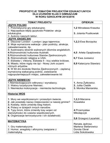 PROPOZYCJE TEMATÓW PROJEKTÓW EDUKACYJNYCH DLA UCZNIÓW KLAS II GIMNAZJUM W ROKU SZKOLNYM 2015/2016 TEMAT PROJEKTU JĘZYK POLSKI 1. Polonistyczne gry edukacyjne. 2. Najczęstsze błędy językowe Polaków- akcja edukacyjna. 3. Autorzy naszych lektur. JĘZYK ANGIELSKI 1. Discover London - Londyn i jego tajemnice. 2. Moje wymarzone wakacje - plan podróży, atrakcje, zakwaterowanie, itp. 3. Ilustrowany słownik wybranych idiomów angielskich. 4.Różnorodność kulturowa Australii. 5.Różnorodność kulturowa Stanów Zjednoczonych. 6. Różnorodność religijna w USA. 7. Elżbieta I, Viktoria, Elżbieta II - trzy wielkie królowe. 8. Miasto, które nigdy nie śpi - Nowy Jork oczami różnych artystów. 9. W 60 dni dookoła Stanów Zjednoczonych - zaplanuj wymarzoną wakacyjną podróż, zwiedzanie najpopularniejszych miejsc, zakwaterowanie itd JĘZYK NIEMIECKI 1.Niemieckojęzyczni odkrywcy i wynalazcy. 2. Walory turystyczne Niemiec . 3. Niemiecka motoryzacja - niemiecka technologia. OPIEKUN 1,2 Mirosława Kraszka 3. Jolanta Pustkowiak 1,2,3 Ewa Borzęcka 4,5 Arleta Opajdowska 6,7 Ewa Jurewicz 8,9 Katarzyna Stawiarz 1. Anna Żytkowicz. 2. Julita Cieślik 3. Monika Maniarska. Historia/ WOS 1. Mury we współczesnym i przeszłym świecie. 2. Jak powstały nazwy miejscowości w naszej gminie? 3. Kobiety, które zmieniły bieg historii. 4. Polacy w dziejach innych narodów. 5. Typy broni, które zmieniły losy wojen od starożytności do czasów współczesnych. 6. Organizacje terrorystyczne i ich działalność. 1,2,3 Marzena Kowalska 4.Przemysław Mikołajczyk 5,6 Grzegorz Łazański MATEMATYKA 1. Gry matematyczne. 2. Humor, anegdoty i aforyzmy związane z matematyką. Renata Jędrosz. Marlena Stefanowicz Dorota Obrał Lidia Sokołowska CHEMIA Jolanta Zemleduch 1. Woda jako związek chemiczny i środowisko zachodzenia wszystkich procesów fizjologicznych w organizmach żywych. BIOLOGIA 1. Nasze rady na odpady. 2. Wpływ różnych czynników na intensywność kiełkowania wybranych gatunków roślin. GEOGRAFIA 1. Lidia Kożańska 2. Barbara Gielniak 1.Jak uczniowie Europy ubierają się do szkoły? 2.Co jedzą ludzie w różnych strefach klimatycznych? Beata Jankowska FIZYKA 1. Opis fizycznych zjawisk atmosferycznych występujących w przyrodzie. 2. Przemiany energii w przyrodzie- model elektrowni. Agnieszka Dębowa Tomasz Skiba PLASTYKA 1. Cykl ilustracji piórkiem do wybranej lektury szkolnej. Organizacja wystawy. 2. Ptaki- cudaki- prezentacja różnych technik plastycznych. Organizacja wystawy. TECHNIKA Wpływ odżywiania na rozwój młodego organizmu Aneta Godyń Bogusława Kutera Klimek