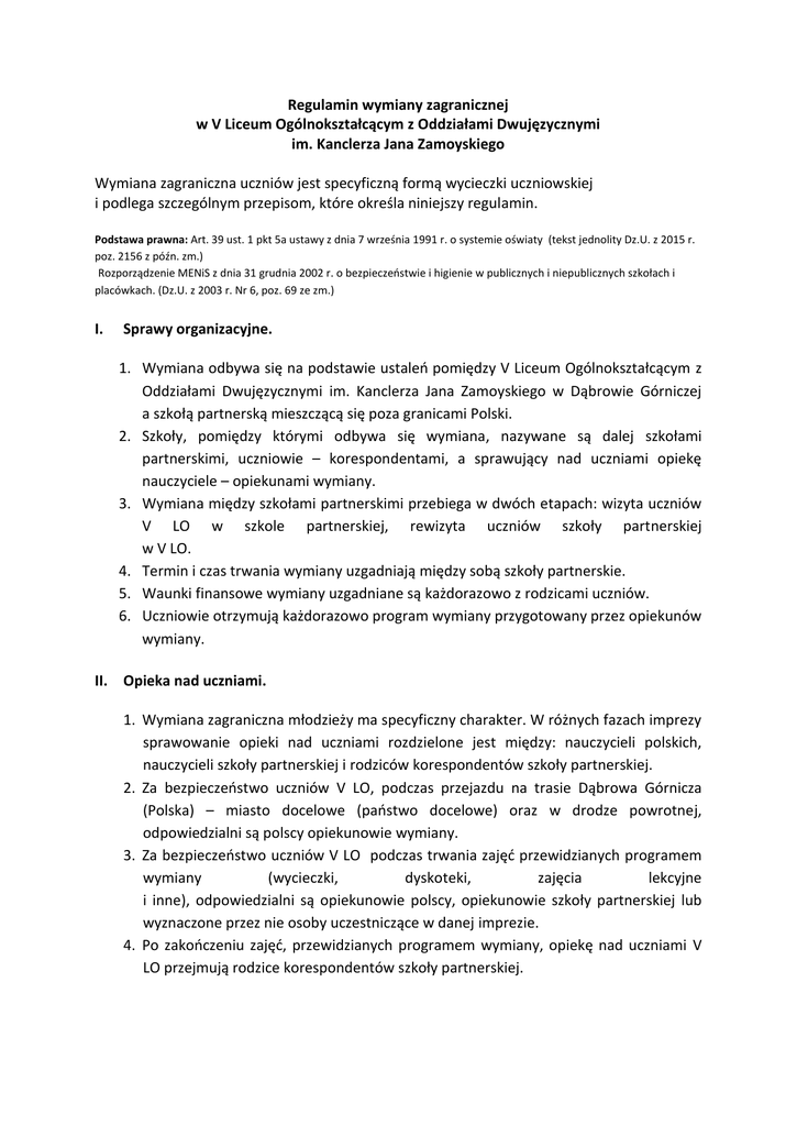Regulamin wymiany zagranicznej w V Liceum Ogólnokształcącym z Oddziałami Dwujęzycznymi im. Kanclerza Jana Zamoyskiego Wymiana zagraniczna uczniów jest specyficzną formą wycieczki uczniowskiej i podlega szczególnym przepisom, które określa niniejszy regulamin. Podstawa prawna: Art. 39 ust. 1 pkt 5a ustawy z dnia 7 września 1991 r. o systemie oświaty (tekst jednolity Dz.U. z 2015 r. poz. 2156 z późn. zm.) Rozporządzenie MENiS z dnia 31 grudnia 2002 r. o bezpieczeństwie i higienie w publicznych i niepublicznych szkołach i placówkach. (Dz.U. z 2003 r. Nr 6, poz. 69 ze zm.) I. Sprawy organizacyjne. 1. Wymiana odbywa się na podstawie ustaleń pomiędzy V Liceum Ogólnokształcącym z Oddziałami Dwujęzycznymi im. Kanclerza Jana Zamoyskiego w Dąbrowie Górniczej a szkołą partnerską mieszczącą się poza granicami Polski. 2. Szkoły, pomiędzy którymi odbywa się wymiana, nazywane są dalej szkołami partnerskimi, uczniowie – korespondentami, a sprawujący nad uczniami opiekę nauczyciele – opiekunami wymiany. 3. Wymiana między szkołami partnerskimi przebiega w dwóch etapach: wizyta uczniów V LO w szkole partnerskiej, rewizyta uczniów szkoły partnerskiej w V LO. 4. Termin i czas trwania wymiany uzgadniają między sobą szkoły partnerskie. 5. Waunki finansowe wymiany uzgadniane są każdorazowo z rodzicami uczniów. 6. Uczniowie otrzymują każdorazowo program wymiany przygotowany przez opiekunów wymiany. II. Opieka nad uczniami. 1. Wymiana zagraniczna młodzieży ma specyficzny charakter. W różnych fazach imprezy sprawowanie opieki nad uczniami rozdzielone jest między: nauczycieli polskich, nauczycieli szkoły partnerskiej i rodziców korespondentów szkoły partnerskiej. 2. Za bezpieczeństwo uczniów V LO, podczas przejazdu na trasie Dąbrowa Górnicza (Polska) – miasto docelowe (państwo docelowe) oraz w drodze powrotnej, odpowiedzialni są polscy opiekunowie wymiany. 3. Za bezpieczeństwo uczniów V LO podczas trwania zajęć przewidzianych programem wymiany (wycieczki, dyskoteki, zajęcia lekcyjne i inne), odpowiedzialni są opiekunowie polscy, opiekunowie szkoły partnerskiej lub wyznaczone przez nie osoby uczestniczące w danej imprezie. 4. Po zakończeniu zajęć, przewidzianych programem wymiany, opiekę nad uczniami V LO przejmują rodzice korespondentów szkoły partnerskiej. III. Obowiązki uczniów uczestniczących w wymianie zagranicznej. 1. Każdy uczestnik wymiany zobowiązany jest do poszanowania środowiska naturalnego, wszelkich obiektów kultu i obyczajów panujących w kraju do którego się udaje. 2. Warunkiem uczestnictwa w wyminie jest ocena z zachowania nie niższa niż dobra w całym okresie edukacji. 3. W czasie podróży obowiązują zasady podane przez przewoźnika. 4. Każdy uczestnik wymiany zobowiązany jest dbać o własne zdrowie i bezpieczeństwo całej grupy. 5. Każdy uczestnik wymiany zobowiązany jest pilnować paszportu, biletu, pieniędzy i innych osobistych rzeczy. 6. Uczestnicy wymiany zobowiązani są do kulturalnego zachowania się w rodzinach goszczących oraz w hotelu, a także w każdym innym miejscu czy sytuacji w czasie realizacji wymiany. 7. Uczestnicy wymiany mają obowiązek przestrzegania zasad czystości i porządku. Za wszystkie szkody i zniszczenia dokonane w trakcie wymiany odpowiadają rodzice uczniów. 8. Uczestnicy wymiany mają obowiązek podporządkowania się rodzicom korespondentów zagranicznych podczas korzystania z gościny w ich domu. Nie mogą samowolnie opuszczać miejsca zamieszkania; powinni zgłaszać rodzicom korespondenta i opiekunom wymiany wszelkie problemy; dostosować się do zasad i wymogów panujących w rodzinie korespondenta. 9. Uczestnicy wymiany mają obowiązek punktualnego stawiania się na wszelkie zbiórki, które wynikają z programu wymiany lub z poleceń opiekunów wymiany. 10. Wszelkie przemieszczanie się w jakimkolwiek celu musi odbywać się za zgodą opiekunów. Uczeń w żadnym przypadku nie może samowolnie oddalić się od grupy. 11. W przypadku nagannego zachowania albo oddalenia się od grupy, opiekunowie mają prawo poinformować rodziców, którzy zobowiązani są do pokrycia całkowitych kosztów rozmowy telefonicznej. Za kontakty telefoniczne z opiekunem lub w przypadku telefonicznego kontaktowania się z zaginionymi uczestnikami całkowite koszty połączeń telefonicznych ponoszą rodzice. 12. Uczniowie mają obowiązek informowania opiekunów wymiany o problemach związanych ze swoim stanem zdrowia (schorzeniach, potrzebie przyjmowania leków). 13. Wszelkie nawet najdrobniejsze problemy zdrowotne należy natychmiast zgłosić opiekunowi wymiany. 14. Każdy uczestnik wymiany powinien posiadać Europejską Kartę Ubezpieczenia Zdrowotnego. 15. Uczestników wymiany obowiązuje całkowity zakaz spożywania napojów alkoholowych, zażywania środków odurzających oraz palenia tytoniu. 16. Podczas trwania wymiany zachowanie uczniów podlega ocenie wg kryteriów na poszczególne oceny zachowania zawartych w Szkolnym Systemie Oceniania. 17. Uczestnicy wymiany mają obowiązek przestrzegania niniejszego regulaminu oraz bezwzględnego podporządkowania się poleceniom polskich i zagranicznym opiekunów wymiany. IV. Obowiązki rodziców (prawnych opiekunów) uczniów V LO Rodzice (prawni opiekunowie): 1. Zapoznają się z ustaleniami niniejszego regulaminu i akceptują go. 2. Po zakończeniu wymiany rodzice są zobowiązani do zapewnienia uczniom opieki podczas powrotu do domu. Nieodebranie ucznia z miejsca zakończenia wymiany jest równoznaczne z wyrażeniem zgody na jego samodzielny powrót do domu. 3. Dostarczają w wyznaczonym terminie opiekunom wymiany zgodę na uczestniczenie dziecka w wymianie. Regulamin wchodzi w życie 28.12.2015 zarządzeniem dyrektora szkoły nr 40