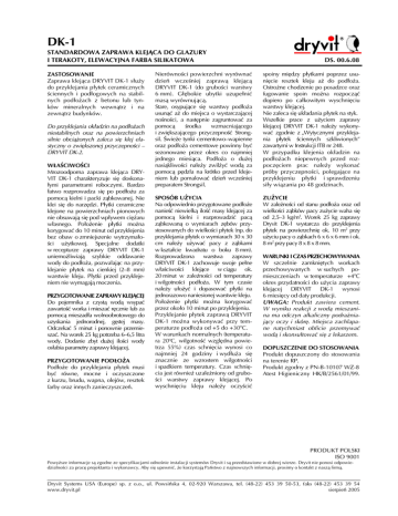DK-1 STANDARDOWA ZAPRAWA KLEJĄCA DO GLAZURY I TERAKOTY, ELEWACYJNA FARBA SILIKATOWA ZASTOSOWANIE Zaprawa klejąca DRYVIT DK-1 służy do przyklejania płytek ceramicznych ściennych i podłogowych na stabilnych podłożach z betonu lub tynków mineralnych wewnątrz i na zewnątrz budynków. Do przyklejania okładzin na podłożach niestabilnych oraz na powierzchniach silnie obciążonych zaleca się klej elastyczny o zwiększonej przyczepności – DRYVIT DK-2. WŁAŚCIWOŚCI Mrozoodporna zaprawa klejąca DRYVIT DK-1 charakteryzuje się doskonałymi parametrami roboczymi. Bardzo łatwo rozprowadza się po podłożu za pomocą kielni i packi ząbkowanej. Nie klei się do narzędzi. Płytki ceramiczne klejone na powierzchniach pionowych nie obsuwają się pod wpływem ciężaru własnego. Położenie płytki można korygować do 10 minut od przyklejenia bez obaw o zmniejszenie wytrzymałości użytkowej. Specjalne dodatki w recepturze zaprawy DRYVIT DK-1 uniemożliwiają szybkie oddawanie wody do podłoża, pozwalając na przyklejanie płytek na cienkiej (2–8 mm) warstwie kleju. Płytki przed przyklejeniem nie wymagają moczenia. PRZYGOTOWANIE ZAPRAWY KLEJĄCEJ Do pojemnika z czystą wodą wsypać zawartość worka i mieszać ręcznie lub za pomocą mieszadła wolnoobrotowego do uzyskania jednorodnej, gęstej masy. Odczekać 5 minut i ponownie przemieszać. Na worek 25 kg potrzeba 6–6,5 litra wody. Dodanie zbyt dużej ilości wody osłabia parametry zaprawy klejącej. PRZYGOTOWANIE PODŁOŻA Podłoże do przyklejania płytek musi być równe, mocne i oczyszczone z kurzu, brudu, wapna, olejów, resztek farby oraz innych zanieczyszczeń. DS. 00.6.08 Nierówności powierzchni wyrównać dzień wcześniej zaprawą klejącą DRYVIT DK-1 (do grubości warstwy 6 mm). Głębokie ubytki uzupełnić masą wyrównującą. Stare, osypujące się warstwy podłoża usunąć aż do miejsca o wystarczającej nośności, a następnie zagruntować za pomocą środka wzmacniającego i zwiększającego przyczepność Strongsil. Świeże tynki cementowo–wapienne oraz podłoża cementowe powinny być sezonowane przez okres co najmniej jednego miesiąca. Podłoża o dużej nasiąkliwości należy zwilżyć wodą za pomocą pędzla na krótko przed klejeniem lub pomalować dzień wcześniej preparatem Strongsil. spoiny między płytkami poprzez usunięcie resztek kleju aż do podłoża. Ostrożne chodzenie po posadzce oraz fugowanie spoin można rozpocząć dopiero po całkowitym wyschnięciu warstwy klejącej. Nie zaleca się układania płytek na styk. Wszelkie prace z użyciem zaprawy klejącej DRYVIT DK-1 należy wykonywać zgodnie z „Wytycznymi przyklejania płytek ściennych szkliwionych” zawartymi w Instrukcji ITB nr 248. W przypadku klejenia okładzin na podłożach niepewnych przed rozpoczęciem prac należy wykonać próby przyczepności, polegające na przyklejeniu płytki i sprawdzeniu siły wiązania po 48 godzinach. SPOSÓB UŻYCIA Na odpowiednio przygotowane podłoże nanieść niewielką ilość masy klejącej za pomocą kielni i rozprowadzić pacą ząbkowaną o wymiarach zębów przystosowanych do wielkości płytek (np. do przyklejania płytek o wymiarach 30 x 30 cm należy używać pacy z ząbkami w kształcie kwadratu o boku 8 mm). Rozprowadzona warstwa zaprawy DRYVIT DK-1 zachowuje swoje pełne właściwości klejące w ciągu ok. 20 minut w zależności od temperatury i wilgotności podłoża. W tym czasie należy ułożyć i dopasować płytki na jednorazowo naniesionej warstwie kleju. Położenie płytki można korygować przez około 10 minut po przyklejeniu. Przyklejanie płytek zaprawą DRYVIT DK-1 można wykonywać przy temperaturze podłoża od +5 do +30oC. W warunkach normalnych (temperatura 20oC, wilgotność względna powietrza 55%) czas schnięcia wynosi co najmniej 24 godziny i wydłuża się znacznie ze wzrostem wilgotności i spadkiem temperatury. Czas schnięcia jest również uzależniony od grubości warstwy zaprawy klejącej. Po wyschnięciu kleju należy oczyścić ZUŻYCIE W zależności od stanu podłoża oraz od wielkości ząbków pacy zużycie waha się od 2,5–3 kg/m2. Worek 25 kg zaprawy Dryvit DK-1 wystarcza do przyklejenia płytek na powierzchnię ok. 10 m2 przy użyciu pacy o ząbkach 6 x 6 x 6 mm i ok. 8 m2 przy pacy 8 x 8 x 8 mm. WARUNKI I CZAS PRZECHOWYWANIA W szczelnie zamkniętych workach przechowywanych w suchych pomieszczeniach w temperaturze +4oC okres przydatności do użycia zaprawy klejącej DRYVIT DK-1 wynosi 6 miesięcy od daty produkcji. UWAGA: Produkt zawiera cement. W wyniku reakcji z wodą mieszanina ma odczyn alkaliczny podrażniający oczy i skórę. Miejsca zachlapane natychmiast obficie przemywać wodą i skonsultować się z lekarzem. DOPUSZCZENIE DO STOSOWANIA Produkt dopuszczony do stosowania na terenie RP. Produkt zgodny z PN-B-10107 WZ-8 Atest Higieniczny HK/B/2561/01/99. PRODUKT POLSKI ISO 9001 Powyższe informacje są zgodne ze specyfikacjami odnośnie instalacji systemów Dryvit i są przedstawione w dobrej wierze. Dryvit nie ponosi odpowiedzialności za pracę projektanta i wykonawcy. Aby się upewnić, że korzystają Państwo z najnowszych informacji, prosimy o kontakt z naszą firmą. Dryvit Systems USA (Europe) sp. z o.o., ul. Powsińska 4, 02-920 Warszawa, tel. (48-22) 453 39 50-53, faks (48-22) 453 39 54 sierpień 2005 www.dryvit.pl