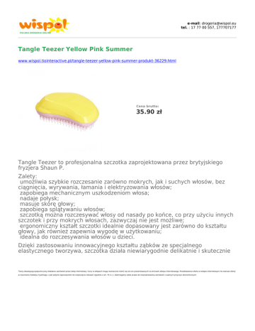 e-mail: [email protected] tel. : 17 77 00 557, 177707177 Tangle Teezer Yellow Pink Summer www.wispol.tiointeractive.pl/tangle-teezer-yellow-pink-summer-produkt-36229.html Cena brutto: 35.90 zł Tangle Teezer to profesjonalna szczotka zaprojektowana przez brytyjskiego fryzjera Shaun P. Zalety: umożliwia szybkie rozczesanie zarówno mokrych, jak i suchych włosów, bez ciągnięcia, wyrywania, łamania i elektryzowania włosów; zapobiega mechanicznym uszkodzeniom włosa; nadaje połysk; masuje skórę głowy; zapobiega splątywaniu włosów; szczotką można rozczesywać włosy od nasady po końce, co przy użyciu innych szczotek i przy mokrych włosach, zazwyczaj nie jest możliwe; ergonomiczny kształt szczotki idealnie dopasowany jest zarówno do kształtu głowy, jak również zapewnia wygodę w użytkowaniu; idealna do rozczesywania włosów u dzieci. Dzięki zastosowaniu innowacyjnego kształtu ząbków ze specjalnego elastycznego tworzywa, szczotka działa niewiarygodnie delikatnie i skutecznie *Ceny obowiązują wyłącznie przy składaniu zamówień przez sklep internetowy. Ceny w sklepach mogą nieznacznie różnić się od cen prezentowanych na stronach sklepu internetowego. Przedstawiona oferta w sklepie internetowym nie stanowi oferty w rozumieniu Kodeksu Cywilnego, i jest jedynie zaproszeniem do rozpoczęcia rokowań (zgodnie z art. 71 k.c.). Zastrzegamy sobie prawo do niezrealizowania zamówień z ważnych przyczyn ekonomicznych.