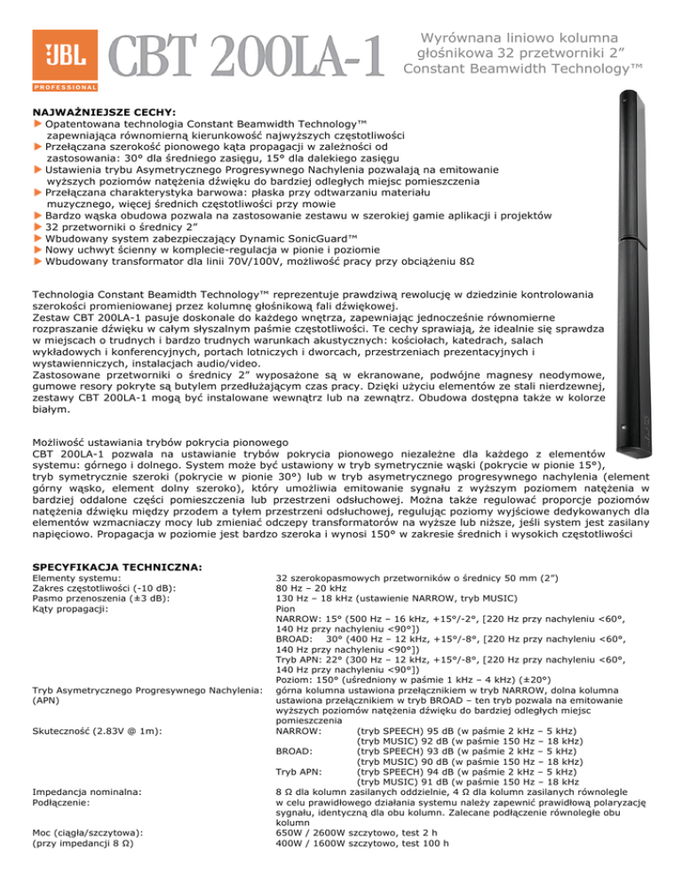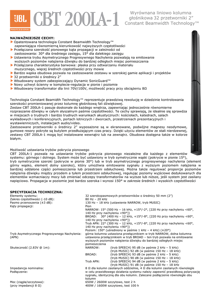 Wyrównana liniowo kolumna głośnikowa 32 przetworniki 2” Constant Beamwidth Technology™ NAJWAŻNIEJSZE CECHY: Opatentowana technologia Constant Beamwidth Technology™ zapewniająca równomierną kierunkowość najwyższych częstotliwości Przełączana szerokość pionowego kąta propagacji w zależności od zastosowania: 30° dla średniego zasięgu, 15° dla dalekiego zasięgu Ustawienia trybu Asymetrycznego Progresywnego Nachylenia pozwalają na emitowanie wyższych poziomów natężenia dźwięku do bardziej odległych miejsc pomieszczenia Przełączana charakterystyka barwowa: płaska przy odtwarzaniu materiału muzycznego, więcej średnich częstotliwości przy mowie Bardzo wąska obudowa pozwala na zastosowanie zestawu w szerokiej gamie aplikacji i projektów 32 przetworniki o średnicy 2” Wbudowany system zabezpieczający Dynamic SonicGuard™ Nowy uchwyt ścienny w komplecie-regulacja w pionie i poziomie Wbudowany transformator dla linii 70V/100V, możliwość pracy przy obciążeniu 8Ω Technologia Constant Beamidth Technology™ reprezentuje prawdziwą rewolucję w dziedzinie kontrolowania szerokości promieniowanej przez kolumnę głośnikową fali dźwiękowej. Zestaw CBT 200LA-1 pasuje doskonale do każdego wnętrza, zapewniając jednocześnie równomierne rozpraszanie dźwięku w całym słyszalnym paśmie częstotliwości. Te cechy sprawiają, że idealnie się sprawdza w miejscach o trudnych i bardzo trudnych warunkach akustycznych: kościołach, katedrach, salach wykładowych i konferencyjnych, portach lotniczych i dworcach, przestrzeniach prezentacyjnych i wystawienniczych, instalacjach audio/video. Zastosowane przetworniki o średnicy 2” wyposażone są w ekranowane, podwójne magnesy neodymowe, gumowe resory pokryte są butylem przedłużającym czas pracy. Dzięki użyciu elementów ze stali nierdzewnej, zestawy CBT 200LA-1 mogą być instalowane wewnątrz lub na zewnątrz. Obudowa dostępna także w kolorze białym. Możliwość ustawiania trybów pokrycia pionowego CBT 200LA-1 pozwala na ustawianie trybów pokrycia pionowego niezależne dla każdego z elementów systemu: górnego i dolnego. System może być ustawiony w tryb symetrycznie wąski (pokrycie w pionie 15°), tryb symetrycznie szeroki (pokrycie w pionie 30°) lub w tryb asymetrycznego progresywnego nachylenia (element górny wąsko, element dolny szeroko), który umożliwia emitowanie sygnału z wyższym poziomem natężenia w bardziej oddalone części pomieszczenia lub przestrzeni odsłuchowej. Można także regulować proporcje poziomów natężenia dźwięku między przodem a tyłem przestrzeni odsłuchowej, regulując poziomy wyjściowe dedykowanych dla elementów wzmacniaczy mocy lub zmieniać odczepy transformatorów na wyższe lub niższe, jeśli system jest zasilany napięciowo. Propagacja w poziomie jest bardzo szeroka i wynosi 150° w zakresie średnich i wysokich częstotliwości SPECYFIKACJA TECHNICZNA: Elementy systemu: Zakres częstotliwości (-10 dB): Pasmo przenoszenia (±3 dB): Kąty propagacji: Tryb Asymetrycznego Progresywnego Nachylenia: (APN) Skuteczność (2.83V @ 1m): Impedancja nominalna: Podłączenie: Moc (ciągła/szczytowa): (przy impedancji 8 Ω) 32 szerokopasmowych przetworników o średnicy 50 mm (2”) 80 Hz – 20 kHz 130 Hz – 18 kHz (ustawienie NARROW, tryb MUSIC) Pion NARROW: 15° (500 Hz – 16 kHz, +15°/-2°, [220 Hz przy nachyleniu <60°, 140 Hz przy nachyleniu <90°]) BROAD: 30° (400 Hz – 12 kHz, +15°/-8°, [220 Hz przy nachyleniu <60°, 140 Hz przy nachyleniu <90°]) Tryb APN: 22° (300 Hz – 12 kHz, +15°/-8°, [220 Hz przy nachyleniu <60°, 140 Hz przy nachyleniu <90°]) Poziom: 150° (uśredniony w paśmie 1 kHz – 4 kHz) (±20°) górna kolumna ustawiona przełącznikiem w tryb NARROW, dolna kolumna ustawiona przełącznikiem w tryb BROAD – ten tryb pozwala na emitowanie wyższych poziomów natężenia dźwięku do bardziej odległych miejsc pomieszczenia NARROW: (tryb SPEECH) 95 dB (w paśmie 2 kHz – 5 kHz) (tryb MUSIC) 92 dB (w paśmie 150 Hz – 18 kHz) BROAD: (tryb SPEECH) 93 dB (w paśmie 2 kHz – 5 kHz) (tryb MUSIC) 90 dB (w paśmie 150 Hz – 18 kHz) Tryb APN: (tryb SPEECH) 94 dB (w paśmie 2 kHz – 5 kHz) (tryb MUSIC) 91 dB (w paśmie 150 Hz – 18 kHz 8 Ω dla kolumn zasilanych oddzielnie, 4 Ω dla kolumn zasilanych równolegle w celu prawidłowego działania systemu należy zapewnić prawidłową polaryzację sygnału, identyczną dla obu kolumn. Zalecane podłączenie równoległe obu kolumn 650W / 2600W szczytowo, test 2 h 400W / 1600W szczytowo, test 100 h Maksymalny poziom SPL: Odczepy transformatora 70V/100V: Obudowa: Gniazda: Normy odporności zewnętrznej: Kolory: Konfiguracja: Punkty instalacyjne: Instalacja: Wymiary zestawu: Waga: Dołączone akcesoria: Opcjonalne akcesoria: NARROW: (tryb SPEECH) 123 dB ciągły uśredniony (129 szczytowy) (tryb MUSIC) 120 dB ciągły uśredniony (126 szczytowy) BROAD: (tryb SPEECH) 121 dB ciągły uśredniony (127 szczytowy) (tryb MUSIC) 118 dB ciągły uśredniony (124 szczytowy) APN: (tryb SPEECH) 122 dB ciągły uśredniony (128 szczytowy) (tryb MUSIC) 119 dB ciągły uśredniony (125 szczytowy indywidualnie dla każdej kolumny: 120W, 60W, 30W (15W tylko dla 70V) sumarycznie (te same odczepy w obu kolumnach): 240W, 120W, 60W, (30W tylko dla 70V) wykonana z tworzywa ABS pokrytego włóknem szklanym, malowany aluminiowy gril śrubowy terminal połączeniowy, akceptuje przewów o maksymalnej średnicy 2.5 mm2 lub zaciskane na przewodzie widełki o szerokości do 4 mm IP-54, IEC529, odporna na promieniowanie UV, parę oraz słoną parę czarny lub biały (-WH) obie kolumny o wysokości 100 cm połączone ze sobą płytą instalacyjną 28 punktów M6 na tylnej obudowie (36 w sumie, 8 zarezerwowanych dla płyty połączeniowej uchwyt ścienny w komplecie, zapewnia ±15° płynnej regulacji w pionie, maksymalnie ±80° regulacji w poziomie, ponadto otwory do regulacji w pionie co 5