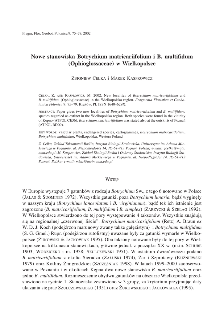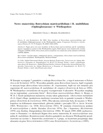 Fragm. Flor. Geobot. Polonica 9: 75–79, 2002 Nowe stanowiska Botrychium matricariifolium i B. multifidum (Ophioglossaceae) w Wielkopolsce ZBIGNIEW CELKA i MAREK KASPROWICZ CELKA, Z. AND KASPROWICZ, M. 2002. New localites of Botrychium matricariifolium and B. multifidum (Ophioglossaceae) in the Wielkopolska region. Fragmenta Floristica et Geobotanica Polonica 9: 75–79. Kraków. PL ISSN 1640–629X. ABSTRACT: Paper gives two new localities of Botrychium matricariifolium and B. multifidum, species regarded as extinct in the Wielkopolska region. Both species were found in the vicinity of Ke˛pno (ATPOL CE36). Botrychium matricariifolium was stated also at the outskirts of Poznań (ATPOL BD09). KEY WORDS: vascular plants, endangered species, cartogrammes, Botrychium matricariifolium, Botrychium multifidum, Wielkopolska, Western Poland Z. Celka, Zakład Taksonomii Roślin, Instytut Biologii Środowiska, Uniwersytet im. Adama Mickiewicza w Poznaniu, al. Niepodległości 14, PL-61-713 Poznań, Polska; e-mail: zcelka@main. amu.edu.pl; M. Kasprowicz, Zakład Ekologii Roślin i Ochrony Środowiska, Instytut Biologii Środowiska, Uniwersytet im. Adama Mickiewicza w Poznaniu, al. Niepodległości 14, PL-61-713 Poznań, Polska; e-mail: [email protected] WSTE˛P W Europie wyste˛puje 7 gatunków z rodzaju Botrychium Sw., z tego 6 notowano w Polsce (JALAS & SUOMINEN 1972). Wszystkie gatunki, poza Botrychium lunaria, ba˛dź wygine˛ły w naszym kraju (Botrychium lanceolatum i B. virginianum), ba˛dź też ich istnienie jest zagrożone (B. matricariifolium, B. multifidum i B. simplex) (ZARZYCKI & SZELA˛G 1992). W Wielkopolsce stwierdzono do tej pory wyste˛powanie 4 taksonów. Wszystkie znajduja˛ sie˛ na regionalnej „czerwonej liście”. Botrychium matricariifolium (Retz) A. Braun ex W. D. J. Koch (podejźrzon marunowy zwany także gałe˛zistym) i Botrychium multifidum (S. G. Gmel.) Rupr. (podejźrzon rutolistny) uważane były za gatunki wymarłe w Wielkopolsce (ŻUKOWSKI & JACKOWIAK 1995). Oba taksony notowane były do tej pory w Wielkopolsce na kilkunastu stanowiskach, głównie jednak z pocza˛tku XX w. (m.in. SCHUBE 1903; WODZICZKO i in. 1938; SZULCZEWSKI 1951). W ostatnim ćwierćwieczu podano B. matricariifolium z okolic Sieradza (ZAŁUSKI 1974), Żar i Szprotawy (KUŹNIEWSKI 1979) oraz Kotliny Żmigrodzkiej (SZCZE˛ŚNIAK 1998). W latach 1999–2000 zaobserwowano w Poznaniu i w okolicach Ke˛pna dwa nowe stanowiska B. matricariifolium oraz jedno B. multifidum. Rozmieszczenie obydwu gatunków na obszarze Wielkopolski przedstawiono na rycinie 1. Stanowiska zestawiono w 3 grupy, za kryterium przyjmuja˛c daty ukazania sie˛ prac SZULCZEWSKIEGO (1951) oraz ŻUKOWSKIEGO i JACKOWIAKA (1995). 76 Fragm. Flor. Geobot. Polonica 9, 2002 A B C D A B C D C D E a C D E b 1 2 3 Ryc. 1. Rozmieszczenie Botrychium multifidum (S. G. Gmel.) Rupr. (a) i B. matricariifolium (Retz) A. Braun ex W. D. J. Koch (b) w Wielkopolsce. 1 – stanowiska stwierdzone do 1951 r., 2 – stanowiska notowane w latach 1951–1995, 3 – stanowiska nowe, tj. stwierdzone po 1995 r. Fig. 1. The distribution of Botrychium multifidum (S. G. Gmel.) Rupr. (a) and B. matricariifolium (Retz) A. Braun ex W. D. J. Koch (b) in Wielkopolska. 1 – locations reported before 1951, 2 – locations reported 1951–1995, 3 – new locations (after 1995). CHARAKTERYSTYKA STANOWISK W dniu 9 lipca 1999 r. w lasach nieopodal Ke˛pna stwierdzono stanowisko Botrychium multifidum (ATPOL CE36). Odnaleziono cztery osobniki, z których dwa wykształciły cze˛ść sporofilowa˛. Najwie˛kszy z nich mierzył 7 cm wysokości (długość cze˛ści sporofilowej – 5 cm, trofofilowej – 4 cm). Według diagnozy K. Latowskiego, był to osobnik młody, o niezbyt typowym pokroju, jednak niewa˛tpliwie reprezentuja˛cy B. multifidum. W dniu 20 lipca 2000 r., powtórzono obserwacje i stwierdzono obecność dwóch osobników B. multifidum (w tym jeden z wykształconym liściem zarodnionośnym), a także, usytuowane w odległości 2,9 m od nich, dwa osobniki B. matricariifolium. Jeden z nich Z. Celka & M. Kasprowicz: Botrychium w Wielkopolsce 77 mierzył 9 cm wysokości i składał sie˛ z cze˛ści trofofilowej (długość 3,3 cm) oraz cze˛ści sporofilowej (dł. 3 cm) rozgałe˛zionej na 2 cze˛ści. Drugi osobnik posiadał jedynie cze˛ść asymilacyjna˛. Oba gatunki wyste˛puja˛ w fitocenozie, której skład florystyczny ilustruje zamieszczone poniżej zdje˛cie fitosocjologiczne nr 1. Przedstawia ona nieustabilizowane jeszcze zbiorowisko leśne, rozwijaja˛ce sie˛ prawdopodobnie w kierunku żyznej postaci acydofilnej da˛browy. Jest to zwarty i jednorodny drzewostan klonu zwyczajnego Acer platanoides zajmuja˛cy areał około 400 m2 . Stanowi on cze˛ść powierzchni doświadczalnej założonej przez S. Szymańskiego (por. SZYMAŃSKI 1982). Interesuja˛cy nas drzewostan klonu zwyczajnego sa˛siaduje z jednolitymi drzewostanami jaworu, buka i lipy (każdy z nich o powierzchni 400 m2), a od strony południowo wschodniej, poprzez droge˛ gruntowa˛, z rozległym obszarem młodej uprawy de˛bu opanowanej przez roślinność z klasy Epilobietea angustifolii R.Tx et Prsg 1950. Omawiane powierzchnie doświadczalne położone sa˛ w oddziale 25a Leśnego Zakładu Doświadczalnego Siemianice, na siedlisku lasu mieszanego świeżego. Powstały one na drodze nasadzeń dokonanych w latach 1969 i 1970 na powierzchni zre˛bu zupełnego drzewostanów sosnowych. W literaturze brak informacji o szacie roślinnej tych lasów przed dokonaniem zre˛bów. Wyste˛puja˛ce obecnie w sa˛siedztwie sośniny sa˛ prześwietlone i zdominowane w warstwie runa przez Calamagrostis epigejos. Zdj. nr 1. 20.07.2000. oddz. 25a; zwarcie warstwy a 85%; pokrycie warstwy c 15%; pokrycie warstwy d 5%; powierzchnia 220 m2; liczba gatunków 39. Acer platanoides a 5.5, c +; Acer pseudoplatanus c +; Agrostis capillaris +.2; Botrychium multifidum r; B. matricariifolium r; Calamagrostis epigejos ro