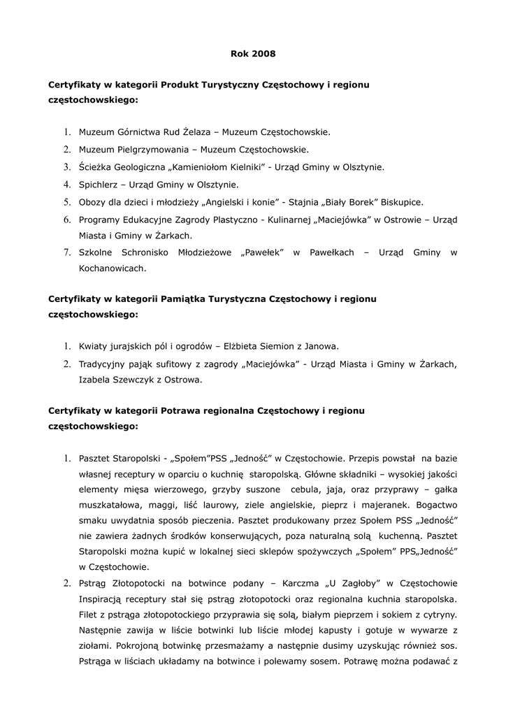 Rok 2008 Certyfikaty w kategorii Produkt Turystyczny Częstochowy i regionu częstochowskiego: 1. Muzeum Górnictwa Rud Żelaza – Muzeum Częstochowskie. 2. Muzeum Pielgrzymowania – Muzeum Częstochowskie. 3. Ścieżka Geologiczna „Kamieniołom Kielniki” - Urząd Gminy w Olsztynie. 4. Spichlerz – Urząd Gminy w Olsztynie. 5. Obozy dla dzieci i młodzieży „Angielski i konie” - Stajnia „Biały Borek” Biskupice. 6. Programy Edukacyjne Zagrody Plastyczno - Kulinarnej „Maciejówka” w Ostrowie – Urząd Miasta i Gminy w Żarkach. 7. Szkolne Schronisko Młodzieżowe „Pawełek” w Pawełkach – Urząd Gminy w Kochanowicach. Certyfikaty w kategorii Pamiątka Turystyczna Częstochowy i regionu częstochowskiego: 1. Kwiaty jurajskich pól i ogrodów – Elżbieta Siemion z Janowa. 2. Tradycyjny pająk sufitowy z zagrody „Maciejówka” - Urząd Miasta i Gminy w Żarkach, Izabela Szewczyk z Ostrowa. Certyfikaty w kategorii Potrawa regionalna Częstochowy i regionu częstochowskiego: 1. Pasztet Staropolski - „Społem”PSS „Jedność” w Częstochowie. Przepis powstał na bazie własnej receptury w oparciu o kuchnię staropolską. Główne składniki – wysokiej jakości elementy mięsa wierzowego, grzyby suszone cebula, jaja, oraz przyprawy – gałka muszkatałowa, maggi, liść laurowy, ziele angielskie, pieprz i majeranek. Bogactwo smaku uwydatnia sposób pieczenia. Pasztet produkowany przez Społem PSS „Jedność” nie zawiera żadnych środków konserwujących, poza naturalną solą kuchenną. Pasztet Staropolski można kupić w lokalnej sieci sklepów spożywczych „Społem” PPS„Jedność” w Częstochowie. 2. Pstrąg Złotopotocki na botwince podany – Karczma „U Zagłoby” w Częstochowie Inspiracją receptury stał się pstrąg złotopotocki oraz regionalna kuchnia staropolska. Filet z pstrąga złotopotockiego przyprawia się solą, białym pieprzem i sokiem z cytryny. Następnie zawija w liście botwinki lub liście młodej kapusty i gotuje w wywarze z ziołami. Pokrojoną botwinkę przesmażamy a następnie dusimy uzyskując również sos. Pstrąga w liściach układamy na botwince i polewamy sosem. Potrawę można podawać z ryżem lub ziemniakami. Niestety Karczma „U Zagłoby” zawiesiła swoją działalność. 3. Kluski Prażuchy – Spółka „Zamek” w Ogrodzieńcu. Jest to potrawa regionalna, chłopska przygotowywana na bazie bardzo prostych składników. Kluski przygotowuje się z gotowanych ziemniaków (tę opcję preferujemy, chociaż istnieje przepis z ziemniakami surowymi) i palonej, „tlonej”mąki. Oba składniki razem z przyprawami i leśnymi grzybami ubija się drewnianą pałką tak długo, aż ciasto będzie „odchodzić” od pałki. Wtedy nakłada się je metodą „łyżka z łyżki” i polewa skwarkami z wędzonki. Kluski prażuchy można degustować na zamku ogrodzienieckim podczas biesiad regionalnych oraz festynów; na zamówienie przygotowywane są jako danie regionalne w Karczmie Rycerskiej. 4. Sernik z koziego sera – „Kozia zagroda” w Ostrowie gm. Żarki. Sernik przygotowywany jest w gospodarstwie specjalistycznym Kozia Zagroda w gminie Żarki, według własnej receptury. Ma delikatny słodko kwaśny smak, jest puszysty, mało kaloryczny i lekki dla żołądka. Składniki to: ser kozi, mleko kozie, masło kozie, cukier, mąka ziemniaczana, jaja, mąka pszenna wrocławska i cukier puder. Można go skosztować w Koziej Zagrodzie, podczas lokalnych festynów oraz min w Żareckiej Stodole podczas Kupieckiego Sąsieku w Żarkach. 5. Olsztyńska Parzybroda – Lokal Gastronomiczny „Zacisze” w Olsztynie. Jest jedną z najbardziej charakterystycznych zup naszego regionu i Śląska spośród tych które przetrwały do dziś. Olsztyńska Parzybroda to prosta, wiejska potrawa – gęsty kapuśniak z białej kapusty, podawany na gorąco z dużą ilością przypraw i ziół. Przygotowuje się go na wywarze z żeberek lub wędzonych kości. Pozostałe składniki to grubo krojone ziemniaki i spore kawałki kapusty – na tyle duże, że podczas jedzenia łatwo mogą poparzyć brodę. Stąd nazwa, używana zamiennie z pazibrodą. Zagęszczamy ją zasmażką lub zawiesiną z mąki pszennej. Jest bardzo pożywna, zdrowa i zaskakująco smaczna. Widnieje w jadłospisie wielu śląskich karczm regionalnych jest jedną z głównych atrakcji kulinarnych lokalu gastronomicznego „Zacisze”. Od 2007 r. Parzybroda zwana śląską widnieje na Krajowej Liście Produktów Tradycyjnych, prowadzonej przez Ministerstwo Rolnictwa i Rozwoju Wsi.