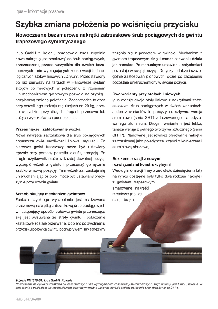 igus – Informacje prasowe Szybka zmiana położenia po wciśnięciu przycisku Nowoczesne bezsmarowe nakrętki zatrzaskowe śrub pociągowych do gwintu trapezowego symetrycznego igus GmbH z Kolonii, opracowała teraz zupełnie zazębia się z powrotem w gwincie. Mechanizm z nowa nakrętkę „zatrzaskową” do śrub pociągowych, gwintem trapezowym dzięki samoblokowaniu działa przeznaczoną przede wszystkim dla swoich bezs- jak hamulec. Po manualnym ustawieniu natychmiast marowych i nie wymagających konserwacji techno- pozostaje w swojej pozycji. Dotyczy to także i szcze- logicznych stołów liniowych „DryLin”. Przedstawiony gólnie zastosowań pionowych, gdzie po zazębieniu po raz pierwszy na targach w Hanowerze system pozostaje unieruchomiony w swojej pozycji. ślizgów polimerowych w połączeniu z trzpieniem lub mechanizmem gwintowym pozwala na szybką i Dwa warianty przy stołach liniowych bezpieczną zmianę położenia. Zaoszczędza to czas igus oferuje swoje stoły liniowe z nakrętkami zatrz- przy wszelkiego rodzaju regulacjach do 20 kg, prze- askowymi śrub pociągowych w dwóch wariantach. de wszystkim przy długich drogach przesuwu lub Jeden z wariantów to precyzyjna, sztywna wersja dużych wysokościach podnoszenia. aluminiowa (seria SHT) z frezowanego i anodyzowanego aluminium. Drugim wariantem jest lekka, Przesunięcie i zablokowanie wózka tańsza wersja z pełnego tworzywa sztucznego (seria Nowa nakrętka zatrzaskowa dla śrub pociągowych SHTP). Planowane jest również oferowanie nakrętki dopuszcza dwie możliwości liniowej regulacji. Po zatrzaskowej jako pojedynczej części z kołnierzem i pierwsze gwint trapezowy może być ustawiony aluminiową obudową. ręcznie przy pomocy pokrętła z dużą precyzją. Po drugie użytkownik może w każdej dowolnej pozycji Bez konserwacji z nowymi wyczepić wózek z gwintu i przesunąć go ręcznie rozwiązaniami konstrukcyjnymi szybko w nową pozycję. Tam wózek zatrzaskuje się Według informacji firmy przed około dziesięcioma laty unieruchamiając osiowo i może być ustawiany precy- na rynku dostępne były tylko dwa rodzaje nakrętek zyjnie przy użyciu gwintu. z gwintem trapezowym: smarowane nakrętki Samoblokujący mechanizm gwintowy metalowe (np. ze Funkcja szybkiego wyczepienia jest realizowana stali, brązu, przez nową nakrętkę zatrzaskową śrub pociągowych w następujący sposób: połówka gwintu przenosząca siłę jest wysuwana ze strefy gwintu i połączenie kształtowe zostaje przerwane. Dopiero po zwolnieniu przycisku połówka gwintu pod wpływem siły sprężyny Zdjęcie PM1310-01: igus GmbH, Kolonia Nowoczesna nakrętka zatrzaskowa dla bezsmarowych i nie wymagających konserwacji stołów liniowych „DryLin” firmy igus GmbH, Kolonia. W połączeniu z trzpieniem lub mechanizmem gwintowym można wykonać szybkie zmiany położenia przy obciążeniu do 20 kg. PM1310-PL/06-2010 igus – Informacje prasowe mosiądzu) oraz wersje z tworzywa sztucznego PA 6.6 tu, lecz także nowych rozwiązań konstrukcyjnych lub POM, których zdolność przenoszenia obciążeń dopasowanych do wymagań klientów. Wszystkie była bardzo ograniczona i przy których stosowa- rozwiązania opierają się na sprawdzonych i zna- niu również zalecano smarowanie. Tę lukę wypełnił nych od 25 lat właściwościach polimerów „iglidur” i specjalista od tworzyw sztucznych, igus, swoim wszystkie bez wyjątku są przystosowane do stoso- programem bezsmarowych i nie wymagających wania bez środków smarowych. Teraz w Hanowerze konserwacji nakrętek śrub pociągowych z gwintem igus zaprezentował także nowe nakrętki dla szybkich trapezowym, wykonanych z polimerów o wysok- gwintów z dużymi prędkościami przesuwu. Ponad- iej wytrzymałości „iglidur”. Na tegorocznych tar- to firma pokazała nowe nakrętki z mechanizmem gach w Hanowerze przedsiębiorstwo rozpoczęło „anti-backlash”. Gwarantują one minimalny luz przez szeroką rozbudowę swojej oferty w tej dziedzi- cały okres użytkowania bez znaczącego wzrostu nie. Dotyczy to nie tylko wymiarów i skoków gwin- niezbędnego momentu obrotowego. Zdjęcie PM1310-02: igus GmbH, Kolonia Zasada działania nakrętki zatrzaskowej do śrub pociągowych: wyczepić wózek z gwintu w dowolnej pozycji, przesunąć ręcznie w nową pozycję (1), tam wózek zostaje osiowo zablokowany i może być precyzyjnie ustawiony przy użyciu gwintu (2). KONTAKT PRASOWY: André Kluth Corporate Communication Manager igus GmbH Spicher Str. 1a D-51147 Köln Tel. +49 (0) 22 03 / 96 49 - 611 Fax +49 (0) 22 03 / 96 49 - 631 [email protected] www.igus.de DIN ISO 9001:2000 “igus, Chainflex, Easy Chain, E-Chain, E-Chain System, Energy Chain, Energy Chain System, Flizz, ReadyChain, ReadyCable, invis, Triflex, TwisterChain, DryLin, iglidur, igubal, xiros, plastics for longer life en manus“ są znakami towarowymi chronionymi prawem w Republice Federalnej Niemiec i na całym świecie. PM1310-PL/06-2010