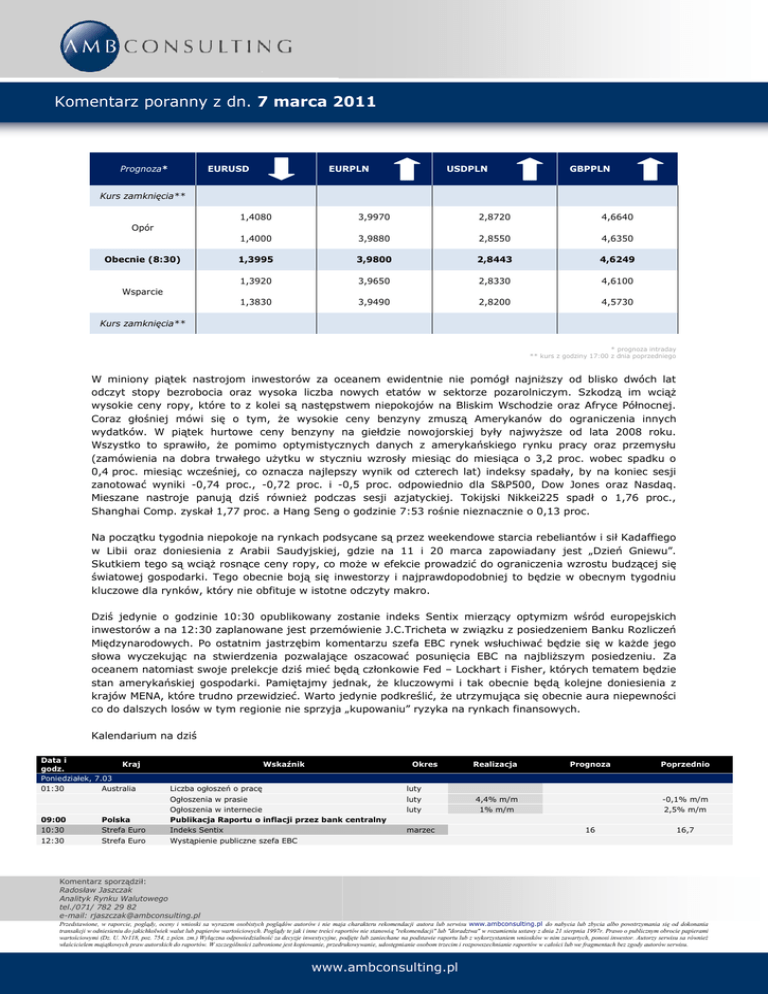 Komentarz poranny z dn. 7 marca 2011 Prognoza* EURUSD EURPLN USDPLN GBPPLN Kurs zamknięcia** 1,4080 3,9970 2,8720 4,6640 1,4000 3,9880 2,8550 4,6350 1,3995 3,9800 2,8443 4,6249 1,3920 3,9650 2,8330 4,6100 1,3830 3,9490 2,8200 4,5730 Opór Obecnie (8:30) Wsparcie Kurs zamknięcia** * prognoza intraday ** kurs z godziny 17:00 z dnia poprzedniego W miniony piątek nastrojom inwestorów za oceanem ewidentnie nie pomógł najniższy od blisko dwóch lat odczyt stopy bezrobocia oraz wysoka liczba nowych etatów w sektorze pozarolniczym. Szkodzą im wciąż wysokie ceny ropy, które to z kolei są następstwem niepokojów na Bliskim Wschodzie oraz Afryce Północnej. Coraz głośniej mówi się o tym, że wysokie ceny benzyny zmuszą Amerykanów do ograniczenia innych wydatków. W piątek hurtowe ceny benzyny na giełdzie nowojorskiej były najwyższe od lata 2008 roku. Wszystko to sprawiło, że pomimo optymistycznych danych z amerykańskiego rynku pracy oraz przemysłu (zamówienia na dobra trwałego użytku w styczniu wzrosły miesiąc do miesiąca o 3,2 proc. wobec spadku o 0,4 proc. miesiąc wcześniej, co oznacza najlepszy wynik od czterech lat) indeksy spadały, by na koniec sesji zanotować wyniki -0,74 proc., -0,72 proc. i -0,5 proc. odpowiednio dla S&P500, Dow Jones oraz Nasdaq. Mieszane nastroje panują dziś również podczas sesji azjatyckiej. Tokijski Nikkei225 spadł o 1,76 proc., Shanghai Comp. zyskał 1,77 proc. a Hang Seng o godzinie 7:53 rośnie nieznacznie o 0,13 proc. Na początku tygodnia niepokoje na rynkach podsycane są przez weekendowe starcia rebeliantów i sił Kadaffiego w Libii oraz doniesienia z Arabii Saudyjskiej, gdzie na 11 i 20 marca zapowiadany jest „Dzień Gniewu”. Skutkiem tego są wciąż rosnące ceny ropy, co może w efekcie prowadzić do ograniczenia wzrostu budzącej się światowej gospodarki. Tego obecnie boją się inwestorzy i najprawdopodobniej to będzie w obecnym tygodniu kluczowe dla rynków, który nie obfituje w istotne odczyty makro. Dziś jedynie o godzinie 10:30 opublikowany zostanie indeks Sentix mierzący optymizm wśród europejskich inwestorów a na 12:30 zaplanowane jest przemówienie J.C.Tricheta w związku z posiedzeniem Banku Rozliczeń Międzynarodowych. Po ostatnim jastrzębim komentarzu szefa EBC rynek wsłuchiwać będzie się w każde jego słowa wyczekując na stwierdzenia pozwalające oszacować posunięcia EBC na najbliższym posiedzeniu. Za oceanem natomiast swoje prelekcje dziś mieć będą członkowie Fed – Lockhart i Fisher, których tematem będzie stan amerykańskiej gospodarki. Pamiętajmy jednak, że kluczowymi i tak obecnie będą kolejne doniesienia z krajów MENA, które trudno przewidzieć. Warto jedynie podkreślić, że utrzymująca się obecnie aura niepewności co do dalszych losów w tym regionie nie sprzyja „kupowaniu” ryzyka na rynkach finansowych. Kalendarium na dziś Data i Kraj godz. Poniedziałek, 7.03 01:30 Australia 09:00 10:30 12:30 Polska Strefa Euro Strefa Euro Wskaźnik Okres Liczba ogłoszeń o pracę Ogłoszenia w prasie Ogłoszenia w internecie Publikacja Raportu o inflacji przez bank centralny Indeks Sentix Wystąpienie publiczne szefa EBC luty luty luty marzec Realizacja Prognoza 4,4% m/m 1% m/m Poprzednio -0,1% m/m 2,5% m/m 16 16,7 Komentarz sporządził: Radosław Jaszczak Analityk Rynku Walutowego tel./071/ 782 29 82 e-mail: [email protected] Przedstawione, w raporcie, poglądy, oceny i wnioski sa wyrazem osobistych poglądów autorów i nie maja charakteru rekomendacji autora lub serwisu www.ambconsulting.pl do nabycia lub zbycia albo powstrzymania się od dokonania transakcji w odniesieniu do jakichkolwiek walut lub papierów wartościowych. Poglądy te jak i inne treści raportów nie stanowią "rekomendacji" lub "doradztwa" w rozumieniu ustawy z dnia 21 sierpnia 1997r. Prawo o publicznym obrocie papierami wartościowymi (Dz. U. Nr118, poz. 754, z pózn. zm.) Wyłączna odpowiedzialność za decyzje inwestycyjne, podjęte lub zaniechane na podstawie raportu lub z wykorzystaniem wniosków w nim zawartych, ponosi inwestor. Autorzy serwisu sa również właścicielem majątkowych praw autorskich do raportów. W szczególności zabronione jest kopiowanie, przedrukowywanie, udostępnianie osobom trzecim i rozpowszechnianie raportów w całości lub we fragmentach bez zgody autorów serwisu. www.ambconsulting.pl Komentarz poranny z dn. 7 marca 2011 14:30 21:00 Kanada USA Pozwolenia na budowę domów Kredyt konsumencki styczeń stcyzeń 0,8% m/m 3,9 mld USD 2,4% m/m 6,1 mld USD Komentarz sporządził: Radosław Jaszczak Analityk Rynku Walutowego tel./071/ 782 29 82 e-mail: [email protected] Przedstawione, w raporcie, poglądy, oceny i wnioski sa wyrazem osobistych poglądów autorów i nie maja charakteru rekomendacji autora lub serwisu www.ambconsulting.pl do nabycia lub zbycia albo powstrzymania się od dokonania transakcji w odniesieniu do jakichkolwiek walut lub papierów wartościowych. Poglądy te jak i inne treści raportów nie stanowią "rekomendacji" lub "doradztwa" w rozumieniu ustawy z dnia 21 sierpnia 1997r. Prawo o publicznym obrocie papierami wartościowymi (Dz. U. Nr118, poz. 754, z pózn. zm.) Wyłączna odpowiedzialność za decyzje inwestycyjne, podjęte lub zaniechane na podstawie raportu lub z wykorzystaniem wniosków w nim zawartych, ponosi inwestor. Autorzy serwisu sa również właścicielem majątkowych praw autorskich do raportów. W szczególności zabronione jest kopiowanie, przedrukowywanie, udostępnianie osobom trzecim i rozpowszechnianie raportów w całości lub we fragmentach bez zgody autorów serwisu. www.ambconsulting.pl