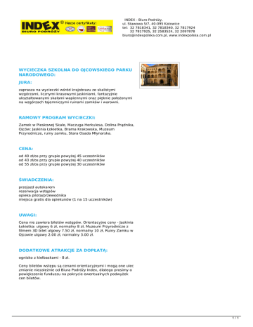 INDEX - Biuro Podróży, ul. Stawowa 5/7, 40-095 Katowice tel: 32 7818341, 32 7818340, 32 7817924 32 7817925, 32 2583524, 32 2097878 [email protected], www.indexpolska.com.pl WYCIECZKA SZKOLNA DO OJCOWSKIEGO PARKU NARODOWEGO: JURA: zaprasza na wycieczki wśród krajobrazu ze skalistymi wzgórzami, licznymi krasowymi jaskiniami, fantazyjnie ukształtowanymi skałami wapiennymi oraz pięknie położonymi na wzgórzach tajemniczymi ruinami zamków i warowni. RAMOWY PROGRAM WYCIECZKI: Zamek w Pieskowej Skale, Maczuga Herkulesa, Dolina Prądnika, Ojców: Jaskinia Łokietka, Brama Krakowska, Muzeum Przyrodnicze, ruiny zamku, Stara Osada Młynarska. CENA: od 40 zł/os przy grupie powyżej 45 uczestników od 43 zł/os przy grupie powyżej 40 uczestników od 55 zł/os przy grupie powyżej 30 uczestników ŚWIADCZENIA: przejazd autokarem rezerwacja wstępów opieka pilota/przewodnika miejsca gratis dla opiekunów (1 na 15 uczestników) UWAGI: Cena nie zawiera biletów wstępów. Orientacyjne ceny - Jaskinia Łokietka: ulgowy 6 zł, normalny 8 zł, Muzeum Przyrodnicze z filmem 3D bilet ulgowy 7.50 zł, normalny 10 zł, Ruiny Zamku w Ojcowie ulgowy 2.00 zł, normalny 3.00 zł. DODATKOWE ATRAKCJE ZA DOPŁATĄ: ognisko z kiełbaskami - 8 zł. Ceny biletów wstępu są cenami orientacyjnymi i mogą one ulec zmianie niezależnie od Biura Podróży Index, dlatego prosimy o powiększenie funduszu na pokrycie ewentualnych podwyżek cen biletów. 1/1 Powered by TCPDF (www.tcpdf.org)