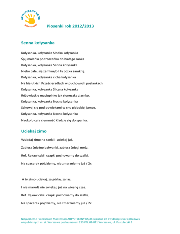 Piosenki rok 2012/2013 Senna kołysanka Kołysanka, kołysanka Słodka kołysanka Śpij maleńki po troszeńku do białego ranka Kołysanka, kołysanka Senna kołysanka Niebo całe, się zamknęło I ty oczka zamknij. Kołysanka, kołysanka cicha kołysanka Na bielutkich Prześcieradłach w puchowych posłankach Kołysanka, kołysanka Śliczna kołysanka Różowiutkie maciupinko jak słoneczka ziarnko. Kołysanka, kołysanka Nocna kołysanka Schowaj się pod powiekami w snu głębokiej jamce. Kołysanka, kołysanka Nocna kołysanka Naokoło cała ciemność Kładzie się do spanka. Uciekaj zimo Wsiadaj zimo na sanki i uciekaj już. Zabierz śnieżne bałwanki, zabierz śniegi mróz. Ref. Rękawiczki i czapki pochowamy do szafki, Na spacerek pójdziemy, nie zmarzniemy już / 2x A ty zimo uciekaj, za górkę, za las, I nie marudź nie zwlekaj, już na wiosnę czas. Ref. Rękawiczki i czapki pochowamy do szafki, Na spacerek pójdziemy, nie zmarzniemy już / 2x Niepubliczne Przedszkole Montessori ARTYSTYCZNY KĄCIK wpisane do ewidencji szkół i placówek niepublicznych m. st. Warszawa pod numerem 253 PN, 02-811 Warszawa, ul. Pustułeczki 8 Piosenki rok 2012/2013 Zielone ufoludki Mój brat wciąż czyta o kosmitach, Gwiazdach, planetach i orbitach. O niczym innym nie chce słyszeć, Nawet do UFO listy pisze. Wreszcie zasłużył na nagrodę I latający ujrzał spodek, Bo wylądował dziś w ogródku Pojazd zielonych ufoludków. Zielone włosy, zielone butki, Całe zielone są ufoludki. Zielone włosy, zielone butki, Całe zielone są ufoludki. Kot na ich widok zaraz zmyka, Dziwnego boi się ludzika. Pierwszy kot przykrył nos ogonem, Może to gryzie to zielone. A czym się żywi śmieszny tworek? Czy zjedzą z nami podwieczorek? Kompot dostały, tort dostały, Zjadły, wypiły, odleciały. Zielone włosy, zielone butki, Całe zielone są ufoludki. Zielone włosy, zielone butki… Zielone włosy, zielone butki, Całe zielone są ufoludki. Zielone włosy, zielone butki, Całe zielone są ufoludki. Niepubliczne Przedszkole Montessori ARTYSTYCZNY KĄCIK wpisane do ewidencji szkół i placówek niepublicznych m. st. Warszawa pod numerem 253 PN, 02-811 Warszawa, ul. Pustułeczki 8 Piosenki rok 2012/2013 Popatrzcie na jamniczka 1.Popatrzcie na jamniczka wyturlał się z koszyczka zaczaił się na babcię i porwał babci kapcie ref; A jak spał, a jak spał taką grzeczną minę miał 2x 2. Poszarpał chustkę w róże i zrobił dwie kałuże i moją nową lalkę zaciągnął pod wersalkę ref; Bo jak spał, bo jak spał taką grzeczną minę miał 2x 3. A teraz gdzieś ucieka I szczeka, szczeka, szczeka Łapiemy więc jamniczka Niech wraca do koszyczka ref; A jak spał, a jak spał taką grzeczną minę miał 2x 4. Pod stołem jest koszyczek W koszyczku śpi jamniczek Jamniczek sobie śpi, PSS… Jak się zbudzi będzie zły HAU HAU HAU...! Niepubliczne Przedszkole Montessori ARTYSTYCZNY KĄCIK wpisane do ewidencji szkół i placówek niepublicznych m. st. Warszawa pod numerem 253 PN, 02-811 Warszawa, ul. Pustułeczki 8 Piosenki rok 2012/2013 Ogórek ogórek Wesoło jesienią w ogródku na grządce, Tu ruda marchewka tam strączek, Tu dynia jak słońce, tam główka sałaty, A w kącie ogórek wąsaty. Ref.: Ogórek, ogórek, ogórek, Zielony ma garniturek, I czapkę i sandały, Zielony, zielony jest cały. Czasami jesienią na grządkę w ogrodzie, Deszczowa pogoda przychodzi, Parasol ma w ręku, konewkę ma z chmur, I deszczem podlewa ogórki. Tak się zachmurzyło… Tak się zachmurzyło, słonko się ukryło pada pada śnieżek biały dawno go nie było. /x2 Chodźmy na saneczki, chłopcy i dzieweczki pojedziemy wszyscy razem z wysokiej góreczki. x2 Pędzimy pędzimy, nic się nie boimy aż tu naraz bęc! - na śnieżek i wszyscy leżymy. /x2 Niepubliczne Przedszkole Montessori ARTYSTYCZNY KĄCIK wpisane do ewidencji szkół i placówek niepublicznych m. st. Warszawa pod numerem 253 PN, 02-811 Warszawa, ul. Pustułeczki 8 Piosenki rok 2012/2013 Jesienny kujawiaczek Jesienny kujawiaczek na skakance z wiatru skacze, płaszczyk ma w deszczowych kropkach, daj mu uśmiech, gdy go spotkasz. Ref. : Kujawiak, kujawiaczek la, la, la, la, la , la, la, la, la, la. Kujawiak, kujawiaczek ..... Pingwiny – piosenka/zabawa Och jak przyjemnie, I jak wesoło, W pingwina bawić Się, się, się. Raz nóżka w lewo, Raz nóżka w prawo, Do przodu, do tyłu, I raz, dwa, trzy. Podstawa: dzieci stoją w szeregu, łapią się w pasie i śpiewają ruszając: Na „Się, się, się” – podskakują trzy razy do przodu, Raz nóżka w lewo – wystawiamy lewą nogę, Raz nóżka w prawo – wystawiamy prawą nogę, Do przodu – podskakujemy raz do przodu, Do tyłu – podskakujemy raz do tyłu, I raz, dwa, trzy – podskakujemy trzy razy do przodu. Niepubliczne Przedszkole Montessori ARTYSTYCZNY KĄCIK wpisane do ewidencji szkół i placówek niepublicznych m. st. Warszawa pod numerem 253 PN, 02-811 Warszawa, ul. Pustułeczki 8 Piosenki rok 2012/2013 Tańczymy labada – piosenka/zabawa Tańczymy labada labada, labada, Tańczymy labada, małego walczyka. Tańczą go starszaki, starszaki, starszaki, Tańczą go starszaki i małe dzieci też. Poruszamy się po obwodzie koła, krokiem dostawnym trzymając się za ręce. Mówimy tekst: Rączki były? (pokazujemy) Były! (pokazujemy) Włoski były? (pokazujemy) Nie! (itd) Dwóm tańczyć się zachciało – piosenka/zabawa Dobieramy się w pary i tańcząc (w kółko, pod rękę itp.) śpiewamy: Dwóm tańczyć się zachciało, zachciało, zachciało Lecz im się nie udało fari fari fara Przerywamy taniec, i udając kłótnię (machanie rękami itp.) śpiewamy dalej: Kłócili się ze sobą, ze sobą, ze sobą: Ja nie chcę tańczyć z Tobą! (tupiąc nogą) fari fari fara Wszystkie pary się rozłączają, po czym tworzą się nowe i śpiewamy: Poszukam se innego, innego, innego, Do tańca zgrabniejszego, fari fari fara Niepubliczne Przedszkole Montessori ARTYSTYCZNY