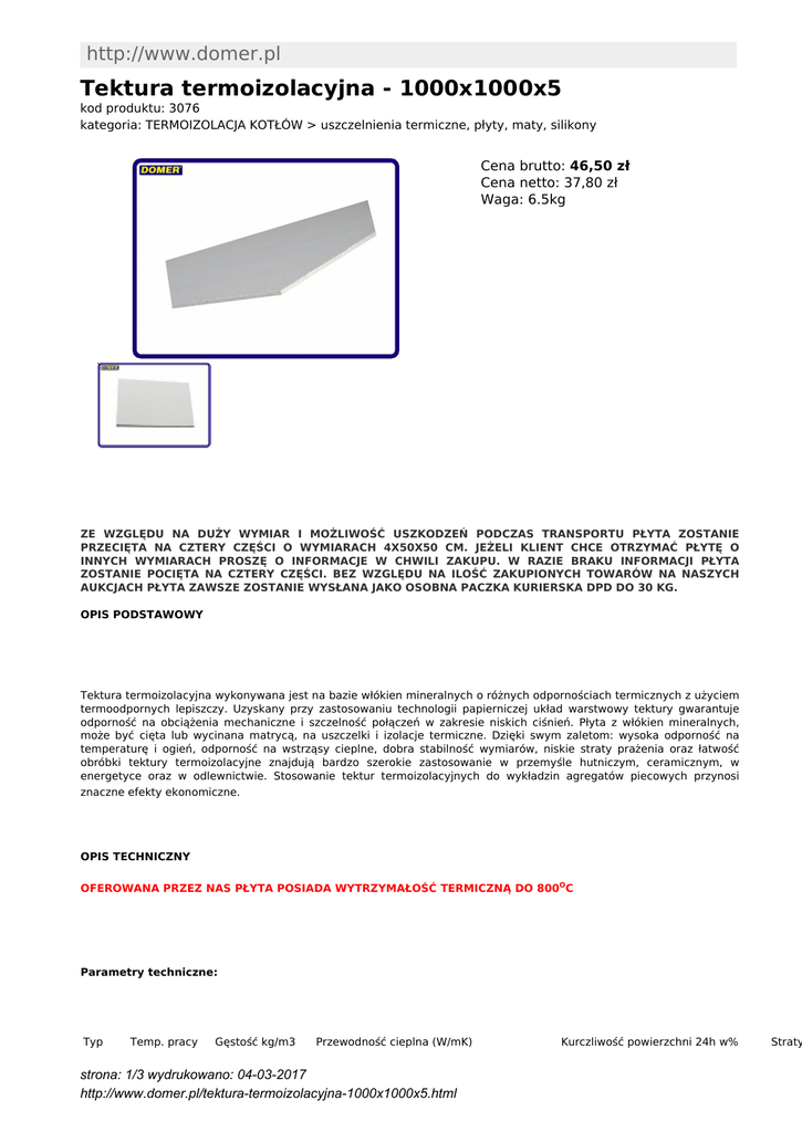 http://www.domer.pl Tektura termoizolacyjna - 1000x1000x5 kod produktu: 3076 kategoria: TERMOIZOLACJA KOTŁÓW > uszczelnienia termiczne, płyty, maty, silikony Cena brutto: 46,50 zł Cena netto: 37,80 zł Waga: 6.5kg ZE WZGLĘDU NA DUŻY WYMIAR I MOŻLIWOŚĆ USZKODZEŃ PODCZAS TRANSPORTU PŁYTA ZOSTANIE PRZECIĘTA NA CZTERY CZĘŚCI O WYMIARACH 4X50X50 CM. JEŻELI KLIENT CHCE OTRZYMAĆ PŁYTĘ O INNYCH WYMIARACH PROSZĘ O INFORMACJE W CHWILI ZAKUPU. W RAZIE BRAKU INFORMACJI PŁYTA ZOSTANIE POCIĘTA NA CZTERY CZĘŚCI. BEZ WZGLĘDU NA ILOŚĆ ZAKUPIONYCH TOWARÓW NA NASZYCH AUKCJACH PŁYTA ZAWSZE ZOSTANIE WYSŁANA JAKO OSOBNA PACZKA KURIERSKA DPD DO 30 KG. OPIS PODSTAWOWY Tektura termoizolacyjna wykonywana jest na bazie włókien mineralnych o różnych odpornościach termicznych z użyciem termoodpornych lepiszczy. Uzyskany przy zastosowaniu technologii papierniczej układ warstwowy tektury gwarantuje odporność na obciążenia mechaniczne i szczelność połączeń w zakresie niskich ciśnień. Płyta z włókien mineralnych, może być cięta lub wycinana matrycą, na uszczelki i izolacje termiczne. Dzięki swym zaletom: wysoka odporność na temperaturę i ogień, odporność na wstrząsy cieplne, dobra stabilność wymiarów, niskie straty prażenia oraz łatwość obróbki tektury termoizolacyjne znajdują bardzo szerokie zastosowanie w przemyśle hutniczym, ceramicznym, w energetyce oraz w odlewnictwie. Stosowanie tektur termoizolacyjnych do wykładzin agregatów piecowych przynosi znaczne efekty ekonomiczne. OPIS TECHNICZNY OFEROWANA PRZEZ NAS PŁYTA POSIADA WYTRZYMAŁOŚĆ TERMICZNĄ DO 800OC Parametry techniczne: Typ Temp. pracy Gęstość kg/m3 Przewodność cieplna (W/mK) strona: 1/3 wydrukowano: 04-03-2017 http://www.domer.pl/tektura-termoizolacyjna-1000x1000x5.html Kurczliwość powierzchni 24h w% Straty 400°C 600°C 800°C 1000°C 1200 1200°C 350 0,09 0,12 0,15 0,19 2,8 (11 OO°C) 8 1400 1400°C 300 0,08 0,11 0,15 - 3,0 (1400°C) 7,5 800 850°C 370 0,1 0,11 0,14 - 2,5 (850°C) 9 F Skład chemiczny w % or m at w m m 1 2 0 0( 6 1 O )x 1 0 0 0 x 3, 4, 5, 6, 8, 1 0, 1 2, 1 3 1 2 0 0( 6 1 O strona: 2/3 wydrukowano: 04-03-2017 http://www.domer.pl/tektura-termoizolacyjna-1000x1000x5.html )x 1 0 0 0 x 3, 4, 5, 6, 8, 1 0, 1 2, 1 8, 2 0, 2 5 1 2 0 0( 6 1 O )x 1 0 0 0 x 3, 4, 5, 6, 8, 1 0, 1 2, 1 3 WYMIARY Szeroko??: 1000 mm D?ugo??: 1000 mm Grubo??: 5 mm strona: 3/3 wydrukowano: 04-03-2017 http://www.domer.pl/tektura-termoizolacyjna-1000x1000x5.html