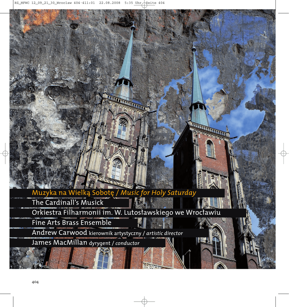 RZ_MFWC 12_09_21_30_Wroclaw 404-411:01 22.08.2008 5:35 Uhr Seite 404 Muzyka na Wielką Sobotę / Music for Holy Saturday The Cardinall’s Musick Orkiestra Filharmonii im. W. Lutosławskiego we Wrocławiu Fine Arts Brass Ensemble Andrew Carwood kierownik artystyczny / artistic director James MacMillan dyrygent / conductor 404 22.08.2008 5:35 Uhr Seite 405 Piątek / Friday Wrocław 12.09.2008 godz. 21.30 / 9.30 pm Kolegiata Świętego Krzyża Pl. Kościelny 1 godz. 21.30 / Muzyka na Wielką Sobotę / Music for Holy Saturday 9.30 pm RZ_MFWC 12_09_21_30_Wroclaw 404-411:01 Wykonawcy / Performers Pt / Fr 12.09.2008 The Cardinall’s Music Orkiestra Filharmonii im. W. Lutosławskiego we Wrocławiu Symphony Orchestra of W. Lutosławski Philharmonic in Wrocław Fine Arts Brass Ensemble Andrew Carwood kierownik artystyczny / artistic director James MacMillan dyrygent / conductor Program koncertu / Concert programme Lamentacje na Wielką Sobotę / Lamentations for Holy Saturday John Browne – Stabat Mater (1450-1498) Robert White (c. 1538-1574) Lamentations I James MacMillan (b. 1959) – “Triduum” part III – Symphony “Vigil” Czas trwania koncertu / duration of the concert c. 1:20 SPONSOR 405 RZ_MFWC 12_09_21_30_Wroclaw 404-411:01 Wrocław 22.08.2008 5:36 Uhr Seite 406 Kolegiata Świętego Krzyża Triduum James MacMillan Czy we współczesnym świecie artysta może kształtować Can an artist in the modern world shape art according sztukę w zależności od swoich przekonań religijnych? to religious belief and practice? Many people in the West Wielu mieszkańców Zachodu jest temu przeciwnych think not, and that it is a strange and undesirable mo- i uważa podobne działania za dziwaczne i niestosowne. tivation. Can liturgical experience be the catalyst for Czy doświadczenia religijne mogą być siłą napędową further artistic exploration and creativity? Again many twórczości artystycznej? Znów wielu jest temu przeciw- think not, seeing the whole intention and inclination as nych, uważając intencje podobnych działań za wątpliwe. a dubious business. How then, must now we view the ar- Jak więc obecnie należy traktować artystyczne tradycje tistic traditions of Europe, deeply rooted as they are in Europy, głęboko zakorzenione w wierze i tradycji chrze- Christian belief and tradition? Are the profoundly reli- ścijańskiej? Czy zatem głęboko religijne w swym cha- gious sensibilities of Josquin, Palestrina, Bach, Mozart rakterze dzieła Josquina, Palestriny, Bacha, Mozarta, Schubert, Bruckner and all now merely to be appraised Schuberta, Brucknera i im podobnych artystów mają być through the dusty detachment of the museum? Can we podziwiane jedynie w zakurzonych muzeach? Czy te dzieła only see their work now through the prism of modern or powinniśmy oceniać wyłącznie przez pryzmat współczes- post-modern aesthetics, where the original “extra-mu- nej czy też postmodernistycznej estetyki, w której pier- sical” motivations are dismissed as the inevitably pri- wotne, pozamuzyczne inspiracje są lekceważone jako mitive instincts of a redundant sensibility? prymitywny wyraz nadmiernej wrażliwości? If so, then the arrogance and ignorance of modernity Jeśli tak, to arogancja i ignorancja współczesności z całą has surely triumphed. It is imperative to the secular pro- pewnością zatriumfowała. Konieczne jest, by w każdym ject that our Christian heritage must be seen through świeckim projekcie dziedzictwo chrześcijańskie trakto- objective separation, where the object can be appraised wano jako coś odrębnego, gdzie dana rzecz może być without ever having to consider its historical and philo- podziwiana bez konieczności brania pod uwagę histo- sophical shaping ingredients. This allows the cultural rycznych i filozoficznych tradycji, które ją ukształtowały. elites to put our religious heritage in the dustbin of Pozwala to elitom kulturalnym wyrzucić swoje religijne history, while robbing its grave of all its beautiful arte- dziedzictwo na śmietnik historii i jednocześnie zawłasz- facts. This is the modern incarnation of the colonial spirit czyć wszystkie jego piękne świadectwa. Jest to wyraźnie writ large. It is as depressing in its nihilism as it is skewed współczesne wcielenie kolonialnego ducha, zarówno in its monumental propagandistic bias. przygnębiające w swym nihilizmie, jak i spaczone przez There is another way to see the tradition and practice of swoje ogromne uprzedzenia propagandowe. shaping art according to religious belief, and that is to 406 RZ_MFWC 12_09_21_30_Wroclaw 404-411:01 22.08.2008 5:36 Uhr Seite 407 12.09.2008 godz. 21.30 / 9.30 pm has not withered when we come to analyse the steady dostrzeganie ciągłego rozwoju i ewolucji kultury. Anali- and constant search for the sacred in modernity, and zując nieustające poszukiwanie świętości w nowoczes- especially in the music of the last 100 years or so. In music, ności, a szczególnie w muzyce ostatnich 100 lat, mo- more than the other arts, there has been a constant żemy dojść do wniosku, że wiara nie umarła. W muzyce, stream of composers who were, and still are, profoundly bardziej niż w innych dziedzinach sztuki, istnieje stała religious men and women. In different ways we see a liczba kompozytorów, którzy byli i nadal są osobami core unity in the widespread search for sanctity in the głęboko wierzącymi. Na różne sposoby, w dziełach takich work of Stravinsky, Schoenberg, Messiaen, Cage, Britten, artystów jak choćby Strawiński, Schönberg, Messiaen, Poulenc, Schnittke, Gubaidulina, Ustvolskaya, Pender- Cage, Britten, Poulenc, Schnittke, Gubaidulina, Ustwolskaja, ecki, Gorecki, Paert, Kanchelli, Tavener and many others. Penderecki, Górecki, Pärt, Kanchelli czy Tavener można In this view we can see the religious principle as being zaobserwować jedność w szeroko zakrojonym poszuki- part of the mainstream of musical modernity, and the wan