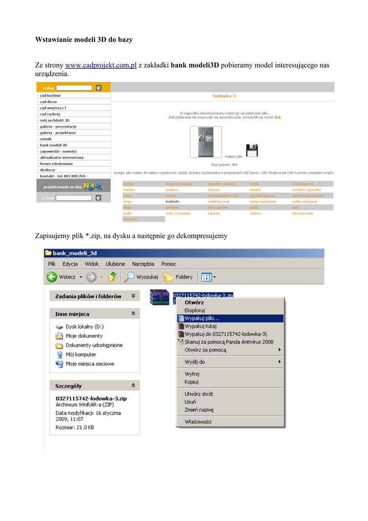 Wstawianie modeli 3D do bazy Ze strony www.cadprojekt.com.pl z zakładki bank modeli3D pobieramy model interesującego nas urządzenia. Zapisujemy plik *.zip, na dysku a następnie go dekompresujemy W efekcie końcowym uzyskujemy dwa plik – jeden z rozszerzeniem dwx, jest to plik modelu – drugi z rozszerzeniem jpg, jest to plik podglądu Uruchamiamy program CAD Decor i przechodzimy do funkcji Wstawianie elementów Następnie wybieramy zakładkę Baza użytkownika klikamy Dodaj, otwiera sie okno Baza uzytkownika Wypełniamy poszczególne pola Plik DWG - plik modelu 3D, program akceptuje trzy formaty plików: – dwg – pliki AutoCad, muszą być w formacie powierzchniowym (siatkowym) – 3ds – pliki 3D Studio – dwx – pliki CAD Projekt Pliki pobierane ze strony www.cadprojekt.com.pl są w formacie dwx. Format pliku wybieramy z listy wyboru Podobnie postępujemy z plikiem podglądu, program akceptuje pliki jpg Następnie opisujemy pozostałe pola i klikamy Dodaj Model dostępny jest w zakładce Baza użytkownika