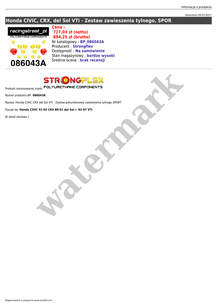 Informacje o produkcie Utworzono 04-03-2017 Honda CIVIC, CRX, del Sol VTi - Zestaw zawieszenia tylnego, SPOR Cena : 727,03 zł (netto) 894,25 zł (brutto) Produkt renomowanej marki Numer produktu BP: 086043A er m ar k Nr katalogowy : BP_086043A Producent : Strongflex Dostępność : Na zamówienie Stan magazynowy : bardzo wysoki Średnia ocena : brak recenzji Nazwa: Honda CIVIC CRX del Sol VTi - Zestaw poliuretanowy zawieszenia tylnego SPORT Pasuje do: Honda CIVIC 91-95 CRX 88-91 del Sol r. 92-97 VTi w at W skład zestawu ( Wygenerowano w programie www.oscGold.com