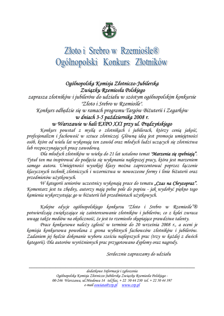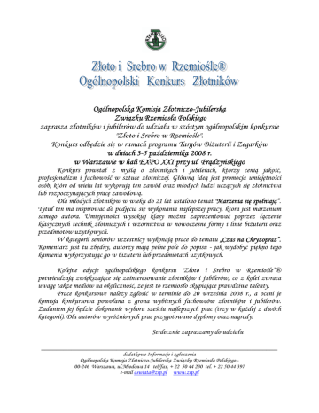 Ogólnopolska Komisja Złotniczo-Jubilerska Związku Rzemiosła Polskiego zaprasza złotników i jubilerów do udziału w szóstym ogólnopolskim konkursie "Złoto i Srebro w Rzemiośle". Konkurs odbędzie się w ramach programu Targów Biżuterii i Zegarków w dniach 3-5 października 2008 r. w Warszawie w hali EXPO XXI przy ul. Prądzyńskiego Konkurs powstał z myślą o złotnikach i jubilerach, którzy cenią jakość, profesjonalizm i fachowość w sztuce złotniczej. Główną ideą jest promocja umiejętności osób, które od wielu lat wykonują ten zawód oraz młodych ludzi uczących się złotnictwa lub rozpoczynających pracę zawodową. Dla młodych złotników w wieku do 21 lat ustalono temat "Marzenia się spełniają”. Tytuł ten ma inspirować do podjęcia się wykonania najlepszej pracy, która jest marzeniem samego autora. Umiejętności wysokiej klasy można zaprezentować poprzez łączenie klasycznych technik złotniczych i wzornictwa w nowoczesne formy i linie biżuterii oraz przedmiotów użytkowych. W kategorii seniorów uczestnicy wykonają prace do tematu „Czas na Chryzopraz”. Komentarz jest tu zbędny, autorzy mają pełne pole do popisu - jak wydobyć piękno tego kamienia wykorzystując go w biżuterii lub przedmiotach użytkowych. Kolejne edycje ogólnopolskiego konkursu "Złoto i Srebro w Rzemiośle”® potwierdzają zwiększające się zainteresowanie złotników i jubilerów, co z kolei zwraca uwagę także mediów na okoliczność, że jest to rzemiosło skupiające prawdziwe talenty. Prace konkursowe należy zgłosić w terminie do 20 września 2008 r., a oceni je komisja konkursowa powołana z grona wybitnych fachowców złotników i jubilerów. Zadaniem jej będzie dokonanie wyboru sześciu najlepszych prac (trzy w każdej z dwóch kategorii). Dla autorów wyróżnionych prac przygotowano dyplomy oraz nagrody. Serdecznie zapraszamy do udziału _______________________________________________________________ dodatkowe Informacje i zgłoszenia Ogólnopolska Komisja Złotniczo-Jubilerska Związku Rzemiosła Polskiego 00-246 Warszawa, ul.Miodowa 14 tel/fax. + 22 50 44 230 tel. + 22 50 44 397 e-mail [email protected] www.zrp.pl Ogólnopolska Komisja Złotniczo-Jubilerska Związku Rzemiosła Polskiego REGULAMIN 1. Organizatorzy: Związek Rzemiosła Polskiego - Ogólnopolska Komisja Złotniczo-Jubilerska 00-246 Warszawa, ul.Miodowa 14 tel/fax.+ 22 50 44 230 tel. + 22 50 44 397 Międzynarodowe Centrum Targowe, Pracownia Sztuk Plastycznych - 03-903 Warszawa, ul.Finlandzka 10 2. Konkurs odbędzie się w okresie trwania jesiennych targów biżuterii i zegarków p.n. Złoto, Srebro, Czas w dniach 3-5 października 2008r. w Warszawie Centrum EXPO XXI ul. Prądzyńskiego 12/14. 3. Podstawowym celem konkursu jest prezentacja kunsztu zawodowego złotników-jubilerów i młodych adeptów tego zawodu, że szczególnym uwzględnieniem umiejętności posługiwania się oraz łączenia tradycyjnych i nowoczesnych technik złotniczych, a także kreowanie autorskiego wzornictwa. 4. Konkurs dotyczy dwóch kategorii wiekowych uczestników; a) JUNIORZY - młodzi złotnicy i jubilerzy w wieku do 21 lat, osoby uczące się zawodu złotnik jubiler na podstawie umowy o pracę w celu przygotowania zawodowego lub w szkole prowadzącej kształcenie zawodowe. Temat prac konkursowych - „MARZENIA SIĘ SPEŁNIAJĄ”. W pracy powinny być zastosowane co najmniej trzy, dowolnie wybrane techniki złotnicze. b) SENIORZY - złotnicy i jubilerzy w wieku powyżej 21 lat, posiadający potwierdzone kwalifikacje zawodowe w zawodzie z branży złotniczej (co najmniej tytuł czeladnika). Temat prac konkursowych seniorzy - „CZAS NA CHRYZOPRAZ”. W pracy konkursowej musi być zastosowany chryzopraz. 5. Do konkursu zakwalifikowane będą przedmioty, zestawy i komplety pełniące funkcje biżuterii wykonane z zastosowaniem różnych technik złotniczych oraz wykorzystaniem metali i kamieni szlachetnych i ozdobnych: - zgłoszone do konkursu prace nie mogą być wcześniej prezentowane, - każda praca musi mieć wypełnioną przez uczestnika, odrębną kartę informacyjną (załącznik do Regulaminu) oraz załączoną do niej fotografię (najlepiej w technice cyfrowej), - każdy uczestnik może zgłosić do konkursu nie więcej niż trzy prace, - prace składane są w biurze Związku Rzemiosła Polskiego w Warszawie ul. Miodowa 14 (godz. 8.00-16.00) wraz z wypełnionymi kartami informacyjnymi i załączonymi fotografiami w terminie do 18 września 2008 r. 6. Ocena prac - w dniu 19 września 2008 r. dokona pięcioosobowa Komisja Konkursowa. 7. Ogłoszenie wyników - w dniu 4 października 2008 r. godz.15.00 hala EXPO XXI w Warszawie. 8. Zakwalifikowane prace konkursowe zostaną zaprezentowane w czasie Targów, a wyniki Konkursu opublikowane w mediach patronujących Targom. 9. Prace konkursowe należy odebrać w dniu 5 października 2008 r. - stoisko Ogólnopolskiej Komisji ZłotniczoJubilerskiej ZRP (inf. biuro Targów na terenie hali EXPO XXI). 10. Laureaci konkursu otrzymają dyplomy oraz nagrody ufundowane przez sponsorów. Osoba przyjmująca nagrodę, zgodnie z obowiązującymi przepisami, będzie zobowiązana do zapłacenia w dniu jej odebrania w biurze targów, zryczałtowanego podatku dochodowego w wys.10% wartości otrzymanej nagrody. 11. Regulamin Konkursu i karta zgłoszeniowa dostępne na www.zrp.pl lub [email protected]. 12. INFORMACJE: tel./fax. 022 50 44 230, tel. 022 50 44 397 [email protected] (Jolanta Kosakowska) tel. 0 22 617 41 91 w.125 [email protected] (Wanda Gontarska) _______________________________ Warszawa, kwiecień 2008 r. _____________________________ KARTA ZGŁOSZENIOWA pracę konkursową wraz z wypełnioną kartą zgłoszeniową oraz zdjęciem należy złożyć lub przesłać do Związku Rzemiosła Polskiego (OKZ-J ZRP) Warszawa ul.Miodowa 14 tel/fax +22 5044 230 w terminie do 18 września 2008 r. Imię i nazwisko autora ……………………………………