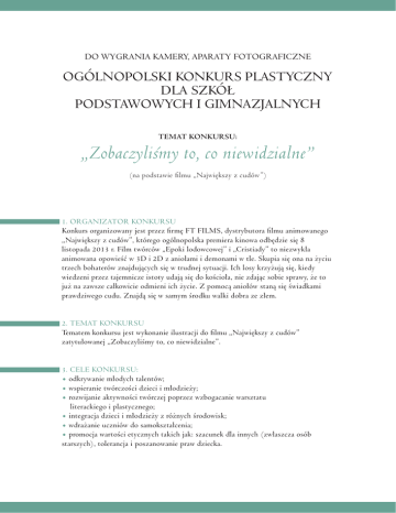 DO WYGRANIA KAMERY, APARATY FOTOGRAFICZNE OGÓLNOPOLSKI KONKURS PLASTYCZNY DLA SZKÓŁ PODSTAWOWYCH I GIMNAZJALNYCH TEMAT KONKURSU: „Zobaczyliśmy to, co niewidzialne” (na podstawie filmu „Największy z cudów”) 1. ORGANIZATOR KONKURSU Konkurs organizowany jest przez firmę FT FILMS, dystrybutora filmu animowanego „Największy z cudów”, którego ogólnopolska premiera kinowa odbędzie się 8 listopada 2013 r. Film twórców „Epoki lodowcowej” i „Cristiady” to niezwykła animowana opowieść w 3D i 2D z aniołami i demonami w tle. Skupia się ona na życiu trzech bohaterów znajdujących się w trudnej sytuacji. Ich losy krzyżują się, kiedy wiedzeni przez tajemnicze istoty udają się do kościoła, nie zdając sobie sprawy, że to już na zawsze całkowicie odmieni ich życie. Z pomocą aniołów staną się świadkami prawdziwego cudu. Znajdą się w samym środku walki dobra ze złem. 2. TEMAT KONKURSU Tematem konkursu jest wykonanie ilustracji do filmu „Największy z cudów” zatytułowanej „Zobaczyliśmy to, co niewidzialne”. 3. CELE KONKURSU: • odkrywanie młodych talentów; • wspieranie twórczości dzieci i młodzieży; • rozwijanie aktywności twórczej poprzez wzbogacanie warsztatu literackiego i plastycznego; • integracja dzieci i młodzieży z różnych środowisk; • wdrażanie uczniów do samokształcenia; • promocja wartości etycznych takich jak: szacunek dla innych (zwłaszcza osób starszych), tolerancja i poszanowanie praw dziecka. 4. UCZESTNICY KONKURSU: W konkursie mogą uczestniczyć uczniowie szkół podstawowych i gimnazjalnych. 5. TECHNIKA PRAC Dowolna technika wykonania prac (rysunek, grafika, malarstwo, kolaż). Nie będą uwzględniane malowidła na szkle i prace z plasteliny. Praca powinna zostać wykonana na papierze lub arkuszu brystolu (nie może przekraczać wymiaru 50cm x 70cm). 6. ZASADY, TRYB I TERMIN PRZEPROWADZENIA KONKURSU • konkurs jest skierowany do uczniów szkół podstawowych i gimnazjalnych; • konkurs podzielony został na trzy kategorie wiekowe: • klasy 0 – 3 szkoły podstawowej, • klasy 4 – 6 szkoły podstawowej, • uczniowie gimnazjum. Każdy uczestnik może zgłosić tylko jedną pracę, natomiast szkoła - dowolną liczbę. Prace prosimy przesłać do końca stycznia 2014 roku (decyduje data stempla pocztowego) z dopiskiem „Zobaczyliśmy to, co niewidoczne” na adres organizatora: FT FILMS Al. Wyzwolenia 21/23 35-501 Rzeszów 7. OCENA PRAC Prace zostaną ocenione przez jury powołane przez organizatorów. Przy ocenie prac komisja bierze pod uwagę: • zgodność prac z tematem konkursu, • oryginalność, pomysłowość, • estetykę i technikę wykonania pracy. 8. JURY KONKURSU W skład jury wchodzą trzy osoby powołane przez organizatora konkursu. 9. NAGRODY W konkursie przewidziano następujące nagrody: • kamerę za zajęcie I miejsca w każdej z kategorii, • aparat fotograficzny za zajęcie II miejsca w każdej z kategorii, • zestaw gier i zabaw komputerowych za zajęcie III miejsca w każdej kategorii, • zestaw książek i słodycze za zdobycie wyróżnienia. UWAGI KOŃCOWE: 1. Prace nieopisane nie będą brane pod uwagę. 2. Autorzy najlepszych prac otrzymają nagrody, wyróżnienia i pamiątkowe dyplomy. 3. Podsumowanie, wręczenie nagród nastąpi w lutym 2013 r. 4. Prace nadesłane na konkurs przechodzą na własność organizatora. 5. Organizator konkursu zastrzega sobie prawo do nieodpłatnej publikacji oraz umieszczenia informacji o wynikach konkursu na stronach internetowych. Prace konkursowe nie podlegają zwrotowi. Organizator zastrzega sobie prawo do ich wystawiania i reprodukowania. 6. Prace wysłane po terminie i niezgodne z regulaminem nie będą brane pod uwagę. 7. Informacje o wynikach konkursu zostaną umieszczone na stronie internetowej www.najwiekszyzcudow.pl do dnia 28 lutego 2013 r. 8. Wszystkie prace będzie można zobaczyć po zakończeniu konkursu na stronie www.najwiekszyzcudow.pl. Szkoły nagrodzonych i wyróżnionych uczniów zostaną powiadomione telefonicznie lub drogą elektroniczną do 28 lutego 2013 roku 9. Nadesłanie pracy wraz z wypełnioną kartą zgłoszenia jest równoznaczne z: oświadczeniem, że uczestnik jest jej autorem; akceptacją regulaminu; wyrażeniem zgody na przetwarzanie danych osobowych do celów związanych z konkursem. 10. Prawni opiekunowie dzieci biorących udział w konkursie wyrażają zgodę na umieszczenie danych osobowych dziecka w bazie Organizatora oraz ich przetwarzanie dla potrzeb konkursu, zgodnie z ustawą z dnia 29.08.1997 r. o ochronie danych osobowych (Dz.U. nr 133, poz. 833). KARTA ZGŁOSZENIA KONKURSU PT. „ZOBACZYLIŚMY TO, CO NIEWIDZIALNE”. (DOTYCZY AUTORA PRACY PLASTYCZNEJ – WYPEŁNIĆ DRUKOWANYMI LITERAMI) PEŁNA NAZWA PLACÓWKI/SZKOŁY ulica miejscowość kod telefon fax e-mail OPIEKUN imię nazwisko ulica miejscowość kod telefon fax e-mail AUTORZY PRACY 1.imię i nazwisko wiek klasa wiek klasa wiek klasa wiek klasa wiek klasa 2.imię i nazwisko 3.imię i nazwisko 4.imię i nazwisko 5.imię i nazwisko Wyrażam zgodę na przetwarzanie i publikację danych osobowych dziecka na potrzeby konkursu. podpis opiekuna (rodzica)