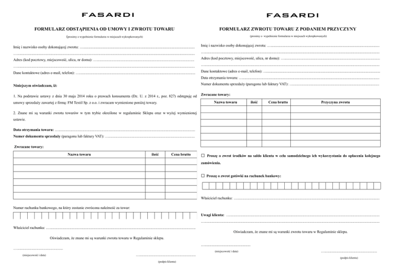 FORMULARZ ODSTĄPIENIA OD UMOWY I ZWROTU TOWARU FORMULARZ ZWROTU TOWARU Z PODANIEM PRZYCZYNY (prosimy o wypełnienie formularza w miejscach wykropkowanych) (prosimy o wypełnienie formularza w miejscach wykropkowanych) Imię i nazwisko osoby dokonującej zwrotu: …....................................................................................................................... Imię i nazwisko osoby dokonującej zwrotu: ….................................................................................................................... ….............................................................................................................................................................................................. …........................................................................................................................................................................................... Adres (kod pocztowy, miejscowość, ulica, nr domu): …........................................................................................................ Adres (kod pocztowy, miejscowość, ulica, nr domu): …...................................................................................................... ….............................................................................................................................................................................................. …........................................................................................................................................................................................... Dane kontaktowe (adres e-mail, telefon): …............................................................................................................................ Dane kontaktowe (adres e-mail, telefon): …......................................................................................................................... Data otrzymania towaru: ….................................................................................................................................................. Niniejszym oświadczam, iż: Numer dokumentu sprzedaży (paragonu lub faktury VAT): …............................................................................................ 1. Na podstawie ustawy z dnia 30 maja 2014 roku o prawach konsumenta (Dz. U. z 2014 r., poz. 827) odstępuję od Zwracane towary: Nazwa towaru umowy sprzedaży zawartej z firmą: FM Textil Sp. z o.o. i zwracam wymienione poniżej towary. ilość Cena brutto Przyczyna zwrotu 2. Znane mi są warunki zwrotu towarów w tym trybie określone w regulaminie Sklepu oraz w wyżej wymienionej ustawie. Data otrzymania towaru: ….................................................................................................................................................. Numer dokumentu sprzedaży (paragonu lub faktury VAT): …............................................................................................ Zwracane towary: Nazwa towaru ilość Cena brutto □ Proszę o zwrot środków na saldo klienta w celu samodzielnego ich wykorzystania do opłacenia kolejnego zamówienia. □ Proszę o zwrot gotówki na rachunek bankowy: Właściciel rachunku: …........................................................................................................................................................ Numer rachunku bankowego, na który zostanie zwrócona należność za towar: Uwagi klienta: …................................................................................................................................................................ …........................................................................................................................................................................................... Właściciel rachunku: …............................................................................................................................................................ Oświadczam, że znane mi są warunki zwrotu towaru w Regulaminie sklepu. Oświadczam, że znane mi są warunki zwrotu towaru w Regulaminie sklepu. …................................................. …................................................. (miejscowość i data) …............................................................ (podpis klienta) (miejscowość i data) …........................................................ (podpis klienta)