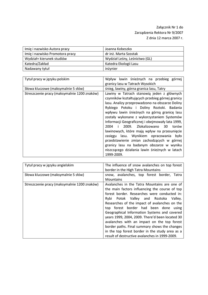 Załącznik Nr 1 do Zarządzenia Rektora Nr 9/2007 Z dnia 12 marca 2007 r. Imię i nazwisko Autora pracy Imię i nazwisko Promotora pracy Wydział+ kierunek studiów Katedra/Zakład Nadawany tytuł Joanna Kobeszko dr inż. Marta Szostak Wydział Leśny, Leśnictwo (GL) Katedra Ekologii Lasu inżynier Tytuł pracy w języku polskim Wpływ lawin śnieżnych na przebieg górnej granicy lasu w Tatrach Wysokich śnieg, lawiny, górna granica lasu, Tatry Lawiny w Tatrach stanowią jeden z głównych czynników kształtujących przebieg górnej granicy lasu. Analizy przeprowadzono na obszarze Doliny Rybiego Potoku i Doliny Roztoki. Badania wpływu lawin śnieżnych na górną granicę lasu zostały wykonane z wykorzystaniem Systemów Informacji Geograficznej i obejmowały lata 1999, 2004 i 2009. Zlokalizowano 30 torów lawinowych, które mają wpływ na przesunięcie zasięgu lasu. Wynikiem opracowania było przedstawienie zmian zachodzących w górnej granicy lasu na badanym obszarze w wyniku niszczącego działania lawin śnieżnych w latach 1999-2009. Słowa kluczowe (maksymalnie 5 słów) Streszczenie pracy (maksymalnie 1200 znaków) Tytuł pracy w języku angielskim Słowa kluczowe (maksymalnie 5 słów) Streszczenie pracy (maksymalnie 1200 znaków) The influence of snow avalanches on top forest border in the High Tatra Mountains snow, avalanches, top forest border, Tatra Mountains Avalanches in the Tatra Mountains are one of the main factors influencing the course of top forest border. Researches were conducted in: Rybi Potok Valley and Roztoka Valley. Researches of the impact of avalanches on the top forest border had been done using Geographical Information Systems and covered years 1999, 2004, 2009. There’d been located 30 avalanches with an impact on the top forest border paths. Final summary shows the changes in the top forest border in the study area as a result of destructive avalanches in 1999-2009.