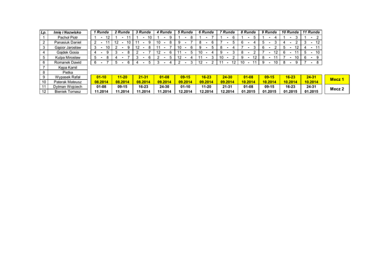 Lp. 1 2 3 4 5 6 7 8 9 10 11 12 Imię i Nazwisko Pachoł Piotr Panasiuk Daniel Gąsior Jarosław Gajdek Gosia Kulpa Mirosław Romanek Dawid Kępa Kamil Pietka Wypasek Rafał Paterak Mateusz Dytman Wojciech Bieniek Tomasz 1 Runda 1 - 12 2 - 11 3 - 10 4 - 9 5 - 8 6 - 7 2 Runda 1 - 11 12 - 10 2 - 9 3 - 8 4 - 7 5 - 6 3 Runda 1 - 10 11 - 9 12 - 8 2 - 7 3 - 6 4 - 5 4 Runda 1 - 9 10 - 8 11 - 7 12 - 6 2 - 5 3 - 4 5 Runda 1 - 8 9 - 7 10 - 6 11 - 5 12 - 4 2 - 3 6 Runda 1 - 7 8 - 6 9 - 5 10 - 4 11 - 3 12 - 2 7 Runda 1 - 6 7 - 5 8 - 4 9 - 3 10 - 2 11 - 12 8 Runda 1 - 5 6 - 4 7 - 3 8 - 2 9 - 12 10 - 11 9 Runda 1 - 4 5 - 3 6 - 2 7 - 12 8 - 11 9 - 10 10 Runda 1 - 3 4 - 2 5 - 12 6 - 11 7 - 10 8 - 9 11 Runda 1 - 2 3 - 12 4 - 11 5 - 10 6 - 9 7 - 8 01-10 08.2014 01-08 11.2014 11-20 08.2014 09-15 11.2014 21-31 08.2014 16-23 11.2014 01-08 09.2014 24-30 11.2014 09-15 09.2014 01-10 12.2014 16-23 09.2014 11-20 12.2014 24-30 09.2014 21-31 12.2014 01-08 10.2014 01-08 01.2015 09-15 10.2014 09-15 01.2015 16-23 10.2014 16-23 01.2015 24-31 10.2014 24-31 01.2015 Mecz 1 Mecz 2