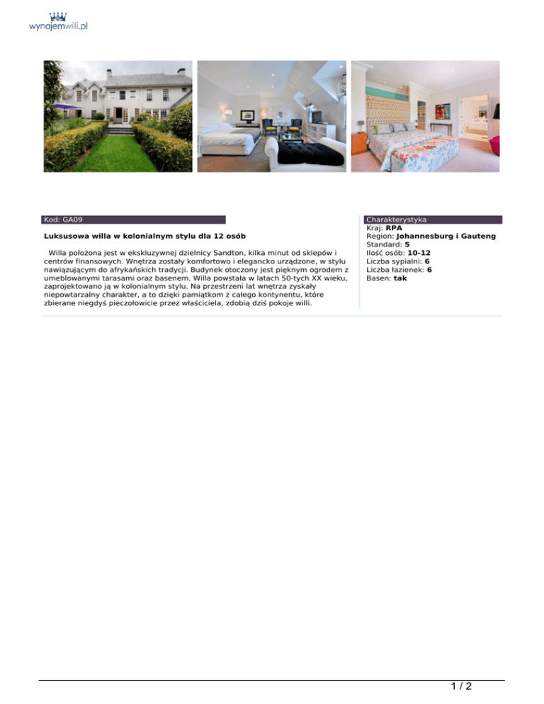 Kod: GA09 Luksusowa willa w kolonialnym stylu dla 12 osób Willa położona jest w ekskluzywnej dzielnicy Sandton, kilka minut od sklepów i centrów finansowych. Wnętrza zostały komfortowo i elegancko urządzone, w stylu nawiązującym do afrykańskich tradycji. Budynek otoczony jest pięknym ogrodem z umeblowanymi tarasami oraz basenem. Willa powstała w latach 50-tych XX wieku, zaprojektowano ją w kolonialnym stylu. Na przestrzeni lat wnętrza zyskały niepowtarzalny charakter, a to dzięki pamiątkom z całego kontynentu, które zbierane niegdyś pieczołowicie przez właściciela, zdobią dziś pokoje willi. Charakterystyka Kraj: RPA Region: Johannesburg i Gauteng Standard: 5 Ilość osób: 10-12 Liczba sypialni: 6 Liczba łazienek: 6 Basen: tak 1/2 Zakwaterowanie: 6 przestronnych, dwuosobowych sypialni z widokiem na ogród. Pokoje są duże, luksusowe, posiadają łazienki z wanną i prysznicem, telewizory, DVD. Centrum willi stanowi sala balowa wyposażona w komfortowe meble i bar oraz wyjście na taras z widokiem na ogród i basen. Na parterze znajduje się też gabinet z książkami, wygodnymi kanapami i kominkiem, jadalnia dla 12 osób z wyjściem na taras, sala śniadaniowa, przestronna, wyposażona kuchnia, taras z meblami wypoczynkowymi i stołem do posiłków na świeżym powietrzu służy za zewnętrzny salon. Wyposażenie: Telewizory i DVD w sypialniach, telewizor i kominek w gabinecie, basen, kort tenisowy, system stereo z głośnikami w całej willi i na tarasie, garaż z dwoma luksusowymi autami i kierowcą do dyspozycji gości, parking na 8 aut, niewielka siłownia, system alarmowy monitorowany przez ochronę. Lokalizacja: Johannesburg, Gauteng. W pobliżu restauracji, centrów handlowych, klubów, atrakcji turystycznych, muzeów. Dodatkowe usługi: Codzienne sprzątanie, pralnia, śniadania, napoje i przekąski, kierowca, transfery z i na lotnisko, na życzenie prywatne lekcje tenisa i instruktor fitness Cena za tydzień wynajmu: Na zapytanie. 2/2 Powered by TCPDF (www.tcpdf.org)