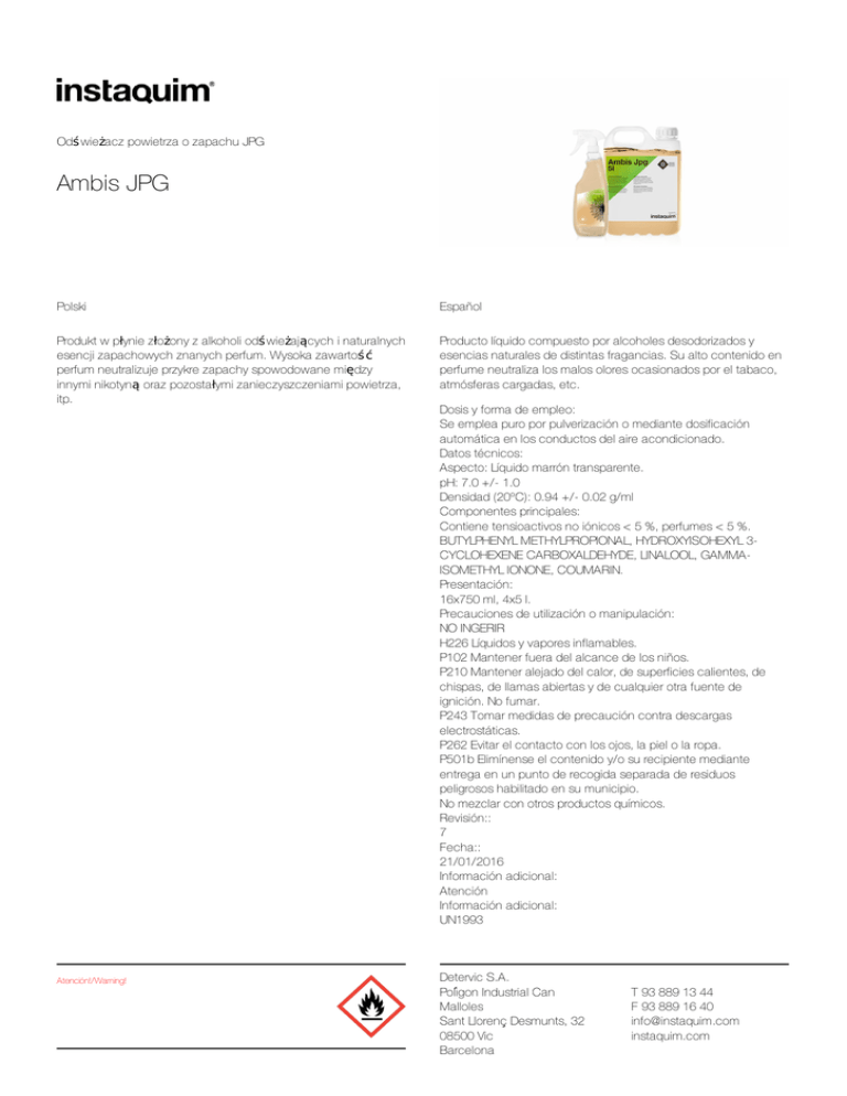 Odś wieżaczpowietrzaozapachuJPG AmbisJPG Polski Español Produktwpłyniezłożonyzalkoholiodś wieżającychinaturalnych esencjizapachowychznanychperfum.Wysokazawartoś ć perfumneutralizujeprzykrezapachyspowodowanemiędzy innyminikotynąorazpozostałymizanieczyszczeniamipowietrza, itp. Productolíquidocompuestoporalcoholesdesodorizadosy esenciasnaturalesdedistintasfragancias.Sualtocontenidoen perfumeneutralizalosmalosoloresocasionadosporeltabaco, atmósferascargadas,etc. Atención!/Warning! Dosisyformadeempleo: Seempleapuroporpulverizaciónomediantedosificación automáticaenlosconductosdelaireacondicionado. Datostécnicos: Aspecto:Líquidomarróntransparente. pH:7.0+/-1.0 Densidad(20ºC):0.94+/-0.02g/ml Componentesprincipales: Contienetensioactivosnoiónicos<5%,perfumes<5%. BUTYLPHENYLMETHYLPROPIONAL,HYDROXYISOHEXYL3CYCLOHEXENECARBOXALDEHYDE,LINALOOL,GAMMAISOMETHYLIONONE,COUMARIN. Presentación: 16x750ml,4x5l. Precaucionesdeutilizaciónomanipulación: NOINGERIR H226Líquidosyvaporesinflamables. P102Mantenerfueradelalcancedelosniños. P210Manteneralejadodelcalor,desuperficiescalientes,de chispas,dellamasabiertasydecualquierotrafuentede ignición.Nofumar. P243Tomarmedidasdeprecaucióncontradescargas electrostáticas. P262Evitarelcontactoconlosojos,lapielolaropa. P501bElimínenseelcontenidoy/osurecipientemediante entregaenunpuntoderecogidaseparadaderesiduos peligrososhabilitadoensumunicipio. Nomezclarconotrosproductosquímicos. Revisión:: 7 Fecha:: 21/01/2016 Informaciónadicional: Atención Informaciónadicional: UN1993 DetervicS.A. PolígonIndustrialCan Malloles SantLlorençDesmunts,32 08500Vic Barcelona T938891344 F938891640 [email protected] instaquim.com