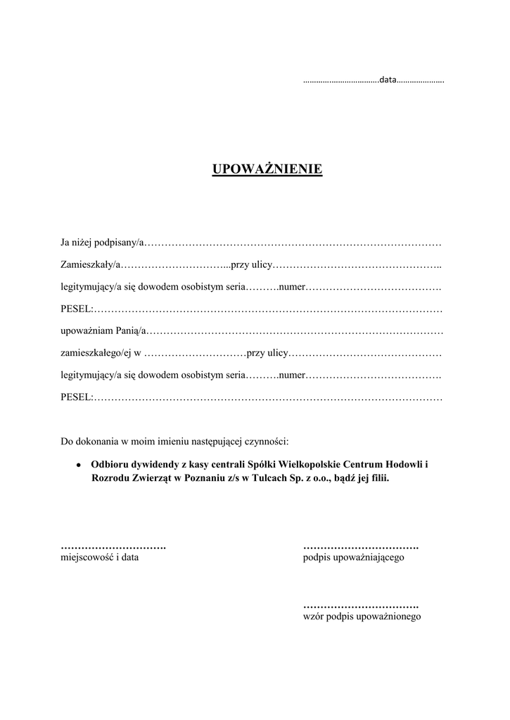 ………….………………….data…………………. UPOWAŻNIENIE Ja niżej podpisany/a…………………………………………………………………………… Zamieszkały/a…………………………...przy ulicy………………………………………….. legitymujący/a się dowodem osobistym seria……….numer…………………………………. PESEL:………………………………………………………………………………………… upoważniam Panią/a…………………………………………………………………………… zamieszkałego/ej w …………………………przy ulicy……………………………………… legitymujący/a się dowodem osobistym seria……….numer…………………………………. PESEL:………………………………………………………………………………………… Do dokonania w moim imieniu następującej czynności: Odbioru dywidendy z kasy centrali Spółki Wielkopolskie Centrum Hodowli i Rozrodu Zwierząt w Poznaniu z/s w Tulcach Sp. z o.o., bądź jej filii. …………………………. miejscowość i data ……………………………. podpis upoważniającego ……………………………. wzór podpis upoważnionego