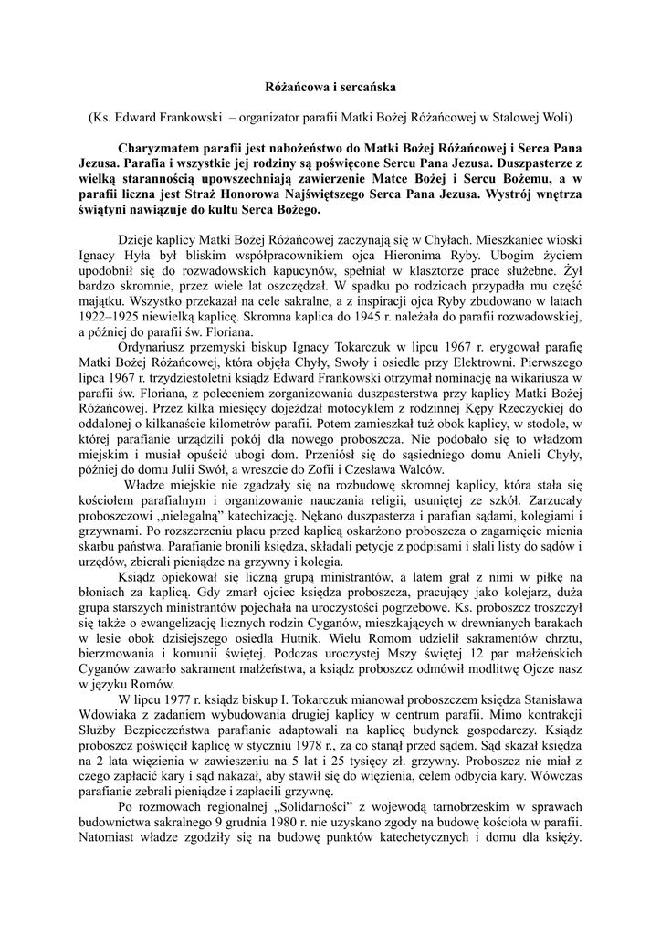 Różańcowa i sercańska (Ks. Edward Frankowski – organizator parafii Matki Bożej Różańcowej w Stalowej Woli) Charyzmatem parafii jest nabożeństwo do Matki Bożej Różańcowej i Serca Pana Jezusa. Parafia i wszystkie jej rodziny są poświęcone Sercu Pana Jezusa. Duszpasterze z wielką starannością upowszechniają zawierzenie Matce Bożej i Sercu Bożemu, a w parafii liczna jest Straż Honorowa Najświętszego Serca Pana Jezusa. Wystrój wnętrza świątyni nawiązuje do kultu Serca Bożego. Dzieje kaplicy Matki Bożej Różańcowej zaczynają się w Chyłach. Mieszkaniec wioski Ignacy Hyła był bliskim współpracownikiem ojca Hieronima Ryby. Ubogim życiem upodobnił się do rozwadowskich kapucynów, spełniał w klasztorze prace służebne. Żył bardzo skromnie, przez wiele lat oszczędzał. W spadku po rodzicach przypadła mu część majątku. Wszystko przekazał na cele sakralne, a z inspiracji ojca Ryby zbudowano w latach 1922–1925 niewielką kaplicę. Skromna kaplica do 1945 r. należała do parafii rozwadowskiej, a później do parafii św. Floriana. Ordynariusz przemyski biskup Ignacy Tokarczuk w lipcu 1967 r. erygował parafię Matki Bożej Różańcowej, która objęła Chyły, Swoły i osiedle przy Elektrowni. Pierwszego lipca 1967 r. trzydziestoletni ksiądz Edward Frankowski otrzymał nominację na wikariusza w parafii św. Floriana, z poleceniem zorganizowania duszpasterstwa przy kaplicy Matki Bożej Różańcowej. Przez kilka miesięcy dojeżdżał motocyklem z rodzinnej Kępy Rzeczyckiej do oddalonej o kilkanaście kilometrów parafii. Potem zamieszkał tuż obok kaplicy, w stodole, w której parafianie urządzili pokój dla nowego proboszcza. Nie podobało się to władzom miejskim i musiał opuścić ubogi dom. Przeniósł się do sąsiedniego domu Anieli Chyły, później do domu Julii Swół, a wreszcie do Zofii i Czesława Walców. Władze miejskie nie zgadzały się na rozbudowę skromnej kaplicy, która stała się kościołem parafialnym i organizowanie nauczania religii, usuniętej ze szkół. Zarzucały proboszczowi „nielegalną” katechizację. Nękano duszpasterza i parafian sądami, kolegiami i grzywnami. Po rozszerzeniu placu przed kaplicą oskarżono proboszcza o zagarnięcie mienia skarbu państwa. Parafianie bronili księdza, składali petycje z podpisami i słali listy do sądów i urzędów, zbierali pieniądze na grzywny i kolegia. Ksiądz opiekował się liczną grupą ministrantów, a latem grał z nimi w piłkę na błoniach za kaplicą. Gdy zmarł ojciec księdza proboszcza, pracujący jako kolejarz, duża grupa starszych ministrantów pojechała na uroczystości pogrzebowe. Ks. proboszcz troszczył się także o ewangelizację licznych rodzin Cyganów, mieszkających w drewnianych barakach w lesie obok dzisiejszego osiedla Hutnik. Wielu Romom udzielił sakramentów chrztu, bierzmowania i komunii świętej. Podczas uroczystej Mszy świętej 12 par małżeńskich Cyganów zawarło sakrament małżeństwa, a ksiądz proboszcz odmówił modlitwę Ojcze nasz w języku Romów. W lipcu 1977 r. ksiądz biskup I. Tokarczuk mianował proboszczem księdza Stanisława Wdowiaka z zadaniem wybudowania drugiej kaplicy w centrum parafii. Mimo kontrakcji Służby Bezpieczeństwa parafianie adaptowali na kaplicę budynek gospodarczy. Ksiądz proboszcz poświęcił kaplicę w styczniu 1978 r., za co stanął przed sądem. Sąd skazał księdza na 2 lata więzienia w zawieszeniu na 5 lat i 25 tysięcy zł. grzywny. Proboszcz nie miał z czego zapłacić kary i sąd nakazał, aby stawił się do więzienia, celem odbycia kary. Wówczas parafianie zebrali pieniądze i zapłacili grzywnę. Po rozmowach regionalnej „Solidarności” z wojewodą tarnobrzeskim w sprawach budownictwa sakralnego 9 grudnia 1980 r. nie uzyskano zgody na budowę kościoła w parafii. Natomiast władze zgodziły się na budowę punktów katechetycznych i domu dla księży. Zwlekały jednak z wydaniem decyzji o pozwoleniu na budowę. Nie czekając na zgodę władz ksiądz Wdowiak wiosną 1982 r. rozpoczął budowę. Władze miejskie przeszkadzały. Odbyła się rozprawa przed kolegium karno–administracyjnym, a parafian pracujących przy budowie nachodziły komisje z urzędu miasta. Ksiądz proboszcz z pomocą parafian doprowadził budowę do stanu surowego i urządził dolny kościół. Ksiądz Jan Folcik, od lipca 1992 r. proboszcz parafii kontynuował budowę i urządził wnętrze świątyni, dzięki pomocy ofiarnych parafian. 7 czerwca 2002 r. ksiądz biskup Wacław Świerzawski ordynariusz diecezji sandomierskiej konsekrował kościół pod wezwaniem Najświętszego Serca Pana Jezusa. Bogusław Kopacz Art. w: Miasto i ludzie Stalowej Woli, (red.) B. Kopacz, Stalowa Wola 2003