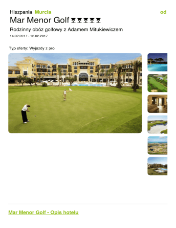 Hiszpania Murcia Mar Menor Golf Rodzinny obóz golfowy z Adamem Mitukiewiczem 14.02.2017 - 12.02.2017 Typ oferty: Wyjazdy z pro Mar Menor Golf - Opis hotelu od 915 HOTEL Intercontinental Mar Menor 5* położony jest w centrum Mar Menor Golf Resort. Otoczony polem Mar Menor Golf hotel jest odpoczynku w przytulnej atmosferze. Pokoje zostały urządzone tak aby sprzyjać wypoczynkowi przebywających w nich gości. K ekskluzywnych pokoi został wyposażony w: TV, Internet, sejf na laptopa, mini-bar, przestronn oraz balkon, z którego rozpościerają się niezwykłe widoki na pola golfowe. Dodatkowo goście mają do swoje dyspozycji: 24h room service, 3 restauracje i 4 bary, luksu baseny wewnątrz i na zewnątrz budynku, parking samochodowy. APARTAMENTY The Residences Mar Menor 4* Te nowoczesne apartamenty zostały usytuowane w sercu Mar Menor Golf Resort. Są one miejscem na relaks – pozwalają gościom poczuć się jak w domu przy jednoczesnym za najwyższego poziomu świadczenia sług oraz komfortowych warunków. Apartamenty posiadają: 1, 2 lub 3 sypialnie, jasny salon, w pełni wyposażoną kuchnięi łazienk taras lub ogród z widokiem na pole golfowe. Program oferty Zapraszamy całe rodziny na wyjazd golfowy z intensywnym treningiem pod okiem trenera kad juniorskiej PZG. Adam Mitukiewicz - head pro z Sobieni Królewskich zapewni szkolenie golfowe. Kim jest Adam Mitukiewicz? Kogo szkoli i jak? Wszekie info znajdują się na stronie Dodatkowo uczestnicy wezmą udział w turnieju "Pomorski Golf Cup", który równolegle odbywa resorcie. Pola w pakiecie Mar Menor Golf Resort oferuje grę na sześciu różnorodnych polach (Mar Menor Golf, La T Saurines de la Torre Golf, El Valle Golf, Hacienda Riquelme Golf, Halama Signature Golf). Na każdym polu zostały rozegrane znaczące, europejskie lub hiszpańskie turnieje. Wszyst posiadają 18 dołków. Alhama Golf Signature zostało osobiście zaprojektowane przez Jacka N i uchodzi za jedno z najlepszych pól golfowych w Hiszpanii. PRZELOT RYAN AIR Lot do Modlin Linia Modlin ALICANTE Alicante z Waw Odlot 1045 0635 Przylot 1430 1010 14-2102.17 Cena za bilet od 540zł (bilet z bagażem 10 kg) + od 270 zł (bagaż 15kg) + 284 zł golf Udogodnienia hotelu Bar Całodobowa recepcja Całoroczny basen Centrum biznesowe Internet Wi-Fi Klimatyzacja Masaż Mini Bar Opieka nad dziećmi Restauracja Restauracja z wyborem dań z karty Sejf Sklepy w hotelu Telewizja Telewizja satelitarna Usługi pralni Usługi Spa & Wellness Zaplecze bankietowe/konferencyjne Mar Menor Residences Golfer DBL Golfer SGL Non Golfer 7 nocy/ BB/ cena w € od os 915.00 EUR 14-21.02.17 1020.00 EUR Oferta aktualna przy grupie min 8 os. Oferta zawiera 7 nocy w app z 2ma sypialniami Residences, Śnadania i 2 kolacje (Nomad, Sushi), Pakiet 5 GF na polu hotelowym, Piłki na DR w dni gry, Akademia Adama Mitukiewicza, Grupowy transfer lotniskowy, Ubezpieczenie KL NNW z OC golf, Oferta nie zawiera Przelotu do Alicante, Opłaty za transport sprzetu golfowego lub wynajem od 55-65€/ tydz., Opłaty za club car, wózki Katarzyna Bobińska tel: +48 600 88 55 44 e-mail: kbobinska@travel
