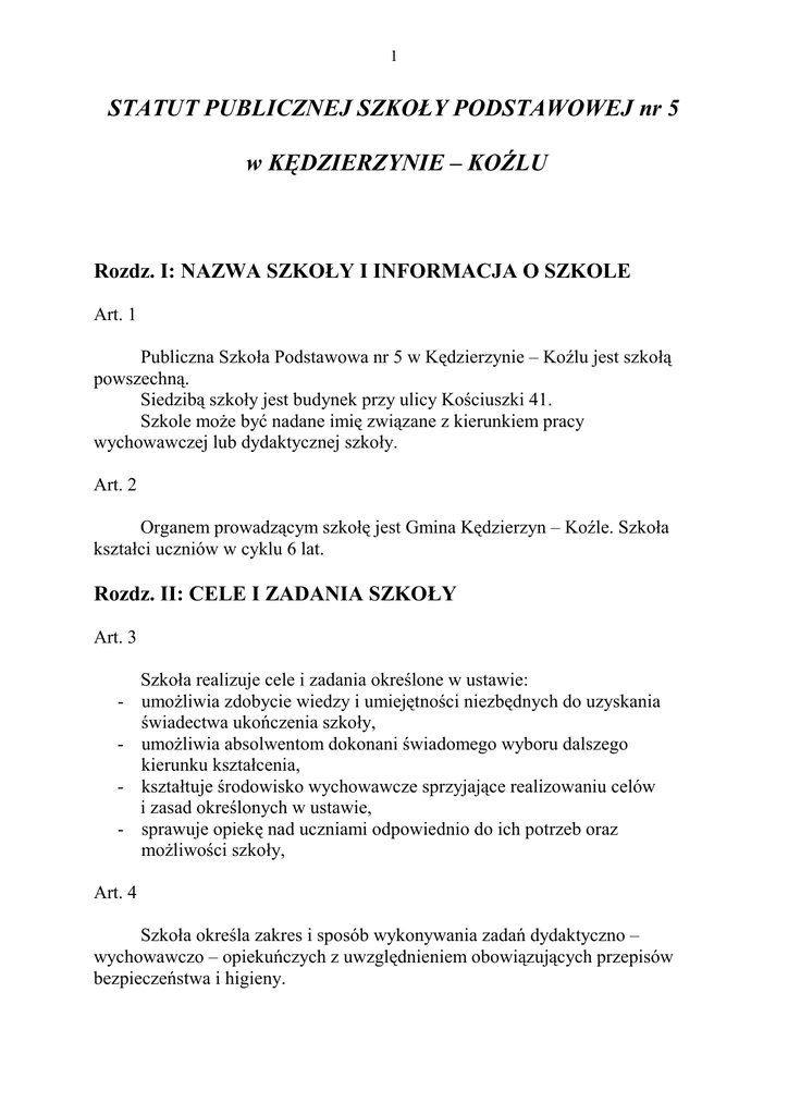 1 STATUT PUBLICZNEJ SZKOŁY PODSTAWOWEJ nr 5 w KĘDZIERZYNIE – KOŹLU Rozdz. I: NAZWA SZKOŁY I INFORMACJA O SZKOLE Art. 1 Publiczna Szkoła Podstawowa nr 5 w Kędzierzynie – Koźlu jest szkołą powszechną. Siedzibą szkoły jest budynek przy ulicy Kościuszki 41. Szkole może być nadane imię związane z kierunkiem pracy wychowawczej lub dydaktycznej szkoły. Art. 2 Organem prowadzącym szkołę jest Gmina Kędzierzyn – Koźle. Szkoła kształci uczniów w cyklu 6 lat. Rozdz. II: CELE I ZADANIA SZKOŁY Art. 3 - Szkoła realizuje cele i zadania określone w ustawie: umożliwia zdobycie wiedzy i umiejętności niezbędnych do uzyskania świadectwa ukończenia szkoły, umożliwia absolwentom dokonani świadomego wyboru dalszego kierunku kształcenia, kształtuje środowisko wychowawcze sprzyjające realizowaniu celów i zasad określonych w ustawie, sprawuje opiekę nad uczniami odpowiednio do ich potrzeb oraz możliwości szkoły, Art. 4 Szkoła określa zakres i sposób wykonywania zadań dydaktyczno – wychowawczo – opiekuńczych z uwzględnieniem obowiązujących przepisów bezpieczeństwa i higieny. 2 - nauczyciel i wychowawca zapewni opiekę i bezpieczeństwo na lekcji, zajęciach pozalekcyjnych, nadobowiązkowych, wycieczkach szkolnych, - dyżur nauczycielski w szkole trwa od godziny 7.45 do przerwy po ostatniej godzinie lekcyjnej włącznie, wg zatwierdzonego planu godzin i dyżurów, - na zajęciach nadobowiązkowych, pozalekcyjnych, wycieczkach szkolnych opiekę sprawują nauczyciele, z tym, że początek i koniec każdej formy zaczyna się i kończy w budynku szkoły. Art. 5 Uczeń ma prawo i obowiązek przebywać w szkole wg ustalonego dziennego podziału godzin na zajęciach obowiązkowych, nadobowiązkowych i pozalekcyjnych – opiekę sprawują nauczyciele przedmiotu, wychowawcy, nauczyciele dyżurni. Nauczyciel sprawuje pełną opiekę nad dziećmi poza terenem szkoły, na wycieczce: - zgłasza zamiar odbycia wycieczki lekcyjnej, dziennej, kilkudniowej, - uzyskuje pisemną akceptację na trzy dni przed jej rozpoczęciem, gdy dotyczy to wycieczki dziennej lub kilkudniowej. Art. 6 Rodzice i uczniowie mają możliwość i sposób wytypowania, doboru lub zmiany nauczyciela przedmiotu, wychowawcy. - rodzice lub uczniowie zgłaszają bezpośrednio dyrektorowi, pedagogowi szkolnemu, - nauczycielowi przedmiotu na piśmie swoje zastrzeżenia. - Dyrektor Szkoły, po rozmowie z wychowawcą klasy, rodzicami – Radą Rodziców, doprowadza do spotkania z rodzicami, uczniami - rozstrzyga, podejmuje decyzje. Art. 7 Szkoła kieruje się zasadami zawartymi w Konstytucji Rzeczypospolitej Polskiej, a także wskazaniami zawartymi w Powszechnej Deklaracji Praw Człowieka, Międzynarodowym Pakcie Praw Obywatelskich i Politycznych oraz Międzynarodowej Konwencji o Prawach Dziecka. 3 Art. 8 Nauczanie i wychowanie w szkole – respektując chrześcijański system wartości – oparte jest na uniwersalnych zasadach etyki, przyjętych przez cywilizowany świat. Art. 9 1. szkoła czynnie wspomaga wychowawczą rolę rodziny, uznając jej nadrzędną wartość 2. szkoła umożliwia uczniom podtrzymywanie poczucia tożsamości narodowej, etnicznej i religijnej, a w szczególności nauki języka oraz własnej historii i kultury. Art. 10 Celem kształcenia i wychowania jest rozwijanie u młodzieży poczucia odpowiedzialności, miłości do ojczyzny, podtrzymanie kultury i tradycji regionalnej, poszanowania dla polskiego dziedzictwa kulturowego, przy jednoczesnym otwarciu się na wartości kultur Europy i świata, przygotowanie absolwentów do dalszej nauki, zdobywania zawodu, uświadomienie potrzeby kształcenia permamentnego oraz upowszechnienie wiedzy ekologicznej i kształtowanie właściwych postaw wobec problemów ochrony środowiska. Art. 11 Szkoła zapewnia każdemu uczniowi bezpłatne nauczanie w zakresie ramowych planów nauczania, stwarza warunki niezbędne do rozwoju ucznia, przygotowuje go do wypełniania obowiązków obywatelskich w oparciu o zasady solidarności, demokracji, tolerancji, sprawiedliwości i wolności. Rozdz. III: ORGANA SZKOŁY Art. 12 Organami szkoły są: - Dyrektor Szkoły Rada Pedagogiczna Rada Rodziców Samorząd Uczniowski 4 Art. 13 W szkole może powstać i prowadzić działalność Rada Szkoły. Art. 14 Statut szkoły uchwala Rada Pedagogiczna\. Art. 15 Szkołą kieruje Dyrektor Szkoły. Tryb powoływania i odwoływania Dyrektora Szkoły oraz zadania i uprawnienia Dyrektora Szkoły regulują odrębne przepisy – zakres obowiązków i uprawnień Dyrektora Szkoły wynika z Ustawy z dnia 07.09.1991 o Systemie Oświaty oraz znowelizowanej Karty Nauczyciela. Art. 16 1. W skład kadry kierowniczej szkoły wchodzą: wicedyrektor, wychowawca – koordynator, kierownicy grup wiekowych, pedagog szkolny, przedstawiciele związków zawodowych. 2. Tryb powoływania i odwoływania kadry kierowniczej regulują odrębne przepisy. 3. Dopuszcza się możliwość utworzenia innych stanowisk kierowniczych w szkole. 4. Osoby, którym powierzono funkcje kierownicze w szkole wykonują zadania zgodnie z ustalonym przez Dyrektora Szkoły przydziałem czynności. Rozdz. IV: ORGANIZACJA SZKOŁY Art. 17 Terminy rozpoczynania i kończenia zajęć dydaktyczno – wychowawczych, przerw świątecznych oraz ferii zimowych i letnich określają przepisy w sprawie organizacji roku szkolnego. Art. 18 Szczegółową organizację nauczania, wychowania i opieki w danym roku szkolnym określa arkusz organizacji szkoły opracowany przez Dyrektora na podstawie planu nauczania oraz planu finansowego szkoły 5 Arkusz organizacji szkoły zatwierdza Prezydent Miasta Kędzierzyna – Koźla. Art. 19 1. Podstawową jednostką organizacyjną szkoły jest oddział złożony z uczniów, którzy w jednorocznym kursie nauki danego roku szkolnego uczą się wszystkich przedmiotów obowiązkowych określonych planem nauczania, zgodnym z odpowiednim ramowym planem nauczania – obowiązującym programem (program