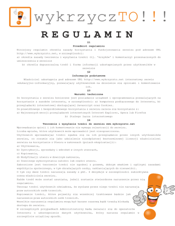 wykrzyczTO!!! REGULAMIN §1 Przedmiot regulaminu Niniejszy regulamin określa zasady korzystania i funkcjonowania serwisu pod adresem URL http://www.wykrzyczto.net, w szczególności: a) określa zasady tworzenia i wysyłania treści (tj. 'krzyków' i komentarzy) przeznaczonych do umieszczenia w serwisie b) określa dopuszczalną treść i formę informacji udostępnianych przez użytkowników w serwisie §2 Informacje podstawowe Właściciel udostępnia pod adresem URL http://www.wykrzyczto.net internetowy serwis edukacyjno-informacyjny, pozwalający użytkownikom na dzielenie się opiniami i komentowanie ich. §3 Warunki techniczne Do korzystania z serwisu konieczne jest posiadanie urządzeń i oprogramowania pozwalających na korzystanie z zasobów internetu, w szczególności: a) komputera podłączonego do Internetu, b) przeglądarki internetowej obsługującej Javascript oraz Cookies. Do prawidłowego i bezproblemowego korzystania z serwisu zaleca się korzystanie z: a) Najnowszych wersji przeglądarek internetowych Internet Explorer, Opera lub Firefox b) Stałego łącza internetowego §4 Tworzenie i wysyłanie treści do serwisu www.wykrzyczto.net Wprowadzanie opinii i ich komentowanie nie wymaga rejestracji do serwisu. Liczba wpisów, które użytkownik może wprowadzić jest nieograniczona. Użytkownik wprowadzając treści zgadza się na ich przeglądanie przez innych użytkowników serwisu, co rozumie się jako udzielenie nieodpłatnej bezterminowej licencji właścicielowi serwisu na korzystanie z Utworu w zakresach (polach eksploatacji): a) Użytkowania, b) Dystrybucji, sprzedaży i wdrożeń w innych utworach, c) Kopiowania, d) Modyfikacji utworu w dowolnym zakresie, e) Dowolnego wykorzystania całości lub części utworu. Zabronione jest tworzenie treści nie zgodnej z prawem, dobrym smakiem i ogólnymi zasadami współżycia społecznego, w tym obrażających osoby, nakłaniających do nienawiści. O tym czy dane treści naruszają zasady z pkt. 4 decyduje w szczególności subiektywna ocena właściciela serwisu. Każde treść może zostać usunięta, jeżeli zostanie stwierdzone naruszenie przez nią regulaminu. Tworząc treści użytkownik oświadcza, że wysłane przez niego treści nie naruszają praw autorskich osób trzecich. Kopiowanie treści, które pojawiły się wcześniej traktowane będzie jak naruszenie praw autorskich osób trzecich. Wszelkie naruszenia regulaminu mogą być karane czasową bądź trwałą blokadą dostepu do serwisu. W szczególnych przypadkach Administratorzy będą zwracali się do operatorów Internetu o udostepnienie szczególnie uciążliwy sposób. danych użytkownika, który narusza regulamin w wykrzyczTO!!! §5 Postanowienia końcowe Użytkownikiem serwisu może być każda osoba pełnoletnia, lub osoba niepełnoletnia za zgodą rodziców lub prawnych opiekunów. W przypadku naruszenia zasad niniejszego regulaminu i/lub zasad nietykiety konto użytkownika może zostać zawieszone lub usunięte. Administrator nie odpowiada za brak dostępu do serwisu spowodowany nietypową konfiguracją komputera użytkownika lub konfiguracją inną niż zalecana. Wszelkie reklamacje należy kierować drogą elektroniczną na adres: [email protected] §6 Ze względów czysto technicznych serwis wykrzyczto.net korzysta z zapisywanych na komputerze użytkowników plików cookies oraz zbiera informacje o adresie IP. Usunięcie plików Cookies lub nie udostępnienie adresu IP może utrudnić, bądź uniemożliwić korzystanie z naszego serwisu, za co Administratorzy wykrzyczto.net nie ponoszą odpowiedzialności. §7 Wyłączenie odpowiedzialności Właściciel nie odpowiada w żaden sposób, w maksymalnym dopuszczonym przez prawo zakresie, za treści publikowane przez użytkowników na łamach serwisu. Właściciel nie odpowiada w żaden sposób za sytuacje wynikające z udostępnienia przez użytkownika nazwy użytkownika i hasła osobom trzecim. Właściciel dołoży wszelkich starań, aby serwis działał prawidłowo, jednak nie ponosi odpowiedzialności za zdarzenia spowodowane siłą wyższą, niedozwoloną ingerencją użytkowników i osób trzecich oraz za zdarzenia bezpośrednio nie zależne od niego. Właściciel nie ponosi odpowiedzialności za utratę danych użytkowników wynikające z awarii sprzętu lub sieci internetowej. Właściciel zastrzega sobie prawo do anonimowego publikowania treści przesłanych do niego, a związanych z działaniem serwisu, poradami i sugestiami. Właściciel zastrzega sobie prawo do dokonania cesji wszelkich praw związanych z serwisem, bez możliwości jakiegokolwiek sprzeciwu ze strony użytkowników.