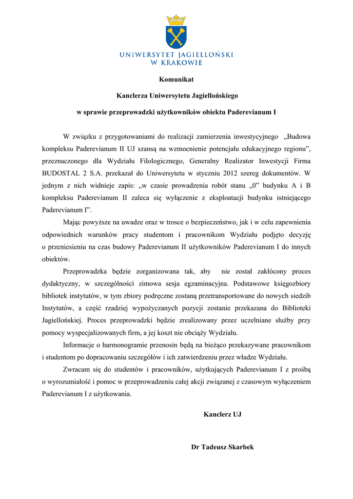 Komunikat Kanclerza Uniwersytetu Jagiellońskiego w sprawie przeprowadzki użytkowników obiektu Paderevianum I W związku z przygotowaniami do realizacji zamierzenia inwestycyjnego „Budowa kompleksu Paderevianum II UJ szansą na wzmocnienie potencjału edukacyjnego regionu”, przeznaczonego dla Wydziału Filologicznego, Generalny Realizator Inwestycji Firma BUDOSTAL 2 S.A. przekazał do Uniwersytetu w styczniu 2012 szereg dokumentów. W jednym z nich widnieje zapis: „w czasie prowadzenia robót stanu „0” budynku A i B kompleksu Paderevianum II zaleca się wyłączenie z eksploatacji budynku istniejącego Paderevianum I”. Mając powyższe na uwadze oraz w trosce o bezpieczeństwo, jak i w celu zapewnienia odpowiednich warunków pracy studentom i pracownikom Wydziału podjęto decyzję o przeniesieniu na czas budowy Paderevianum II użytkowników Paderevianum I do innych obiektów. Przeprowadzka będzie zorganizowana tak, aby nie został zakłócony proces dydaktyczny, w szczególności zimowa sesja egzaminacyjna. Podstawowe księgozbiory bibliotek instytutów, w tym zbiory podręczne zostaną przetransportowane do nowych siedzib Instytutów, a część rzadziej wypożyczanych pozycji zostanie przekazana do Biblioteki Jagiellońskiej. Proces przeprowadzki będzie zrealizowany przez uczelniane służby przy pomocy wyspecjalizowanych firm, a jej koszt nie obciąży Wydziału. Informacje o harmonogramie przenosin będą na bieżąco przekazywane pracownikom i studentom po dopracowaniu szczegółów i ich zatwierdzeniu przez władze Wydziału. Zwracam się do studentów i pracowników, użytkujących Paderevianum I z prośbą o wyrozumiałość i pomoc w przeprowadzeniu całej akcji związanej z czasowym wyłączeniem Paderevianum I z użytkowania. Kanclerz UJ Dr Tadeusz Skarbek
