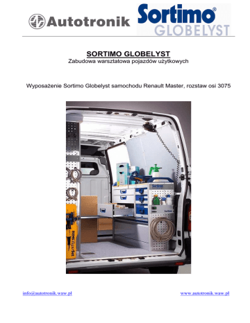 SORTIMO GLOBELYST Zabudowa warsztatowa pojazdów uŜytkowych WyposaŜenie Sortimo Globelyst samochodu Renault Master, rozstaw osi 3075 [email protected] www.autotronik.waw.pl Samochód bazowy: Charakterystyka: Renault Master, rozstaw osi 3075. Globelyst jest innowacyjnym sposobem wykańczania wnętrz samochodów, stworzonym przez firmę Sortimo. Idealnie pasuje do następujących modeli Renault: Kangoo, Trafic, Master. JuŜ podstawowe wyposaŜenie z zakresu Globelyst zamienia samochód w mobilny warsztat, który jest gwarancją efektywnej pracy i ergonomicznego wykorzystania pojazdu. Przykładowe elementy wyposaŜenia Soboflex®- podłoga montaŜowa: • • • • • • Multiplex 12 mm antypoślizgowa dopasowana do konkretnego modelu samochodu brak konieczności przewiercania karoserii pojazdu (zabudowa warsztatowa przykręcana jest wyłącznie do płyty podłogowej Soboflex, natomiast boczne elementy stabilizujące przytwierdzane są do bocznych elementów karoserii pojazdu odporna na ścieranie stabilna i łatwa w utrzymaniu czystości Sowaflex®- wyłoŜenie ścian bocznych przestrzeni ładunkowej • • • • • ochrona samochodu przed wewnętrznymi szkodami niezwykle odporne na wstrząsy i zadrapania odporne takŜe na wilgoć i substancje chemiczne wielkość dokładnie dopasowana do danego typu samochodu lŜejsze o 60% od drewna Lewa strona (kierowcy) Prawa strona (pasaŜera) MA KU LI-1 7 półek FW z 2, względnie 3, przegrodami i matami przeciwpoślizgowymi 2 Mobilbox z uchwytami, zamontowane na półce aluminiowej 2 walizki T-BOXX zamontowane na półce aluminiowej 1 pas transportowy (S x G x H): około 2214 x 382 x 1542 mm Waga: około 72,5 kg [email protected] MA KU RE-1 4 półki FW z 3 przegrodami i matami przeciwpoślizgowymi (S x G x H): około 1246 x 382 x 1542 mm Waga: około 37,4 kg www.autotronik.waw.pl MA KU LI-2 6 półek FW z 2, względnie 3, przegrodami i matami przeciwpoślizgowymi 1 półka z 7 pojemnikami magazynowymi SB 049 2 Mobilbox z uchwytami 1 półka z klapą aluminiową 1 pas transportowy MA KU RE- 2 1 półka FW z 2 przegrodami i matą przeciwpoślizgową 4 szuflady z przegrodami i matami przeciwpoślizgowymi (S x G x H): około 1004 x 382 x 1219 mm Waga: około 46,5 kg (S x G x H): około 2214 x 382 x 1542 mm Waga: około 71,2 kg MA KU LI-3 MA KU RE- 3 5 półek FW z 2, względnie 3 przegrodami i matami przeciwpoślizgowymi 3 półki z 6, względnie 7, pojemnikami magazynowymi SB 04-9 1 półka z klapą aluminiową 1 uchwyt blokujący walizki 1 klapa unoszona do góry 1 półka FW z 2 przegrodami i matą przeciwpoślizgową 3 szuflady z przegrodami i matami przeciwpoślizgowymi 3 walizki T-BOXX z plastikowymi pojemnikami 1 Mobilbox z uchwytem 1 klapa unoszona do góry (B x T x H): około 2214 x 382 x 1576 mm Waga: około 82,5 kg (S x G x H): około 1004 x 382 x 1253 mm Waga: około 63,3 kg MA KU LI- 4 MA KU RE- 4 1 wanna na elementy długie 2 półki z 6, względnie 7, pojemnikami magazynowymi SB 04-9 2 półki FW z 2, względnie 3, przegrodami matami przeciwpoślizgowymi 8 szuflad z przegrodami i matami przeciwpoślizgowymi 1 uchwyt mocujący walizki 1 półki FW z 2 przegrodami i matą przeciwpoślizgową 1 półka z 6 pojemnikami magazynowymi SB 04-9 1 półka FR z 2 przegrodami i matą przeciwpoślizgową 4 szuflady z przegrodami i matami przeciwpoślizgowymi [email protected] www.autotronik.waw.pl 1 szyna transportowa 1 klapa unoszona do góry (S x G x H): około 2214 x 382 x 1511 mm Waga: około 109,8 kg 4 walizki metalowe z plastikowymi pojemnikami 1 szyna transportowa 1 klapa unoszona do góry 1 uchwyt na dokumenty A4 1 blat składany z imadłem (S x G x H): około 1224 x 382 x 1542 mm Waga: około 103,4 kg Certyfikaty: Homologacja pojazdu: nie wymaga • • • ISO 9001 TÜV produkt spełnia wymagania normy europejskiej ECE R17 Gwarancja: 3 lata na produkty Sortimo International GmbH Jeśli macie Państwo jakieś pytania, nasz doradca pomoŜe Państwu zaprojektować zabudowę samochodu. Autotronik Ul. E.Orzeszkowej 39 05-500 Piaseczno Tel/fax. (022) 757 21 22; 0-603 91 93 95 E-mail: [email protected] www.autotronik.waw.pl [email protected] www.autotronik.waw.pl