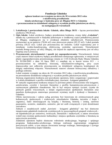 Fundacja Gdańska ogłasza konkurs na wynajem na okres do 30 września 2012 roku z moŜliwością przedłuŜenia lokalu uŜytkowego w budynku przy ul. Długiej 30/31 w Gdańsku z przeznaczeniem na działalność usługową o wysokim profilu jakościowym oferty, na następujących warunkach 1. Lokalizacja i powierzchnia lokalu: Gdańsk, ulica Długa 30/31 – łączna powierzchnia uŜytkowa 190,58 m2. 2. Opis lokalu: Lokal uŜytkowy, będący przedmiotem konkursu, zwany dalej „Lokalem”, składa się z pomieszczeń w budynku połoŜonym w środkowej części południowej pierzei ul. Długiej, znajdującym się w ewidencji obiektów zabytkowych. Pomieszczenia usytuowane są na parterze (78,04 m2) oraz pierwszym piętrze (82,32 m2). Lokal posiada piwnicę (30,22 m2). Lokal jest przeznaczony do remontu. Lokal wyposaŜony jest w instalację: wodno-kanalizacyjną, elektryczną, centralne ogrzewanie. Nieruchomość posiada dostęp pieszy od ulicy Długiej, zaś dojazd do zaplecza zapewniony jest od ulicy Ogarnej oraz Ławniczej. 3. Przeznaczenie nieruchomości i sposób jej zagospodarowania: Nieruchomość, której część stanowi lokal uŜytkowy będący przedmiotem niniejszego ogłoszenia, w miejscowym planie zagospodarowania przestrzennego miasta nr 1110 (Uchwała Rady Miasta Gdańska Nr XI/266/2003 z dnia 10 lipca 2003 r.) znajduje się w karcie terenu 013 – z przeznaczeniem na zabudowę mieszaną, mieszkaniowo-usługową, przy czym dopuszczalne jest całkowite przeznaczenie na działalność usługową kondygnacji do drugiej nadziemnej włącznie. Nieruchomość stanowi element historycznej zabudowy i podlega ochronie. Lokal zostanie wynajęty na okres do 30 września 2012 roku, z moŜliwością przedłuŜenia, na prowadzenie działalności usługowej o wysokim profilu jakościowym oferty. Intencją organizatora konkursu jest pozyskanie operatora, który zorganizuje i poprowadzi w Lokalu działalność o profilu wielofunkcyjnej „kawiarni - księgarni gdańskiej”. W zamyśle organizatora konkursu miejsce to powinno pełnić równocześnie role księgarni, antykwariatu, czytelni i kawiarni literackiej o profilu humanistyczno-artystycznym z zaznaczonym gdańskim charakterem. Ma to być miejsce tętniące Ŝyciem, czynne do późnych godzin wieczornych, a dzięki organizowanym spotkaniom literackim oraz panelom dyskusyjnym stanowiące przestrzeń wymiany myśli i dyskusji o literaturze i Gdańsku. Oferta merytoryczna i zakres usług powinny być kierowane do zróŜnicowanych grup kulturowych, społecznych i wiekowych: mieszkańców Gdańska, turystów z kraju i zagranicy, ludzi interesujących się ksiąŜką i literaturą, historią i sztuką, zarówno pasjonatów, uczniów, studentów, seniorów, jak teŜ osób związanych z tymi dziedzinami zawodowo. Jednym z zasadniczych zadań „kawiarni - księgarni gdańskiej” ma być skuteczne integrowanie gdańskich środowisk czytelniczych (w poszczególnych grupach wiekowych od najmłodszych po seniorów), twórczych, literackich i naukowych, a zatem stworzenie wokół niej swoistej społeczności kulturalnej i miejsca spotkania czytelnika z literaturą na najwyŜszym poziomie. Zadaniem operatora będzie skuteczne wdroŜenie atrakcyjnego, bogatego i spójnego programu funkcjonalno-uŜytkowego, którego realizacja zagwarantuje osiągnięcie powyŜszych celów, a tym samym stworzenie nowego waŜnego, interesującego i Ŝywego miejsca na kulturalnej mapie Gdańska. 4. 5. 6. 7. 8. Przystosowanie Lokalu do prowadzenia powyŜszej działalności wymagać będzie realizacji inwestycji remontowej staraniem i na koszt najemcy. Oczekiwany termin realizacji inwestycji: maksymalnie do 4 miesięcy od dnia podpisania umowy najmu o ile nie nastąpią przeszkody spowodowane działaniami tzw. siły wyŜszej. Miesięczna stawka opłaty za wynajem zostanie ustalona w drodze negocjacji po zaakceptowaniu przedstawionego programu działalności. Program funkcjonalno-uŜytkowy Lokalu wskazany w punkcie 7h, obok oferowanej miesięcznej stawki opłaty za wynajem, będzie stanowić jedno z głównych oraz komplementarnych kryteriów oceny i wyboru oferty. Od zaoferowanej miesięcznej stawki opłat najemca będzie opłacał podatek VAT w wysokości 22%. Najemca oprócz opłaty za wynajem opłacać będzie równieŜ podatek od nieruchomości, którego wysokość ustalona zostanie na podstawie stosownej uchwały Rady Miasta Gdańska, a takŜe pokrywać będzie opłaty eksploatacyjne oraz opłaty związane z kosztami zarządu nieruchomością wspólną. Termin i miejsce składania pisemnych ofert: pisemne oferty w zamkniętych kopertach z napisem: „Konkurs na wynajem lokalu uŜytkowego w budynku przy ul. Długiej 30/31 w Gdańsku z przeznaczeniem na działalność usługową o wysokim profilu jakościowym oferty”, naleŜy składać do dnia 23 lutego 2010 r. do godz. 17.00 w siedzibie Fundacji Gdańskiej, przy ul. Szerokiej 121/122 w Gdańsku. Warunkiem niezbędnym przyjęcia oferty jest okazanie potwierdzenia przelewu, bądź innego dokumentu stanowiącego dowód opłacenia wadium, o którym mowa w punkcie 9. Pisemne oferty powinny zawierać: a) imię nazwisko i adres oferenta albo nazwę lub firmę oraz siedzibę, jeŜeli oferentem jest osoba prawna lub inny podmiot, b) wpis do ewidencji działalności gospodarczej lub odpis aktualny z KRS, potwierdzający długość okresu prowadzenia działalności gospodarczej, o którym mowa w punkcie 9c poniŜej, c) dokumenty potwierdzające poziom obrotów, o którym mowa w punkcie 9c poniŜej, d) oświadczenie potwierdzające dostępność środków na deklarowane nakłady, e) dokumenty potwierdzające przedmiot dotychczasowej działalności oferenta, w kontekście jego zbieŜności z przynajmniej jednym przedmiotem działalności planowanej w Lokalu f) datę sporządzenia oferty, g) oświadczenie, Ŝe oferent zapoznał się z warunkami i przedmiotem konkursu i przyjmuje je bez zastrzeŜeń, h) kompleksowy program funkcjo