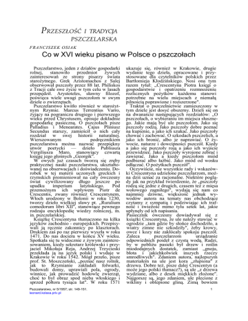 PRZESZŁOŚĆ I TRADYCJA PSZCZELARSKA FRANCISZEK OSIAK Co w XVI wieku pisano w Polsce o pszczołach Pszczelarstwo, jeden z działów gospodarki rolnej, stanowiło przedmiot żywych zainteresowań ze strony pisarzy świata starożytnego. Grek Aristomachos z Salej obserwował pszczoły przez 88 lat. Philiskos z Tracji całe swe życie w tym celu w lasach przepędził. Arystoteles, sławny filozof, poświęca wiele uwagi pszczołom w swym dziele o zwierzętach. Pszczelarstwo kwitło również w starożytnym Rzymie. Marcus Terrentius Varro, żyjący na pograniczu drugiego i pierwszego wieku przed Chrystusem, opisuje dokładnie gospodarkę pasieczną. O pszczołach pisze Palladius i Menearates. Cajus Pliniusz Secundus starszy, zamieścił o nich cały rozdział w swej historii naturalnej. Wierszowanym podręcznikiem pszczelarstwa można nazwać przepiękny utwór poetycki — dzieło Publiusza Vergiliusza Maro, stanowiący czwartą księgę jego głośnych „Georgik". W owych już czasach tworzą się zręby praktycznej nauki pszczelarstwa, ukształtowanej na obserwacjach i doświadczeniu. Dorobek w tej materii uczonych greckich i rzymskich promieniował na cały ówczesny świat cywilizowany długo jeszcze po upadku imperium latyńskiego. Pod przemożnym ich wpływem Piotr de Crescentis, zwany również Crescentynem, Włoch urodzony w Bolonii w roku 1230, tworzy dzieło wielkiej sławy pt. „Ruralium comodorum libri XII", stanowiące pewnego rodzaju encyklopedię wiedzy rolniczej, m. in. pszczelarskiej. Książkę Crescentyna tłumaczono na kilka języków zachodnio - europejskich. Przepisywali ją ręcznie zakonnicy po klasztorach. Drukiem zaś po raz pierwszy wyszła w roku 1471. Do nas dociera w końcu XV wieku. Spotkała się tu widocznie z żywym zainteresowaniem, kiedy sekretarz królewski i przyjaciel Mikołaja Reja, Andrzej Trzycieski przekłada ją na język polski i wydaje w Krakowie w roku 1542. Mógł przeto, pisze prof. St. Moszczeński, „poznać nasz rolnik, jak to Rzymianie zakładali folwarki, budowali domy, uprawiali pola, ogrody, winnice, jak prowadzić hodowlę zwierząt, choć to był obraz spod nieba włoskiego i sprzed półtora tysiąca lat". W roku 1571 Pszczelarstwo, nr 5/1957; str. 149-151. leonard.kolasa.priv.pl ukazuje się, również w Krakowie, drugie wydanie tego dzieła, opracowane i przystosowane dla czytelników polskich przez Bartłomieja Kłodzińskiego. Nosi ona tym razem tytuł: „Crescentyna Piotra księgi o gospodarstwie i opatrzeniu rozmnożeniu rozlicznych pożytków każdemu stanowi potrzebne na wielu miejscach z niemałą pilnością poprawione i rozszerzone". Traktat o pszczelnictwie zamieszczony w tym dziele jest dosyć obszerny. Dzieli się on na dwanaście następujących rozdziałów: „O pszczołach, o wybieraniu im miejsca słusznego. Jakie mają być ule pszczołom. Jako się pszczoły rodzą. Jako pszczoły dobre poznać na kupienie, a jako ich szukać. Jako pszczoły chować i zachować. O szkodach pszczelich, a jako ich bronić, albo je naprawiać. O żywocie, naturze i dowcipności pszczół. Kiedy a jako się pszczoły roją a jako ich wyjście przewidzieć. Jako pszczoły wyrojone zebrać i zawierać. Jako a kiedy pszczołom miód podbierać albo łaźbić. Jako miód od wosku odłączać. O pożytkach pszczół". Oczywiście, nie wszystkie rady i wskazówki Crescentyna udzielone pszczelarzom, można dziś uznać za racjonalne. Niektóre poglądy jak na przykład twierdzenie, że „pszczoły rodzą się jedne z drugich, czasem też z mięsa wołowego zagniłego", wydają się nam co najmniej dziwne, większość jednak wywodów autora na tematy nas obchodzące czytamy z sympatią i podziwiając ich trafność i świeżość mimo tylu setek lat, jakie upłynęły od ich napisania. Pasiecznik ówczesny dowiadywał się z książki Crescentyna, że ule należy stawiać w ogrodzie „tam gdzie by słońce dochodziło, a wiatry zimne nie szkodziły", żeby krowy, owce i kozy nie zakłócały spokoju pszczół. Zaleca pszczelarzom urządzanie odpowiednich poideł z czystą wodą. Radzi, by w pobliżu pasieki był drzew i roślin miododajnych dostatek, zamiast „gnoju, błota i jakichkolwiek inszych rzeczy smrodliwych". Zdaniem autora, najlepszym materiałem na ule jest kora „złupiona" z drzewa. Dobre też, pisze dalej Crescentyn (a może jego polski tłumacz?), są ule „z drzewa wydziane, albo z desek miękkich złożone". Najgorsze są, jego zdaniem, ule plecione z wikliny i oblepione gliną. Zimą bowiem 1 „rychło marzną, a od gorącego słońca się rozpalają". Ul powinien być wysoki półtora do dwóch łokci, szerokości zaś na dwie piędzi. Dwa niewielkie wyloty, skierowane ku słońcu, uważa Crescentyn za wystarczające, zaznacza jednak, że niektórzy pszczelarze wiercą w ulu kilka małych otworków, które na zimę zalepiają krowieńcem. Obok uli ustawianych pionowo autor poleca również leżaki sporządzone z desek. Uważa je za bardzo praktyczne. Najlepiej, pisze, aby ustawione były lekko pochyło, „tak by przodek jednego mógł się wesprzeć na spodku drugiego". Zwraca uwagę na moment kupna pszczół. Najlepsze „bywają małe, pstrawe a obłe” (czyli wysmukłe). Zdrowe są pszczoły „jeśli wiele ich jest w roju, jeśli są gładkie, a lśniące i robota ich, to jest węza, równa jest i gładka; znak zasię chorych jest ten, jeśli są kosmate, chropawe i jakby prochem przytrzęsione". Pszczoły radzi kupować i przewozić na wiosnę. „Dostawaj lepiej — pisze autor traktatu — pszczoły z bliskiego sąsiedztwa niźli z dalekiego, by snadź z daleka przywiezionych, nieprzywykłość powietrza (nie obraziła". W kwietniu, radzi Crescentyn, ule dobrze podmiatać, używając do tej czynności skrzydła dużego ptaka. Dym do poskramiania pszczół należy stosować rozważnie. Pasiecznik podczas robót powinien być czysty, trzeźwy i „aby też czosnkiem, cebulą, słoniną ani żadną rzecz