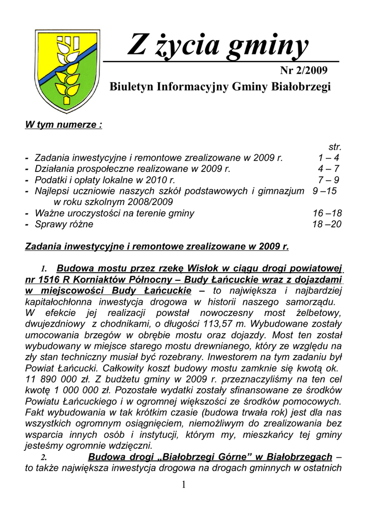 Z życia gminy Nr 2/2009 Biuletyn Informacyjny Gminy Białobrzegi W tym numerze : - str. Zadania inwestycyjne i remontowe zrealizowane w 2009 r. 1–4 Działania prospołeczne realizowane w 2009 r. 4–7 Podatki i opłaty lokalne w 2010 r. 7–9 Najlepsi uczniowie naszych szkół podstawowych i gimnazjum 9 –15 w roku szkolnym 2008/2009 Ważne uroczystości na terenie gminy 16 –18 Sprawy różne 18 –20 Zadania inwestycyjne i remontowe zrealizowane w 2009 r. 1. Budowa mostu przez rzekę Wisłok w ciągu drogi powiatowej nr 1516 R Korniaktów Północny – Budy Łańcuckie wraz z dojazdami w miejscowości Budy Łańcuckie – to największa i najbardziej kapitałochłonna inwestycja drogowa w historii naszego samorządu. W efekcie jej realizacji powstał nowoczesny most żelbetowy, dwujezdniowy z chodnikami, o długości 113,57 m. Wybudowane zostały umocowania brzegów w obrębie mostu oraz dojazdy. Most ten został wybudowany w miejsce starego mostu drewnianego, który ze względu na zły stan techniczny musiał być rozebrany. Inwestorem na tym zadaniu był Powiat Łańcucki. Całkowity koszt budowy mostu zamknie się kwotą ok. 11 890 000 zł. Z budżetu gminy w 2009 r. przeznaczyliśmy na ten cel kwotę 1 000 000 zł. Pozostałe wydatki zostały sfinansowane ze środków Powiatu Łańcuckiego i w ogromnej większości ze środków pomocowych. Fakt wybudowania w tak krótkim czasie (budowa trwała rok) jest dla nas wszystkich ogromnym osiągnięciem, niemożliwym do zrealizowania bez wsparcia innych osób i instytucji, którym my, mieszkańcy tej gminy jesteśmy ogromnie wdzięczni. 2. Budowa drogi „Białobrzegi Górne” w Białobrzegach – to także największa inwestycja drogowa na drogach gminnych w ostatnich 1 latach. Dzięki jej realizacji została wybudowana droga o długości 2917 mb. Całkowity koszt budowy tej drogi to kwota 990 000 zł, z czego z budżetu gminy wydaliśmy 495 000 zł, zaś kwotę 495 000 zł otrzymaliśmy jako dotację w ramach Narodowego Programu Przebudowy Dróg Lokalnych. 3. Przebudowa drogi powiatowej Nr 1520 R Dąbrówki Wola Dalsza Głuchów wraz z przystosowaniem pobocza do ruchu pieszego w Woli Dalszej – inwestorem na tym zadaniu był Powiat Łańcucki. W ramach tego zadania wybudowane zostało ok. 3,4 km chodnika, dokonano poszerzenia drogi oraz położono nową nawierzchnię asfaltową na całej długości drogi. Planowany koszt tej inwestycji to kwota 3 270 000 z czego środki Powiatu Łańcuckiego to kwota 554 000 zł, środki budżetu Gminy Białobrzegi to kwota 1 081 000 zł, zaś reszta, czyli kwota 1 635 000 zł to dotacja zewnętrzna. To także była największa i najbardziej kapitałochłonna inwestycja realizowana w ostatnich latach w obrębie dróg powiatowych. Jak więc widzimy, te trzy inwestycje drogowe zrealizowane w jednym roku na terenie naszej gminy mają wymiar historyczny ze względu na ich wielkość, koszt ich realizacji, ale także ze względu na ogromne środki pomocowe pozyskane na ich realizację. 4. Remonty dróg W ramach realizacji naszego czteroletniego programu remontu dróg będących własnością gminy, wykonaliśmy nową nawierzchnię asfaltową na drodze „Zalesie” w Białobrzegach o długości 650 m. Koszt zadania to kwota ok.137 000 zł. Środki finansowe przeznaczyliśmy również na zakup 2000 ton kamienia oraz jego rozwożenie, remonty przepustów, odśnieżanie i koszenie poboczy. Wykonaliśmy 544 m drogi wewnętrznej na tzw. „Nowym Osiedlu” w Białobrzegach, na terenach gdzie sprzedaliśmy działki budowlane. Wydaliśmy na ten cel kwotę ok. 118 000 zł. Ogólnie na zadania związane z remontami i przebudową dróg będących własnością gminy wydaliśmy kwotę ok. 1 549 000 zł. 5. Rozbudowa kanalizacji sanitarnej w prawobrzeżnej części gminy w miejscowościach Korniaktów Płd., Budy Łańcuckie /pr./ w ramach tego zadania wybudowaliśmy 1597 mb sieci kanalizacji, co umożliwiło podłączenie 17 gospodarstw domowych. Koszt tego zadania to kwota ok.167 000 zł. 2 6. Uzbrojenie terenów mieszkaniowych i inwestycyjnych w Białobrzegach w ramach tego zadania wykonaliśmy sieć wodociągową i kanalizacyjną na działkach położonych między SKR- em a budynkiem Policji w Białobrzegach. Działki budowlane zostały następnie wydzielone geodezyjnie i w najbliższym czasie zostaną przeznaczone do sprzedaży. Na terenie tym znajdują się także działki przeznaczone w planie zagospodarowania przestrzennego pod działalność usługową i produkcyjną, które także uzbroiliśmy w sieć wodociągową i kanalizacyjną. Koszt realizacji tego zadania to kwota ok. 222 000 zł. 7. Wykonanie elewacji Szkoły Podstawowej w Białobrzegach oraz Publicznego Gimnazjum w Białobrzegach - to nasze ostatnie szkoły, które otrzymały nowe elewacje. Budynek Szkoły Podstawowej został docieplony, zaś elewacja na budynku gimnazjum i hali sportowej została odnowiona. Przeznaczyliśmy na ten cel kwotę ok. 279 000 zł. 8. Remont pomieszczeń gimnazjum – w ramach tego zadania wykonano posadzki wraz z dociepleniem oraz położono nowe wykładziny, a także wymieniono stolarkę drzwiową w tzw. „starej części gimnazjum” (część budynku szkoły podstawowej). Pomalowano wszystkie pomieszczenia gimnazjum oraz halę sportową. Tak więc na 10 – lecie funkcjonowania gimnazjum, zyskało ono odnowione pomieszczenia szkolne i elewację. Wydaliśmy na ten cel kwotę ok. 176 000 zł. Realizacją tych zadań zakończyliśmy kilkuletni program modernizacji naszych placówek oświatowych. Efektem jego realizacji są piękne, estetyczne budynki szkolne, w których nasi uczniowie mają bardzo dobre warunki do nauki a nauczyciele do pracy. Realizacja tego programu pochłonęła przez kilka lat bardzo duże środki finansowe – w latach 2000 - 2009 na inwestycje i remonty w oświacie wydaliśmy kwotę ok. 13 712 000 zł. W ramach tych środków wykonaliśmy remonty generalne wszystkich naszych szkół, nowe ele