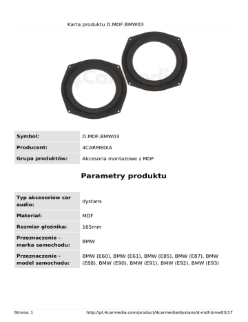 Karta produktu D.MDF.BMW03 Symbol: D.MDF.BMW03 Producent: 4CARMEDIA Grupa produktów: Akcesoria montażowe z MDF Parametry produktu Typ akcesoriów car audio: dystans Materiał: MDF Rozmiar głośnika: 165mm Przeznaczenie marka samochodu: BMW Przeznaczenie - BMW (E60), BMW (E61), BMW (E85), BMW (E87), BMW model samochodu: (E88), BMW (E90), BMW (E91), BMW (E92), BMW (E93) Strona: 1 http://pl.4carmedia.com/product/4carmedia/dystans/d-mdf-bmw03/17 Karta produktu D.MDF.BMW03 Przeznaczenie - BMW E60 przód pod fotel, BMW E61 przód pod fotel, BMW lokalizacja głośnika: E85 przód pod fotel, BMW E87 przód pod fotel, BMW E88 przód pod fotel, BMW E90 przód pod fotel, BMW E91 przód pod fotel, BMW E92 przód pod fotel, BMW E93 przód pod fotel Grubość: Właściwości car audio: 30 mm impregnowany Informacje dodatkowe Masa brutto: Strona: 2 0,595 kg http://pl.4carmedia.com/product/4carmedia/dystans/d-mdf-bmw03/17
