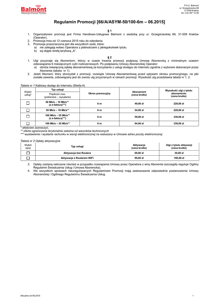 F.H.U. Balmont ul. Grzegórzecka 69 31-559 Kraków tel. (12) 397 12 00 Regulamin Promocji [66/A/ASYM-50/100-6m – 06.2015] 1. 2. 3. 1. 2. §1 Organizatorem promocji jest Firma Handlowo-Usługowa Balmont z siedzibą przy ul. Grzegórzeckiej 69, 31-559 Kraków (Operator). Promocja trwa od 12 czerwca 2015 roku do odwołania. Promocja przeznaczona jest dla wszystkich osób, które: a) nie zalegają wobec Operatora z płatnościami z jakiegokolwiek tytułu. b) są objęte strefą taryfową „A”. §2 Ulgi przyznaje się Abonentom, którzy w czasie trwania promocji podpiszą Umowę Abonencką z minimalnym czasem zobowiązania 6 miesięcznych cykli rozliczeniowych. Po podpisaniu Umowy Abonenckiej Operator: a) obniża miesięczną opłatę abonamentową za korzystanie z usługi dostępu do Internetu zgodnie z wyborem dokonanym przez Abonenta (tabela nr 1). Jeżeli Abonent, który skorzystał z promocji, rozwiąże Umowę Abonamentową przed upływem okresu promocyjnego, na jaki została zawarta, zobowiązany jest do zwrotu ulg przyznanych w ramach promocji. Wysokość ulg przedstawia tabela nr 1, 2. Tabela nr 1 Kablowy dostęp do Internetu (Strefa A) Typ usługi Wybór usług* Okres promocyjny Abonament (cena brutto) Wysokość ulgi z tytułu abonamentu (cena brutto) 50 Mb/s – 10 Mb/s** (z e-fakturą***) 6m 49,00 zł 228,00 zł Prędkość max. (pobierane – wysyłanie) 50 Mb/s – 10 Mb/s** 6m 54,00 zł 228,00 zł 100 Mb/s – 25 Mb/s** (z e-fakturą***) 6m 59,00 zł 336,00 zł 100 Mb/s – 25 Mb/s** 6m 64,00 zł 336,00 zł * właściwe zaznaczyć, ** oferta ograniczona terytorialnie zależna od warunków technicznych *** wystawienie i wysłanie rachunku w wersji elektronicznej na wskazany w Umowie adres poczty elektronicznej Tabela nr 2 Opłaty aktywacyjne Wybór opcji 3. 4. Typ usługi Aktywacja (cena brutto) Ulgi z tytułu aktywacji (cena brutto) Aktywacja bez Routera 69,00 zł 30,00 zł Aktywacja z Routerem WiFi 99,00 zł 100,00 zł Opłaty zostaną naliczone również w przypadku rozwiązania Umowy przez Operatora z winy Abonenta (szczegóły reguluje Ogólny Regulamin Świadczenia Usług i Umowa Abonencka). We wszystkich sprawach nieuregulowanych Regulaminem Promocji mają zastosowanie odpowiednie postanowienia Umowy Abonenckiej i Ogólnego Regulaminu Świadczenia Usług. Aktualne od 06.2015 1