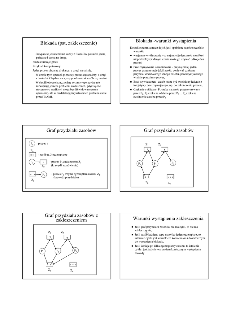 Blokada -warunki wystąpienia Blokada (pat, zakleszczenie) Przypadek: jednocześnie każdy z filozofów podniósł jedną pałeczkę i czeka na drugą. Skutek: umrą z głodu Przykład komputerowy: Jeden proces pisze na drukarce, a drugi na taśmie. W czasie tych operacji pierwszy proces żąda taśmy, a drugi - drukarki. Obydwa zaczynają czekanie aż zasób się zwolni. W chwili obecnej rzeczywiste systemy operacyjne nie rozwiązują jeszcze problemu zakleszczeń, gdyż są one stosunkowo rzadkie (i mogą być likwidowane przez operatora), ale w niedalekiej przyszłości ten problem stanie przed WAMI. Do zakleszczenia może dojść, jeśli spełnione są równocześnie warunki: wzajemne wykluczanie - co najmniej jeden zasób musi być niepodzielny (w danym czasie może go używać tylko jeden proces) Przetrzymywanie i oczekiwanie - przynajmniej jeden proces przetrzymuje jakiś zasób, ponieważ czeka na przydział dodatkowego innego zasobu, przetrzymywanego właśnie przez inny proces, Brak wywłaszczeń - zasób może być zwolniony jedynie z inicjatywy przetrzymującego, np. po zakończeniu procesu, Czekanie cykliczne: P1 czeka na zasób przetrzymywany przez P2, P2 czeka na oddanie przez P3 ... Pn czeka na zwolnienie zasobu przez P1 Graf przydziału zasobów Pn Graf przydziału zasobów - proces n Z1 Z3 Zn - zasób n, 3 egzemplarze - proces P3 żąda zasobu Z3 (krawędź zamówienia) P3 Z3 P1 P3 P2 - proces P1 trzyma egzemplarz zasobu Z2 (krawędź przydziału) P1 Z2 Z2 Graf przydziału zasobów z zakleszczeniem Warunki wystąpienia zakleszczenia Z1 Z3 P1 P3 P2 Z2 Z4 Z4 Jeśli graf przydziału zasobów nie ma cykli, to nie ma zakleszczenia, Z1 Jeśli zasób każdego typu ma tylko jeden egzemplarz, to istnienie cyklu jest warunkiem koniecznym i dostatecznym do wystąpienia blokady, Jeśli istnieje po kilka egzemplarzy zasobu, to istnienie cyklu jest jedynie warunkiem koniecznym wystąpienia blokady Metody postępowania z zakleszczeniami Stosowanie protokołu gwarantującego, że system nigdy nie wejdzie w stan zakleszczenia, Z1 Pozwolenie na występowanie zakleszczeń i podjęcie stosownych działań po takim fakcie, Zlekceważenie problemu (np. UNIX) - założenie, że zakleszczenia nie pojawiają się. Praktycznie w takich systemach zakleszczenia pojawiają się rzadko (np. raz do roku), więc raczej się nie inwestuje w kosztowne mechanizmy do unikania zakleszczeń lub ich likwidacji, a wykonuje się to ręcznie. Zapobieganie zakleszczeniom Trzeba zapewnić, aby nie wystąpił co najmniej jeden z warunków koniecznych: WzajemneZwykluczanie - nie można uniknąć tego 1 warunku, gdyż pewne zasoby są z natury niepodzielne, np. drukarki, Przetrzymywanie i oczekiwanie - trzeba zagwarantować, że gdy proces zamawia jakiś zasób, to nie przetrzymywuje innych zasobów - proces otrzymuje wszystkie zasoby przed rozpoczęciem działania, - proces może zamówić zasób, jeśli wcześniej oddał wszystkie pozostałe Wada- słabe wykorzystanie zasobów, możliwość głodzenia Zapobieganie zakleszczeniom, cd. Zapobieganie zakleszczeniom, cd. Brak wywłaszczeń - trzeba dopuścić, aby nie tylko proces mógł zwolnić zasoby Z1 - jeśli proces nie może dostać żądanego zasobu, to traci pozostałe i czeka na nie, - jeśli proces zamawia jakieś zasoby, to się sprawdza czy są dostępne jeśli tak, to się je przydziela, jeśli zasób jest trzymany przez inny proces, który czeka na jakieś zasoby, to mu się zasoby odbiera i daje zamawiającemu, w przeciwnym wypadku proces czeka i może utracić swoje zasoby. Unikanie zakleszczeń Każdy proces deklaruje maksymalną liczbę zasobów danego typu Z1 Stan przydziału zasobów jest określony przez liczbę dostępnych i przydzielonych zasobów oraz przez maksymalne zapotrzebowanie na zasoby Algorytm unikania zakleszczeń sprawdza stan przydziału zasobów i blokuje niektóre przydziały, aby nie doszło do czekania cyklicznego Jeśli porządek przydzielania zasobów procesom jest taki, że nie ma możliwości wystąpienia zakleszczeń, to system jest w stanie bezpiecznym Czekanie cykliczne - aby nie wystąpiło, trzeba zasobom tego samego typu nadać liczbowe identyfikatory (np. Z1 taśmy - 2, drukarki - 5) i trzeba dbać, aby proces zamawiał zasoby w rosnącym porządku numeracji, ewentualnie aby zwalniał zasoby o numeracji wyższej od zamawianego. Stan bezpieczny Jeżeli dla każdego procesu Pi (spośród P1..Pn) jego zapotrzebowanie na zasoby może być zaspokojone przez aktualnie dostępne zasoby, oraz przez zasoby używane Z1 przez wszystkie procesy Pj, gdzie j<i, to taki ciąg procesów jest bezpieczny. Jeżeli Pi nie ma danej chwili dostępnych wszystkich zasobów, to poczeka aż procesy Pj skończą działanie i oddadzą swoje zasoby Pi Po otrzymaniu wszystkich zasobów proces Pi może dokończyć pracę i zwolnić zasoby Wtedy proces Pi+1 może otrzymać zasoby (jeśli na nie czekał) itd. Graf przydziału zasobów - analiza stanu bezpiecznego Algorytm bankiera dla wielo-egzemplarzowych zasobów Z1 Z1 P1 P2 P1 P2 Z2 Z2 Stan zagrożenia Wykrywanie zakleszczeń Wywłaszczanie Jeśli nie unikamy zakleszczeń to w systemie muszą istnieć: a) Algorytmy wykrywania zakleszczenia Z1 b) Algorytmy likwidowania zakleszczenia ad. a): Tworzy się graf oczekiwania i okresowo wykonuje algorytm poszukiwania cykli w tym grafie ad. b): - Usunięcie wszystkich zakleszczonych procesów lub - Usuwanie procesów pojedynczo aż do wyeliminowania cyklu zakleszczenia Kryteria wyboru ofiary: 1. Priorytet 2. Czas wykonywania i pozostały do zakończenia, 3. Liczba i typ zasobów trzymanych przez proces, 4. Liczba procesów które trzeba będzie przerwać, 5. Proces interakcyjny czy wsadowy Mieszane metody unikania impasu zapobieganie unikanie wykrywanie Z1 Jeżeli podzielimy zasoby na różne klasy, np. a) zasoby wewnętrzne, zużywane przez system,np bloki kontrolne procesów, b) pamięć główna, c) zasoby zadania, np. przydzielone urządzenia, pliki d)