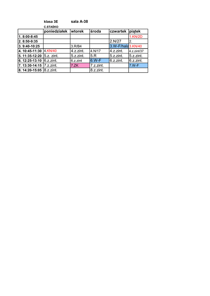 klasa 3E sala A-38 C.STAŚKO poniedziałek wtorek 1. 8:00-8:45 2. 8:50-9:35 3. 9:40-10:25 4. 10:45-11:30 5. 11:35-12:20 6. 12:25-13:10 7. 13:30-14:15 8. 14:20-15:05 środa 1.KN/2D 2.N/27 2. 3.W-F/hala 3.KN/40 3.R/B4 4.KN/40 5.z. zint. 6.z.zint. 7.z.zint. 8.z.zint. 4.z.zint. 5.z.zint. 6.z.zint 7.ZK czwartek piątek 4.N/17 5.R 6.W-F 7.z.zint. 8.z.zint. 4.z.zint. 5.z.zint. 6.z.zint. 4.z.zint/37 5.z.zint. 6.z.zint. 7.W-F