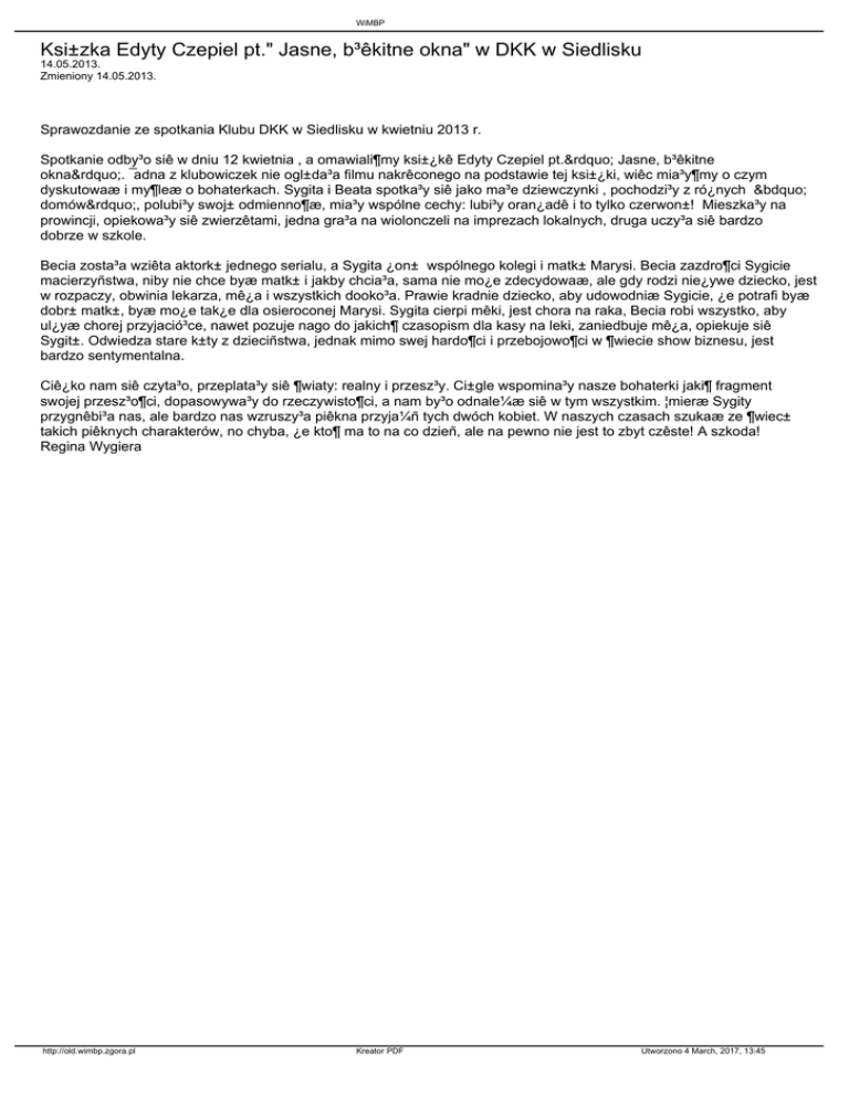 WiMBP Ksi±zka Edyty Czepiel pt." Jasne, b³êkitne okna" w DKK w Siedlisku 14.05.2013. Zmieniony 14.05.2013. Sprawozdanie ze spotkania Klubu DKK w Siedlisku w kwietniu 2013 r. Spotkanie odby³o siê w dniu 12 kwietnia , a omawiali¶my ksi±¿kê Edyty Czepiel pt.” Jasne, b³êkitne okna”. ¯adna z klubowiczek nie ogl±da³a filmu nakrêconego na podstawie tej ksi±¿ki, wiêc mia³y¶my o czym dyskutowaæ i my¶leæ o bohaterkach. Sygita i Beata spotka³y siê jako ma³e dziewczynki , pochodzi³y z ró¿nych „ domów”, polubi³y swoj± odmienno¶æ, mia³y wspólne cechy: lubi³y oran¿adê i to tylko czerwon±! Mieszka³y na prowincji, opiekowa³y siê zwierzêtami, jedna gra³a na wiolonczeli na imprezach lokalnych, druga uczy³a siê bardzo dobrze w szkole. Becia zosta³a wziêta aktork± jednego serialu, a Sygita ¿on± wspólnego kolegi i matk± Marysi. Becia zazdro¶ci Sygicie macierzyñstwa, niby nie chce byæ matk± i jakby chcia³a, sama nie mo¿e zdecydowaæ, ale gdy rodzi nie¿ywe dziecko, jest w rozpaczy, obwinia lekarza, mê¿a i wszystkich dooko³a. Prawie kradnie dziecko, aby udowodniæ Sygicie, ¿e potrafi byæ dobr± matk±, byæ mo¿e tak¿e dla osieroconej Marysi. Sygita cierpi mêki, jest chora na raka, Becia robi wszystko, aby ul¿yæ chorej przyjació³ce, nawet pozuje nago do jakich¶ czasopism dla kasy na leki, zaniedbuje mê¿a, opiekuje siê Sygit±. Odwiedza stare k±ty z dzieciñstwa, jednak mimo swej hardo¶ci i przebojowo¶ci w ¶wiecie show biznesu, jest bardzo sentymentalna. Ciê¿ko nam siê czyta³o, przeplata³y siê ¶wiaty: realny i przesz³y. Ci±gle wspomina³y nasze bohaterki jaki¶ fragment swojej przesz³o¶ci, dopasowywa³y do rzeczywisto¶ci, a nam by³o odnale¼æ siê w tym wszystkim. ¦mieræ Sygity przygnêbi³a nas, ale bardzo nas wzruszy³a piêkna przyja¼ñ tych dwóch kobiet. W naszych czasach szukaæ ze ¶wiec± takich piêknych charakterów, no chyba, ¿e kto¶ ma to na co dzieñ, ale na pewno nie jest to zbyt czêste! A szkoda! Regina Wygiera http://old.wimbp.zgora.pl Kreator PDF Utworzono 4 March, 2017, 13:45
