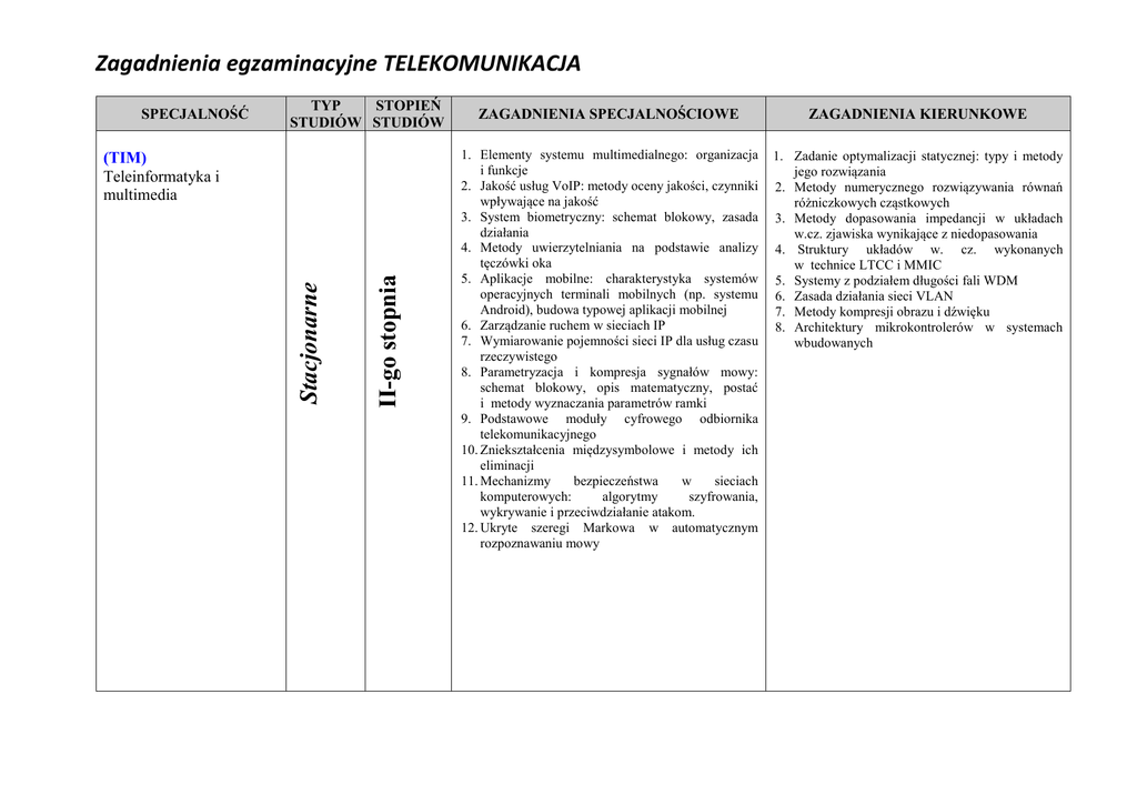 Zagadnienia egzaminacyjne TELEKOMUNIKACJA SPECJALNOŚĆ TYP STOPIEŃ STUDIÓW STUDIÓW II-go stopnia Stacjonarne (TIM) Teleinformatyka i multimedia ZAGADNIENIA SPECJALNOŚCIOWE ZAGADNIENIA KIERUNKOWE 1. Elementy systemu multimedialnego: organizacja i funkcje 2. Jakość usług VoIP: metody oceny jakości, czynniki wpływające na jakość 3. System biometryczny: schemat blokowy, zasada działania 4. Metody uwierzytelniania na podstawie analizy tęczówki oka 5. Aplikacje mobilne: charakterystyka systemów operacyjnych terminali mobilnych (np. systemu Android), budowa typowej aplikacji mobilnej 6. Zarządzanie ruchem w sieciach IP 7. Wymiarowanie pojemności sieci IP dla usług czasu rzeczywistego 8. Parametryzacja i kompresja sygnałów mowy: schemat blokowy, opis matematyczny, postać i metody wyznaczania parametrów ramki 9. Podstawowe moduły cyfrowego odbiornika telekomunikacyjnego 10. Zniekształcenia międzysymbolowe i metody ich eliminacji 11. Mechanizmy bezpieczeństwa w sieciach komputerowych: algorytmy szyfrowania, wykrywanie i przeciwdziałanie atakom. 12. Ukryte szeregi Markowa w automatycznym rozpoznawaniu mowy 1. Zadanie optymalizacji statycznej: typy i metody jego rozwiązania 2. Metody numerycznego rozwiązywania równań różniczkowych cząstkowych 3. Metody dopasowania impedancji w układach w.cz. zjawiska wynikające z niedopasowania 4. Struktury układów w. cz. wykonanych w technice LTCC i MMIC 5. Systemy z podziałem długości fali WDM 6. Zasada działania sieci VLAN 7. Metody kompresji obrazu i dźwięku 8. Architektury mikrokontrolerów w systemach wbudowanych Zagadnienia egzaminacyjne TELEKOMUNIKACJA SPECJALNOŚĆ TYP STOPIEŃ STUDIÓW STUDIÓW II-go stopnia Stacjonarne (TMT) Modern Telecomunications ZAGADNIENIA SPECJALNOŚCIOWE ZAGADNIENIA KIERUNKOWE 1. Elements of the multimedia system: organization and functions. 2. EDFA amplifier 3. Photonic crystal fiber structures 4. Satellite networks: structure and the parameters 5. Link budget of a satellite link 6. Mobile networks: the characteristics of the next generation, structure, functions of components, operation, transmission techniques and protocols 7. Principles of mobile network planning: requirements relating to electromagnetic compatibility 8. Traffic management in IP networks 9. Dimensioning capacity IP network for real-time services 10. Basic modules of a digital telecommunication receiver 11. The architecture of the IPTV, division for the domain 12. Security mechanisms in computer networks: encryption algorithms, detecting and preventing attacks. 1. Static optimization task: types and methods of its solution 2. Methods of numerical solution of partial differential equations 3. Impedance matching methods in RF systems and phenomena arising from the mismatch 4. Structures of RF made in LTCC technology and MMIC 5. WDM systems, WDM transmission capabilities 6. Principle of VLAN 7. Methods for image and sound compression 8. Microcontrollers architecture for embedded systems. Zagadnienia egzaminacyjne TELEKOMUNIKACJA SPECJALNOŚĆ TYP STOPIEŃ STUDIÓW STUDIÓW II-go stopnia Stacjonarne (TSM) Teleinformatyczne sieci mobilne ZAGADNIENIA SPECJALNOŚCIOWE ZAGADNIENIA KIERUNKOWE 1. Parametry elektryczne anten: obwodowe i polowe 2. Formowanie wiązki w układach antenowych 3. Sieci satelitarne: parametry, budowa 4. Bilans energetyczny łącza satelitarnego 5. Metody transmisji z potwierdzeniem ARQ: sposób realizacji, ocena efektywności 6. Sieci mobilne: charakterystyka kolejnych generacji, struktura, funkcje elementów, sposób działania, techniki transmisyjne i protokoły. 7. Zasady planowania sieci mobilnych: wymagania związane z kompatybilnością elektromagnetyczną 8. Wpływ pola elektromagnetycznego na organizmy żywe: źródła pola, normy, charakterystyka środowiska EM 9. Metrologia pola elektromagnetycznego: wielkości mierzone, metody i procedury pomiarowe 10. Utrzymanie i zarządzanie sieciami mobilnymi 11. Kodowanie i modulacja w cyfrowych systemach radiowych i telewizyjnych 12. Standardy telewizji cyfrowej: parametry transmisyjne, charakterystyki systemów DVBT/C/S/H. 1. Zadanie optymalizacji statycznej: typy i metody jego rozwiązania 2. Metody numerycznego rozwiązywania równań różniczkowych cząstkowych 3. Metody dopasowania impedancji w układach w. cz. i zjawiska wynikające z niedopasowania 4. Struktury układów w. cz. wykonanych w technice LTCC i MMIC 5. Systemy z podziałem długości fali WDM 6. Zasada działania sieci VLAN 7. Metody kompresji obrazu i dźwięku 8. Architektury mikrokontrolerów w systemach wbudowanych Zagadnienia egzaminacyjne TELEKOMUNIKACJA SPECJALNOŚĆ TYP STOPIEŃ STUDIÓW STUDIÓW II-go stopnia Niestacjonarne (TIM) Teleinformatyka i multimedia ZAGADNIENIA SPECJALNOŚCIOWE 1. Elementy systemu multimedialnego: organizacja i funkcje 2. Jakość usług VoIP: metody oceny jakości, czynniki wpływające na jakość 3. System biometryczny: schemat blokowy, zasada działania 4. Metody uwierzytelniania na podstawie analizy tęczówki oka. 5. Aplikacje mobilne: charakterystyka systemów operacyjnych terminali mobilnych (np. systemu Android), budowa typowej aplikacji mobilnej 6. Zarządzanie ruchem w sieciach IP 7. Wymiarowanie pojemności sieci IP dla usług czasu rzeczywistego 8. Parametryzacja i kompresja sygnałów mowy: schemat blokowy, opis matematyczny, postać i metody wyznaczania parametrów ramki 9. Podstawowe moduły cyfrowego odbiornika telekomunikacyjnego 10. Zniekształcenia międzysymbolowe i metody ich eliminacji 11. Mechanizmy bezpieczeństwa w sieciach komputerowych: algorytmy szyfrowania, wykrywanie i przeciwdziałanie atakom 12. Ukryte szeregi Markowa w autentycznym rozpoznawaniu mowy ZAGADNIENIA KIERUNKOWE 1. Zadanie optymalizacji statycznej: typy i metody jego rozwiązania 2. Metody numerycznego rozwiązywania równań różniczkowych cząstkowych 3. Metody dopasowania impedancji w układach w. cz.i zjawiska wynikające z niedopasowania 4. Strukt