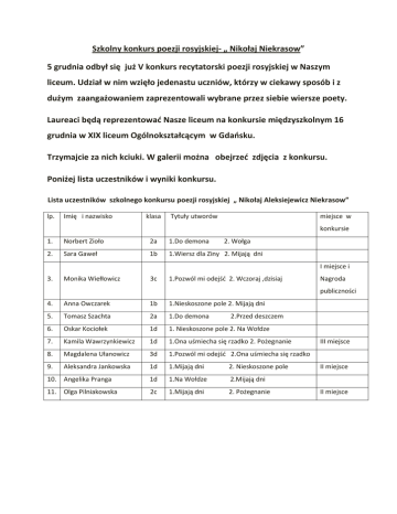 Szkolny konkurs poezji rosyjskiej- „ Nikołaj Niekrasow” 5 grudnia odbył się już V konkurs recytatorski poezji rosyjskiej w Naszym liceum. Udział w nim wzięło jedenastu uczniów, którzy w ciekawy sposób i z dużym zaangażowaniem zaprezentowali wybrane przez siebie wiersze poety. Laureaci będą reprezentowad Nasze liceum na konkursie międzyszkolnym 16 grudnia w XIX liceum Ogólnokształcącym w Gdaosku. Trzymajcie za nich kciuki. W galerii można obejrzed zdjęcia z konkursu. Poniżej lista uczestników i wyniki konkursu. Lista uczestników szkolnego konkursu poezji rosyjskiej „ Nikołaj Aleksiejewicz Niekrasow” lp. Imię i nazwisko klasa Tytuły utworów miejsce w konkursie 1. Norbert Zioło 2a 1.Do demona 2. Wołga 2. Sara Gaweł 1b 1.Wiersz dla Ziny 2. Mijają dni I miejsce i 3. Monika Wiełłowicz 3c 1.Pozwól mi odejśd 2. Wczoraj ,dzisiaj Nagroda publiczności 4. Anna Owczarek 1b 1.Nieskoszone pole 2. Mijają dni 5. Tomasz Szachta 2a 1.Do demona 6. Oskar Kociołek 1d 1. Nieskoszone pole 2. Na Wołdze 7. Kamila Wawrzynkiewicz 1d 1.Ona uśmiecha się rzadko 2. Pożegnanie 8. Magdalena Ułanowicz 3d 1.Pozwól mi odejśd 2.Ona uśmiecha się rzadko 9. Aleksandra Jankowska 1d 1.Mijają dni 2. Nieskoszone pole 10. Angelika Pranga 1d 1.Na Wołdze 2.Mijają dni 11. Olga Pilniakowska 2c 1.Mijają dni 2. Pożegnanie 2.Przed deszczem III miejsce II miejsce II miejsce