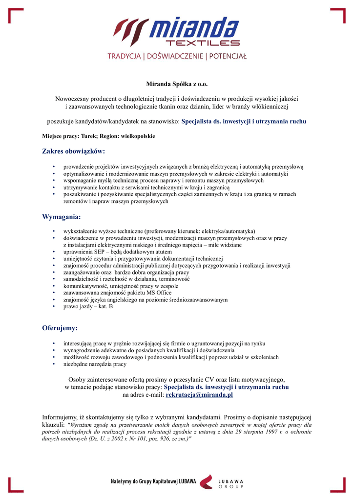 Miranda Spółka z o.o. Nowoczesny producent o długoletniej tradycji i doświadczeniu w produkcji wysokiej jakości i zaawansowanych technologicznie tkanin oraz dzianin, lider w branży włókienniczej poszukuje kandydatów/kandydatek na stanowisko: Specjalista ds. inwestycji i utrzymania ruchu Miejsce pracy: Turek; Region: wielkopolskie Zakres obowiązków: • • • • • prowadzenie projektów inwestycyjnych związanych z branżą elektryczną i automatyką przemysłową optymalizowanie i modernizowanie maszyn przemysłowych w zakresie elektryki i automatyki wspomaganie myślą techniczną procesu naprawy i remontu maszyn przemysłowych utrzymywanie kontaktu z serwisami technicznymi w kraju i zagranicą poszukiwanie i pozyskiwanie specjalistycznych części zamiennych w kraju i za granicą w ramach remontów i napraw maszyn przemysłowych Wymagania: • • • • • • • • • • • wykształcenie wyższe techniczne (preferowany kierunek: elektryka/automatyka) doświadczenie w prowadzeniu inwestycji, modernizacji maszyn przemysłowych oraz w pracy z instalacjami elektrycznymi niskiego i średniego napięcia – mile widziane uprawnienia SEP – będą dodatkowym atutem umiejętność czytania i przygotowywania dokumentacji technicznej znajomość procedur administracji publicznej dotyczących przygotowania i realizacji inwestycji zaangażowanie oraz bardzo dobra organizacja pracy samodzielność i rzetelność w działaniu, terminowość komunikatywność, umiejętność pracy w zespole zaawansowana znajomość pakietu MS Office znajomość języka angielskiego na poziomie średniozaawansowanym prawo jazdy – kat. B Oferujemy: • • • • interesującą pracę w prężnie rozwijającej się firmie o ugruntowanej pozycji na rynku wynagrodzenie adekwatne do posiadanych kwalifikacji i doświadczenia możliwość rozwoju zawodowego i podnoszenia kwalifikacji poprzez udział w szkoleniach niezbędne narzędzia pracy Osoby zainteresowane ofertą prosimy o przesyłanie CV oraz listu motywacyjnego, w temacie podając stanowisko pracy: Specjalista ds. inwestycji i utrzymania ruchu na adres e-mail: [email protected] Informujemy, iż skontaktujemy się tylko z wybranymi kandydatami. Prosimy o dopisanie następującej klauzuli: "Wyrażam zgodę na przetwarzanie moich danych osobowych zawartych w mojej ofercie pracy dla potrzeb niezbędnych do realizacji procesu rekrutacji zgodnie z ustawą z dnia 29 sierpnia 1997 r. o ochronie danych osobowych (Dz. U. z 2002 r. Nr 101, poz. 926, ze zm.)"