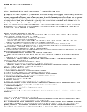 GUGiK ogłosił przetarg na Geoportal 2 MZ Główny Urząd Geodezji i Kartografii zamawia usługi IT o wartości 21 mln zł netto. Ruszył kolejny duży przetarg informatyczny. Urzędnicy w trybie ograniczonym przyspieszonym zamawiają „implementację i utrzymanie usług Inspire i ich brokera krajowego, brokera branżowego oraz szkolenia, na potrzeby projektu Geoportal 2”. Wybrana procedura i termin składania dokumentów prawdopodobnie mocno ograniczą konkurencję. Na wnioski o udział w postępowaniu GUGiK czeka tylko do przyszłego wtorku (29.06). Tłumaczy, że pośpiech jest konieczny, żeby dotrzymać terminów założonych w harmonogramie prac projektowych. Do drugiego etapu będzie mogło przejść 8 oferentów. Co ciekawe oferty będą oceniane głównie pod względem techniczno-jakościowym (60 proc.) a dopiero na drugim miejscu pod względem ceny (40 proc.) Według szacunków zamawiającego przetarg jest wart 16,5 mln zł netto. Jednocześnie GUGiK ogłosił przetarg na wsparcie "przy realizacji projektów GBDOT i TERYT 2 w zakresie: doradztwa merytoryczno-technicznego, zarządzania oraz pomocy prawnej." Wartość tych prac wynosi 5 mln zł, a przetarg jest otwarty dla wszystkich. Dokładny opis przedmiotu zamówienia na Geoportal 2: „W ramach realizacji przedmiotu zamówienia Wykonawca zobowiązany będzie do wykonania dostaw i wdrożenia systemu Geoportal 2. System Geoportal 2 dostarczał będzie między innymi usługi: — usługi bezpieczeństwa dostarczające m.in. następujące funkcjonalności: —— uwierzytelnienie użytkowników systemu Geoportal 2, —— autoryzacja użytkowników, przy czym przedmiotem polityki dostępu są zasoby systemu Geoportal 2, w tym m.in. usługi i dane, — usługi integracji usług przestrzennych dostarczające m.in. następujące funkcjonalności: —— integrację i udostępnienie w zunifikowany sposób usług danych przestrzennych zdefiniowanych dyrektywą Inspire, —— udostępnienie usług do danych przestrzennych, które nie zostały dostosowane do wymagań dyrektywy Inspire lub nie zostały udostępnione zgodnie z wymaganiami określonymi dyrektywą Inspire, — usługi branżowe umożliwiające jednorodny dostęp do wybranych usług SGiK, — usługi elektronicznego archiwum danych przestrzennych pełniącego rolę centralnej ewidencji oraz archiwum elektronicznych kopii danych państwowego zasobu geodezyjnego i kartograficznego; — usługi zarządzania treścią portalu dostarczające m.in. następujące funkcjonalności: —— obsługę treści udostępnianych w ramach systemu Geoportal 2 (w tym publikowanie, przeglądanie, edycję, usuwanie i archiwizację treści), — usługi obsługi zamówień dostarczające m.in. następujące funkcjonalności: —— jednolita obsługa wszystkich zamówień realizowanych przy pomocy systemu Geoportal 2, w tym sprzedaży produktów i usług udostępnianych przez system Geoportal 2, — usługi lokalizacji przestrzennej nazw geograficznych i adresów, — usługi zarządzania i monitorowania dostarczające m.in. następujące funkcjonalności: —— kompleksowa i jednolita dla całego systemu obsługa mechanizmów monitorowania udostępnianych zasobów, w tym w szczególności wsparcie w przygotowaniu raportów wymaganych Dyrektywą Inspire. Dodatkowo w ramach realizacji prac należy: 1) opracować stosowne dokumenty zarządcze; 2) opracować zasady oraz wymagania dotyczące bezpieczeństwa informacji; 3) przygotować i przeprowadzić szkolenia z zakresu wdrożonego oprogramowania; 4) świadczyć usługi serwisowe oraz wsparcie w bieżącym administrowaniu i rozwoju systemem; 5) uruchomić serwer katalogowy z bazą danych metadanych. Na zadanie to złoży się m.in.: a. projekt architektury usług katalogowych w Polsce; b. projekt bazy danych i serwera katalogowego; c. testowanie i wdrożenie; d. zasilenie bazy metadanych metadanymi usług i zbiorów danych przestrzennych. Wdrożenie węzła centralnego w ramach projektu Geoportal 2 zakłada wykorzystanie wykonanych już w ramach projektu geoportal.gov.pl elementów. W zależności od zadań wykonywanych przez węzeł centralny elementy te zostaną: — przeniesione bez modyfikacji, — rozszerzone o nowe funkcjonalności wynikające z nowych zadań, — zaimplementowane od nowa. Wdrożenie węzła centralnego w ramach przedmiotowego zadania zostanie przeprowadzone w oparciu o architekturę SOA (Service Oriented Architecture).” Uzasadnienie wyboru procedury ograniczonej przyspieszonej: "Zgodnie z art. 49 ust. 3 pkt. 1 ustawy Pzp, jeżeli zachodzi pilna potrzeba udzielenia zamówienia, zamawiający może wyznaczyć krótszy termin składania wniosków o dopuszczenie do udziału w przetargu ograniczonym. Prace związane z realizacją zadania „Implementacja i utrzymanie usług Inspire i ich brokera krajowego, brokera branżowego oraz szkolenia, na potrzeby projektu Geoportal 2” muszą zostać skoordynowane z harmonogramem rzeczowym projektu Geoportal 2. Niedotrzymanie terminów wynikających z zaakceptowanego harmonogramu może się przyczynić do powstania ujemnych skutków finansowych dla Zamawiającego. Wcześniejsze uruchomienie procedury przetargowej nie było możliwe ze względu na konieczność dopasowania planowanych działań oraz wytwarzanych w ramach zadania produktów do nowopowstałych ram prawnych określonych przez Ustawę z dnia 4.3.2010 o Infrastrukturze Informacji Przestrzennej, która weszła w życie 7.6.2010. Aby dotrzymać terminów założonych w harmonogramie prac projektowych niezbędne jest zatem uruchomienie prac w trybie przyśpieszonym." Chcesz otrzymywać więcej informacji przetargowych, przeglądy prasy, inne informacje, zapisz się na nasz newsletter (wystarczy podać adres e-mail). 24 czerwca 2010 10:39