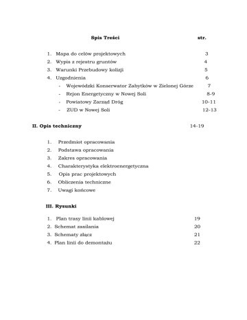 Spis Treści str. 1. Mapa do celów projektowych 3 2. Wypis z rejestru gruntów 4 3. Warunki Przebudowy kolizji 5 4. Uzgodnienia 6 - Wojewódzki Konserwator Zabytków w Zielonej Górze 7 - Rejon Energetyczny w Nowej Soli 8-9 - Powiatowy Zarząd Dróg 10-11 - ZUD w Nowej Soli 12-13 II. Opis techniczny 1. Przedmiot opracowania 2. Podstawa opracowania 3. Zakres opracowania 4. Charakterystyka elektroenergetyczna 5. Opis prac projektowych 6. Obliczenia techniczne 7. Uwagi końcowe 14-19 III. Rysunki 1. Plan trasy linii kablowej 19 2. Schemat zasilania 20 3. Schematy złącz 21 4. Plan linii do demontażu 22 Opis Techniczny 1. Przedmiot opracowania Przedmiotem opracowania jest projekt budowlany przebudowy istniejącej linii napowietrznej kolidującej z projektowaną przebudowy ulic Szerokiej, Kościelnej, Plac Floriana na kablowe wraz z przyłączami. 2 . Podstawa opracowania * * * * * * Zlecenie inwestora Decyzja o warunkach zabudowy i zagospodarowaniu terenu Warunki przebudowy kolizji Mapa do celów projektowych w skali 1:500 Inwentaryzacja w terenie Przepisy budowy urządzeń elektroenergetycznych oraz obowiązujące normy branżowe. 3. Zakres • • • • opracowania : Budowa kabli Montaż złącz kablowych Wykonanie WLZ Demontaż linii napowietrznej 4. Charakterystyka elektroenergetyczna - napięcie sieci - układ pracy sieci - dopuszczalny procentowy spadek napięcia - obliczeniowy 5. Linie kablowe 400/230V TNC du% = 10 % cos ϕ = 0,93 Spełniając wymagania inwestora i na podstawie wytycznych wydanych przez OD Zielona Góra, RD Nowa Sól w warunkach usunięcia kolizji i zgodnie z obowiązującymi przepisami zaprojektowano: a) Kabel nn o,4 kV Istniejący kabel 0,4 kV YAKY 4x120mm2 relacji stacja transformatorowa S-6511 a słup wirowany u zbiegu ulic Szerokiej i Kuśnierskiej należy zdjąć ze słupa i wprowadzić do projektowanego złącza kablowego SKV-7 nr1. Do złącza nr 1 należy wprowadzić również pozostałe kale istniejące Od stacji transformatorowej S-6517 ułożyć nowy odcinek kabla Z projektowanego złącza ułożyć kabel YAKY 4 x 120mm2 do projektowanego złącza ZK-3 zlokalizowanego na budynku nr 1przy ul. Kościelnej zasilające kościół, plebanię i budynek nr1. Stronę prawą ulicy Szerokiej zasilić z projektowanego złącza nr 1 kablem YAKY 4 x 120mm2 prowadzonym przelotowo poprzez projektowane złącza zlokalizowane zgodnie z planem do istniejącego przy Placu Wyzwolenia złącza ZK-1 nr 516/9/6 które należy wymienić na ZK-2. W celu zasilania strony lewej ul. Szerokiej należy istniejący kabel YAKY 4 x 120mm2 relacji stacja transformatorowa S-6511 a słup wirowany przy ul. Szerokiej nr 18 dł. 100mb.zdjąć ze słupa i połączyć z projektowanym odcinkiem kabla poprzez mufę przelotową ZRM-3. Od mufy ułożyć kabel YAKY 4 x 120mm2 który wprowadzić do projektowanego złącza ZK-3 nr 16 i dalej przelotowo poprzez projektowane złącza zlokalizowane zgodnie z planem sytuacyjnym do miejsca wykonania mufy kablowej z kablem YAKY 4 x 120mm2 zdjętym z istniejącego słupa po drugiej stronie ul. Szerokiej. Kable należy układać na głębokości 0,7 m mierząc od powierzchni ziemi do zewnętrznej powierzchni kabla. W przypadku gruntu piaszczystego kable należy układać faliście bezpośrednio na dnie wykopu. W innych przypadkach gdy dno wykopu jest kamieniste lub istniejące zanieczyszczenia ziemi w postaci ostrego żwiru, grysu i inne mogące uszkodzić izolację kabla należy wykonać 10cm podsypkę pod kabel z żółtego piasku, następnie ułożyć kabel i zasypać go 10cm warstwą piasku oraz 15cm warstwą gruntu rodzimego. Następnie rozciągnąć na całej długości trasy kabla folię ostrzegawczą koloru niebieskiego o szerokości 25cm i grubości co najmniej 0,5mm a wykop zasypać pozostałym gruntem. W ziemi kable należy zaopatrzyć w trwałe oznaczniki informacyjne umieszczone co 10m wzdłuż trasy kabli, po obu stronach przepustów oraz na zapasach kabli, których treść uzgodnić w RD Nowa Sól. W miejscu wykonania mufy należy pozostawić zapas kabla dł.1,0 m. W przypadku kolizji projektowanego kabla z istniejącym uzbrojeniem podziemnym należy nałożyć na projektowane kabe przepusty ochronne PCV typu DVK ϕ 110. Przejście kabli pod ulicą Kuśnierską i Kościelną wykonać przeciskiem na głębokości 1,2 m od powierzchni drogi, a kable prowadzić w rurach osłonowych PCV typu AROT SRS ϕ 110. b) WLZ Istniejących odbiorców zasilanych obecnie z linii napowietrznej należy w uzgodnieniu z RD Nowa Sól przełączyć na zasilanie kablowe. Z poszczególnych złącz wyprowadzić należy WLZ które należ połączyć poprzez puszki rozgałęźne z istniejącymi instalacjami budynków. Puszki łączeniowe należy przystosować do oplombowania. c) Linia napowietrzna nn Linię napowietrzną kolidujący z projektowaną rozbudową i przebudową drogi należy zdemontować. Materiały z demontażu przekazać na magazyn RD Nowa Sól. d) Złącza kablowe 1) złącze nr 1, SKV-7 (sklep Arras) Złącze kablowe SKV-7 wykonane z tworzywa sztucznego wolnostojące należy usytuować przy bocznej ścianie sklepu Arras od strony drogi dojazdowej, zwrócone drzwiczkami od ulicy Szerokiej z możliwością swobodnego ich otwierania (szczegóły rys. nr1). 2) złącze nr 2, ZK-3 (ul. Kościelna 1) Złącze kablowe ZK-3 wykonane z tworzywa sztucznego wolnostojące należy usytuować przy wejściu do budynku od strony drogi dojazdowej, zwrócone drzwiczkami do ulicy Kościelnej z możliwością swobodnego ich otwierania (szczegóły rys. nr 2). 3) złącze nr 3, ZK-2 (ul. Szeroka 17) Złącze kablowe ZK-2 wykonane z tworzywa sztucznego wnękowe należy usytuować przy wejściu do budynku nr 17 od strony drogi dojazdowej, zwrócone drzwiczkami do ulicy Szerokiej z możliwością swobodnego ich otwierania (szczegóły rys. nr 3). 4) złącze nr 4, ZK-2 (ul. pasaż) Złącze kablowe ZK-2 wykonane z tworzywa sztucznego wnękowe należy usytuować na bocznej ści