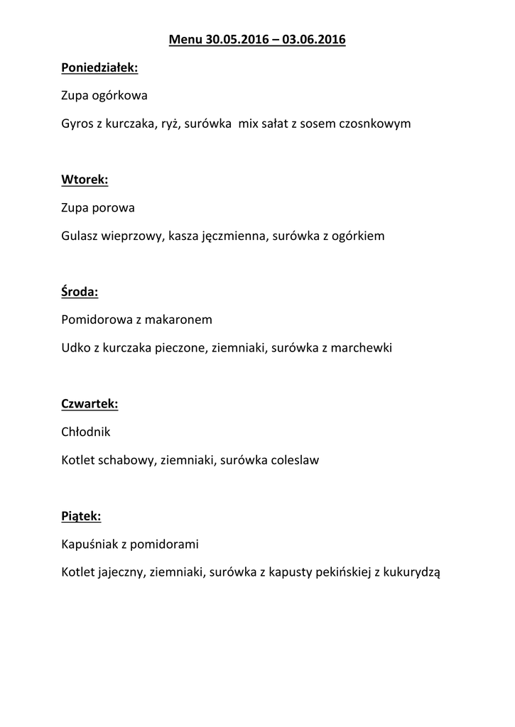 Menu 30.05.2016 – 03.06.2016 Poniedziałek: Zupa ogórkowa Gyros z kurczaka, ryż, surówka mix sałat z sosem czosnkowym Wtorek: Zupa porowa Gulasz wieprzowy, kasza jęczmienna, surówka z ogórkiem Środa: Pomidorowa z makaronem Udko z kurczaka pieczone, ziemniaki, surówka z marchewki Czwartek: Chłodnik Kotlet schabowy, ziemniaki, surówka coleslaw Piątek: Kapuśniak z pomidorami Kotlet jajeczny, ziemniaki, surówka z kapusty pekińskiej z kukurydzą