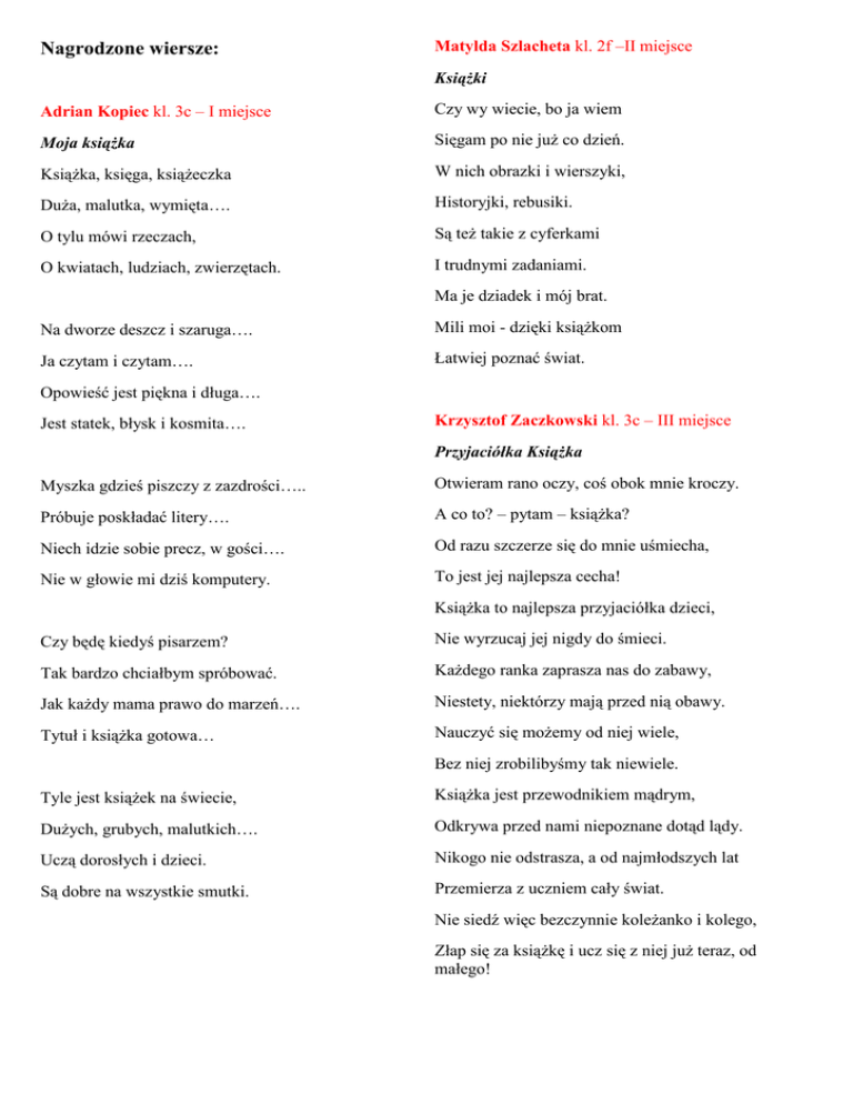 Nagrodzone wiersze: Matylda Szlacheta kl. 2f –II miejsce KsiąŜki Adrian Kopiec kl. 3c – I miejsce Czy wy wiecie, bo ja wiem Moja ksiąŜka Sięgam po nie juŜ co dzień. KsiąŜka, księga, ksiąŜeczka W nich obrazki i wierszyki, DuŜa, malutka, wymięta…. Historyjki, rebusiki. O tylu mówi rzeczach, Są teŜ takie z cyferkami O kwiatach, ludziach, zwierzętach. I trudnymi zadaniami. Ma je dziadek i mój brat. Na dworze deszcz i szaruga…. Mili moi - dzięki ksiąŜkom Ja czytam i czytam…. Łatwiej poznać świat. Opowieść jest piękna i długa…. Jest statek, błysk i kosmita…. Krzysztof Zaczkowski kl. 3c – III miejsce Przyjaciółka KsiąŜka Myszka gdzieś piszczy z zazdrości….. Otwieram rano oczy, coś obok mnie kroczy. Próbuje poskładać litery…. A co to? – pytam – ksiąŜka? Niech idzie sobie precz, w gości…. Od razu szczerze się do mnie uśmiecha, Nie w głowie mi dziś komputery. To jest jej najlepsza cecha! KsiąŜka to najlepsza przyjaciółka dzieci, Czy będę kiedyś pisarzem? Nie wyrzucaj jej nigdy do śmieci. Tak bardzo chciałbym spróbować. KaŜdego ranka zaprasza nas do zabawy, Jak kaŜdy mama prawo do marzeń…. Niestety, niektórzy mają przed nią obawy. Tytuł i ksiąŜka gotowa… Nauczyć się moŜemy od niej wiele, Bez niej zrobilibyśmy tak niewiele. Tyle jest ksiąŜek na świecie, KsiąŜka jest przewodnikiem mądrym, DuŜych, grubych, malutkich…. Odkrywa przed nami niepoznane dotąd lądy. Uczą dorosłych i dzieci. Nikogo nie odstrasza, a od najmłodszych lat Są dobre na wszystkie smutki. Przemierza z uczniem cały świat. Nie siedź więc bezczynnie koleŜanko i kolego, Złap się za ksiąŜkę i ucz się z niej juŜ teraz, od małego! Maja Jarka kl. 3d – wyróŜnienie Patrycja Wójcicka kl. 3b - wyróŜnienie Przygoda zamknięta w ksiąŜce KsiąŜka to bardzo cenna rzecz. Tu okładka Gdy ją weźmiesz z półki, Tam okładka W krainę marzeń przeniesiesz się. W środku DŜungle odwiedzisz i zamek teŜ, Kartka Zrób to, gdy tylko chcesz. Jedna, druga, KsiąŜka nie gryzie, otwórz ją. A z nich Przeczytaj, to fajna rzecz. Wiedza do mnie mruga. Poproś swą mamę, babcię, wujka teŜ. On ci poczyta i w krainę marzeń przeniosą Cię. To nie jest trudne zadanie, Kroki są trzy: weź przeczytaj i zakończ ją. KsiąŜki czekają z wiarą i nadzieją: „Niech czytelnicy mnie kochają”! Wojtek Bołoz kl. 2a - wyróŜnienie JuŜ czytam Czytać juŜ się nauczyłem. Więc ksiąŜki bardzo polubiłem. Franklin na mnie w bibliotece czeka Bawić i uczyć nie zwleka. Kubuś Puchatek do Stumilowego Lasu zaprasza mnie. O swych przygodach opowiadać chce. Czytaj ksiąŜki.