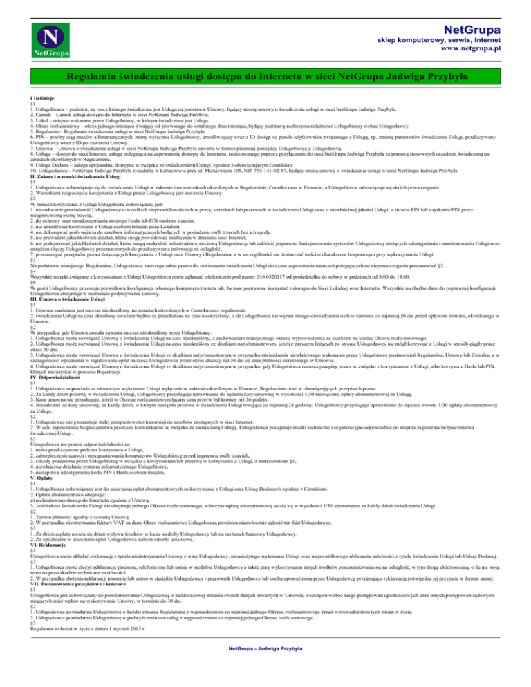 NetGrupa sklep komputerowy, serwis, Internet www.netgrupa.pl Regulamin świadczenia usługi dostępu do Internetu w sieci NetGrupa Jadwiga Przybyła I Definicje §1 1. Usługobiorca – podmiot, na rzecz którego świadczona jest Usługa na podstawie Umowy, będący stroną umowy o świadczenie usługi w sieci NetGrupa Jadwiga Przybyła. 2. Cennik – Cennik usługi dostępu do Internetu w sieci NetGrupa Jadwiga Przybyła. 3. Lokal – miejsce wskazane przez Usługobiorcę, w którym świadczona jest Usługa. 4. Okres rozliczeniowy – okres jednego miesiąca trwający od pierwszego do ostatniego dnia miesiąca, będący podstawą rozliczenia należności Usługobiorcy wobec Usługodawcy. 5. Regulamin – Regulamin świadczenia usługi w sieci NetGrupa Jadwiga Przybyła. 6. PIN – poufny ciąg znaków alfanumerycznych, znany wyłącznie Usługobiorcy, umożliwiający wraz z ID dostęp od panelu użytkownika związanego z Usługą, np. zmianę parametrów świadczenia Usługi, przekazywany Usługobiorcy wraz z ID po zawarciu Umowy. 7. Umowa – Umowa o świadczenie usługi w sieci NetGrupa Jadwiga Przybyła zawarta w formie pisemnej pomiędzy Usługobiorcą a Usługodawcą. 8. Usługa – dostęp do sieci Internet; usługa polegająca na zapewnieniu dostępu do Internetu, realizowanego poprzez przyłączenie do sieci NetGrupa Jadwiga Przybyła za pomocą stosownych urządzeń, świadczoną na zasadach określonych w Regulaminie. 9. Usługa Dodana – usługa opcjonalna, dostępna w związku ze świadczeniem Usługi, zgodnie z obowiązującym Cennikiem. 10. Usługodawca - NetGrupa Jadwiga Przybyła z siedzibą w Lubaczowie przy ul. Mickiewicza 105, NIP 793-141-02-87, będący stroną umowy o świadczenie usługi w sieci NetGrupa Jadwiga Przybyła. II. Zakres i warunki świadczenia Usługi §1 1. Usługodawca zobowiązuje się do świadczenia Usługi w zakresie i na warunkach określonych w Regulaminie, Cenniku oraz w Umowie, a Usługobiorca zobowiązuje się do ich przestrzegania. 2. Warunkiem rozpoczęcia korzystania z Usługi przez Usługobiorcę jest zawarcie Umowy. §2 W ramach korzystania z Usługi Usługobiora zobowiązany jest: 1. niezwłocznie powiadomić Usługodawcę o wszelkich nieprawidłowościach w pracy, usterkach lub przerwach w świadczeniu Usługi oraz o niewłaściwej jakości Usługi, o utracie PIN lub uzyskaniu PIN przez nieuprawnioną osobę trzecią, 2. do ochrony oraz nieudostępniania swojego Hasła lub PIN osobom trzecim, 3. nie umożliwiać korzystania z Usługi osobom trzecim poza Lokalem, 4. nie dokonywać prób wejścia do zasobów informatycznych będących w posiadaniu osób trzecich bez ich zgody, 5. nie prowadzić jakichkolwiek działań, które mogą powodować zakłócenia w działaniu sieci Internet, 6. nie podejmować jakichkolwiek działań, które mogą uszkodzić infrastrukturę sieciową Usługodawcy lub zakłócić poprawne funkcjonowanie systemów Usługodawcy służących udostępnianiu i monitorowaniu Usługi oraz urządzeń i łączy Usługodawcy przeznaczonych do przekazywania informacji na odległość, 7. przestrzegać przepisów prawa dotyczących korzystania z Usługi oraz Umowy i Regulaminu, a w szczególności nie dostarczać treści o charakterze bezprawnym przy wykorzystaniu Usługi. §3 Na podstawie niniejszego Regulaminu, Usługodawca zastrzega sobie prawo do zawieszenia świadczenia Usługi do czasu zaprzestania naruszeń polegających na nieprzestrzeganiu postanowień §2. §4 Wszystkie usterki związane z korzystaniem z Usługi Usługobiorca może zgłaszać telefonicznie pod numer 016 6320117 od poniedziałku do soboty w godzinach od 8.00 do 18.00. §6 W gestii Usługobiorcy pozostaje prawidłowa konfiguracja własnego komputera/routera tak, by móc poprawnie korzystać z dostępu do Sieci Lokalnej oraz Internetu. Wszystkie niezbędne dane do poprawnej konfiguracji Usługobiorca otrzymuje w momencie podpisywania Umowy. III. Umowa o świadczenie Usługi §1 1. Umowa zawierana jest na czas nieokreślony, na zasadach określonych w Cenniku oraz regulaminie. 2. świadczenie Usługi na czas określony uważane będzie za przedłużone na czas nieokreślony, o ile Usługobiorca nie wyrazi innego oświadczenia woli w terminie co najmniej 30 dni przed upływem terminu, określonego w Umowie. §2 W przypadku, gdy Umowa została zawarta na czas nieokreślony przez Usługobiorcę: 1. Usługobiorca może rozwiązać Umowę o świadczenie Usługi na czas nieokreślony, z zachowaniem miesięcznego okresu wypowiedzenia ze skutkiem na koniec Okresu rozliczeniowego. 2. Usługobiorca może rozwiązać Umowę o świadczenie Usługi na czas nieokreślony ze skutkiem natychmiastowym, jeżeli z przyczyn leżących po stronie Usługodawcy nie mógł korzystać z Usługi w sposób ciągły przez okres 30 dni. 3. Usługodawca może rozwiązać Umowę o świadczenie Usługi ze skutkiem natychmiastowym w przypadku stwierdzenia niewłaściwego wykonania przez Usługobiorcę postanowień Regulaminu, Umowy lub Cennika, a w szczególności opóźnienia w regulowaniu opłat na rzecz Usługodawca przez okres dłuższy niż 30 dni od dnia płatności określonego w Umowie. 4. Usługodawca może rozwiązać Umowę o świadczenie Usługi ze skutkiem natychmiastowym w przypadku, gdy Usługobiorca narusza przepisy prawa w związku z korzystaniem z Usługi, albo korzysta z Hasła lub PIN, których nie uzyskał w procesie Rejestracji. IV. Odpowiedzialność §1 1. Usługodawca odpowiada za nienależyte wykonanie Usługi wyłącznie w zakresie określonym w Umowie, Regulaminie oraz w obowiązujących przepisach prawa. 2. Za każdy dzień przerwy w świadczeniu Usługi, Usługobiorcy przysługuje uprawnienie do żądania kary umownej w wysokości 1/30 miesięcznej opłaty abonamentowej za Usługę. 3. Kara umowna nie przysługuje, jeżeli w Okresie rozliczeniowym łączny czas przerw był krótszy niż 36 godzin. 4. Niezależnie od kary umownej, za każdy dzień, w kt