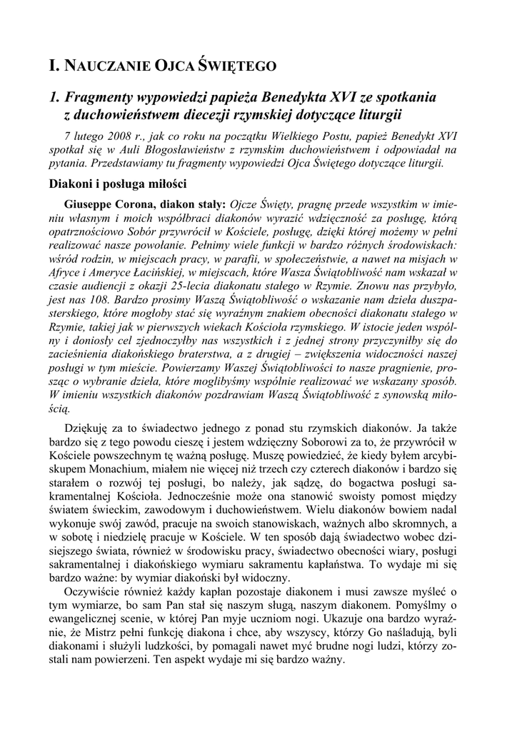 I. NAUCZANIE OJCA ŚWIĘTEGO 1. Fragmenty wypowiedzi papieża Benedykta XVI ze spotkania z duchowieństwem diecezji rzymskiej dotyczące liturgii 7 lutego 2008 r., jak co roku na początku Wielkiego Postu, papież Benedykt XVI spotkał się w Auli Błogosławieństw z rzymskim duchowieństwem i odpowiadał na pytania. Przedstawiamy tu fragmenty wypowiedzi Ojca Świętego dotyczące liturgii. Diakoni i posługa miłości Giuseppe Corona, diakon stały: Ojcze Święty, pragnę przede wszystkim w imieniu własnym i moich współbraci diakonów wyrazić wdzięczność za posługę, którą opatrznościowo Sobór przywrócił w Kościele, posługę, dzięki której możemy w pełni realizować nasze powołanie. Pełnimy wiele funkcji w bardzo różnych środowiskach: wśród rodzin, w miejscach pracy, w parafii, w społeczeństwie, a nawet na misjach w Afryce i Ameryce Łacińskiej, w miejscach, które Wasza Świątobliwość nam wskazał w czasie audiencji z okazji 25-lecia diakonatu stałego w Rzymie. Znowu nas przybyło, jest nas 108. Bardzo prosimy Waszą Świątobliwość o wskazanie nam dzieła duszpasterskiego, które mogłoby stać się wyraźnym znakiem obecności diakonatu stałego w Rzymie, takiej jak w pierwszych wiekach Kościoła rzymskiego. W istocie jeden wspólny i doniosły cel zjednoczyłby nas wszystkich i z jednej strony przyczyniłby się do zacieśnienia diakońskiego braterstwa, a z drugiej – zwiększenia widoczności naszej posługi w tym mieście. Powierzamy Waszej Świątobliwości to nasze pragnienie, prosząc o wybranie dzieła, które moglibyśmy wspólnie realizować we wskazany sposób. W imieniu wszystkich diakonów pozdrawiam Waszą Świątobliwość z synowską miłością. Dziękuję za to świadectwo jednego z ponad stu rzymskich diakonów. Ja także bardzo się z tego powodu cieszę i jestem wdzięczny Soborowi za to, że przywrócił w Kościele powszechnym tę ważną posługę. Muszę powiedzieć, że kiedy byłem arcybiskupem Monachium, miałem nie więcej niż trzech czy czterech diakonów i bardzo się starałem o rozwój tej posługi, bo należy, jak sądzę, do bogactwa posługi sakramentalnej Kościoła. Jednocześnie może ona stanowić swoisty pomost między światem świeckim, zawodowym i duchowieństwem. Wielu diakonów bowiem nadal wykonuje swój zawód, pracuje na swoich stanowiskach, ważnych albo skromnych, a w sobotę i niedzielę pracuje w Kościele. W ten sposób dają świadectwo wobec dzisiejszego świata, również w środowisku pracy, świadectwo obecności wiary, posługi sakramentalnej i diakońskiego wymiaru sakramentu kapłaństwa. To wydaje mi się bardzo ważne: by wymiar diakoński był widoczny. Oczywiście również każdy kapłan pozostaje diakonem i musi zawsze myśleć o tym wymiarze, bo sam Pan stał się naszym sługą, naszym diakonem. Pomyślmy o ewangelicznej scenie, w której Pan myje uczniom nogi. Ukazuje ona bardzo wyraźnie, że Mistrz pełni funkcję diakona i chce, aby wszyscy, którzy Go naśladują, byli diakonami i służyli ludzkości, by pomagali nawet myć brudne nogi ludzi, którzy zostali nam powierzeni. Ten aspekt wydaje mi się bardzo ważny. 6 Nauczanie Ojca Świętego Przy tej okazji przypomniał mi się pewien epizod – choć nie jest bezpośrednio związany z tym tematem – o którym wspomina Paweł VI. Podczas Soboru codziennie odbywała się intronizacja Ewangelii. Papież powiedział ceremoniarzom, że pewnego dnia on sam chciałby dokonać tej intronizacji Ewangelii. Odpowiedziano mu: nie, to należy do zadań diakona, a nie papieża czy biskupów. On zaś zapisał w swoim dzienniku: ale przecież ja także jestem diakonem, pozostaję diakonem i chcę także pełnić tę posługę diakonatu i intronizować Słowo Boże. A zatem dotyczy to nas wszystkich. Kapłani pozostają diakonami, a diakoni wyrażają w Kościele i w świecie ten diakoński wymiar naszej posługi. Owa liturgiczna intronizacja Słowa Bożego, która odbywała się codziennie podczas Soboru, zawsze była dla nas gestem bardzo doniosłym – pokazywała nam, kto jest prawdziwym Panem tego zgromadzenia, pokazywała nam, że na tronie jest Słowo Boże, a my pełnimy posługę polegającą na słuchaniu, interpretowaniu i przekazywaniu innym tego właśnie słowa. Jest to bardzo ważne we wszystkim, co robimy: intronizować w świecie Słowo Boże, Słowo żywe, Chrystusa. Aby to rzeczywiście On kierował naszym życiem osobistym i naszym życiem w parafiach. Zadał mi diakon pytanie – muszę przyznać – ponad moje siły: co powinno być specyficznym zadaniem diakonów w Rzymie? Wiem, że kardynał wikariusz o wiele lepiej niż ja zna rzeczywistą sytuację w mieście, we wspólnocie diecezji rzymskiej. Myślę, że charakterystyczną cechą diakonatu jest właśnie wielka różnorodność posług. Kilka lat temu, gdy byłem członkiem Międzynarodowej Komisji Teologicznej, poświęciliśmy wiele czasu refleksji nad diakonatem w historii Kościoła i we współczesnym Kościele. I odkryliśmy, że nie istnieje jeden wzorzec. To, co powinni robić diakoni, zależy od ich osobistego przygotowania, od sytuacji, w jakiej się znajdują. Konkretne sposoby realizacji tej posługi mogą być bardzo różne, ale oczywiście jest ona zawsze pełniona w komunii z biskupem i z parafią. W różnych sytuacjach pojawiają się różne możliwości. Zależy to również od kwalifikacji zawodowych diakonów: mogą pracować w sektorze kultury, dziś tak istotnym, albo mogą być obecni i pełnić ważną rolę w sektorze edukacji. W tym roku myślimy właśnie o edukacji jako kluczowej kwestii, od której zależy nasza przyszłość, przyszłość ludzkości. Oczywiście, w Rzymie najdłuższą tradycję ma sektor charytatywny, bo parafie i diakonie były ośrodkami chrześcijańskiej dobroczynności. W Rzymie od samego początku był to sektor podstawowy. W encyklice Deus caritas est ukazałem, że nie tylko głoszenie i liturgia 